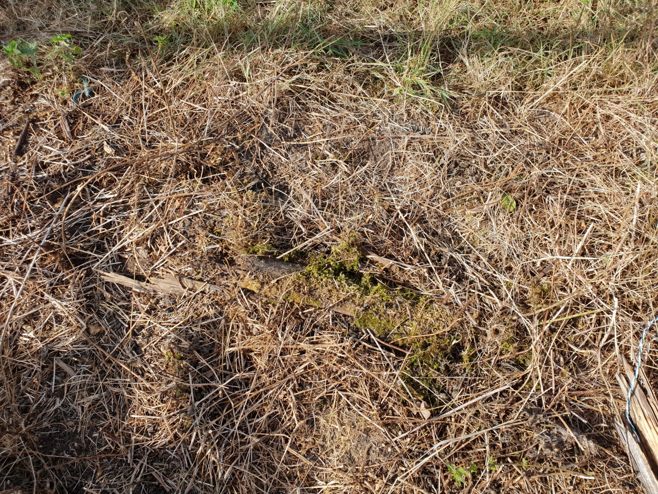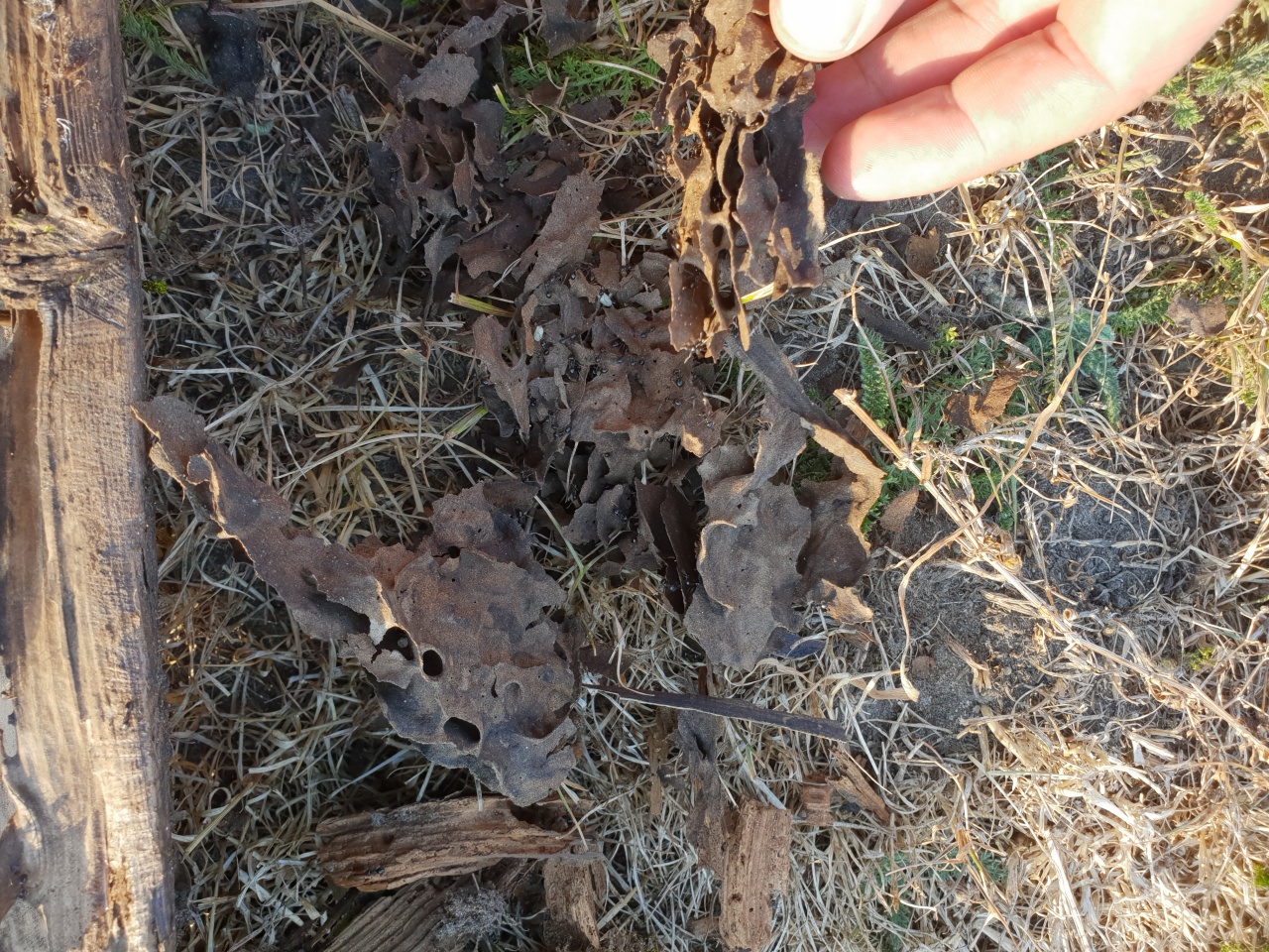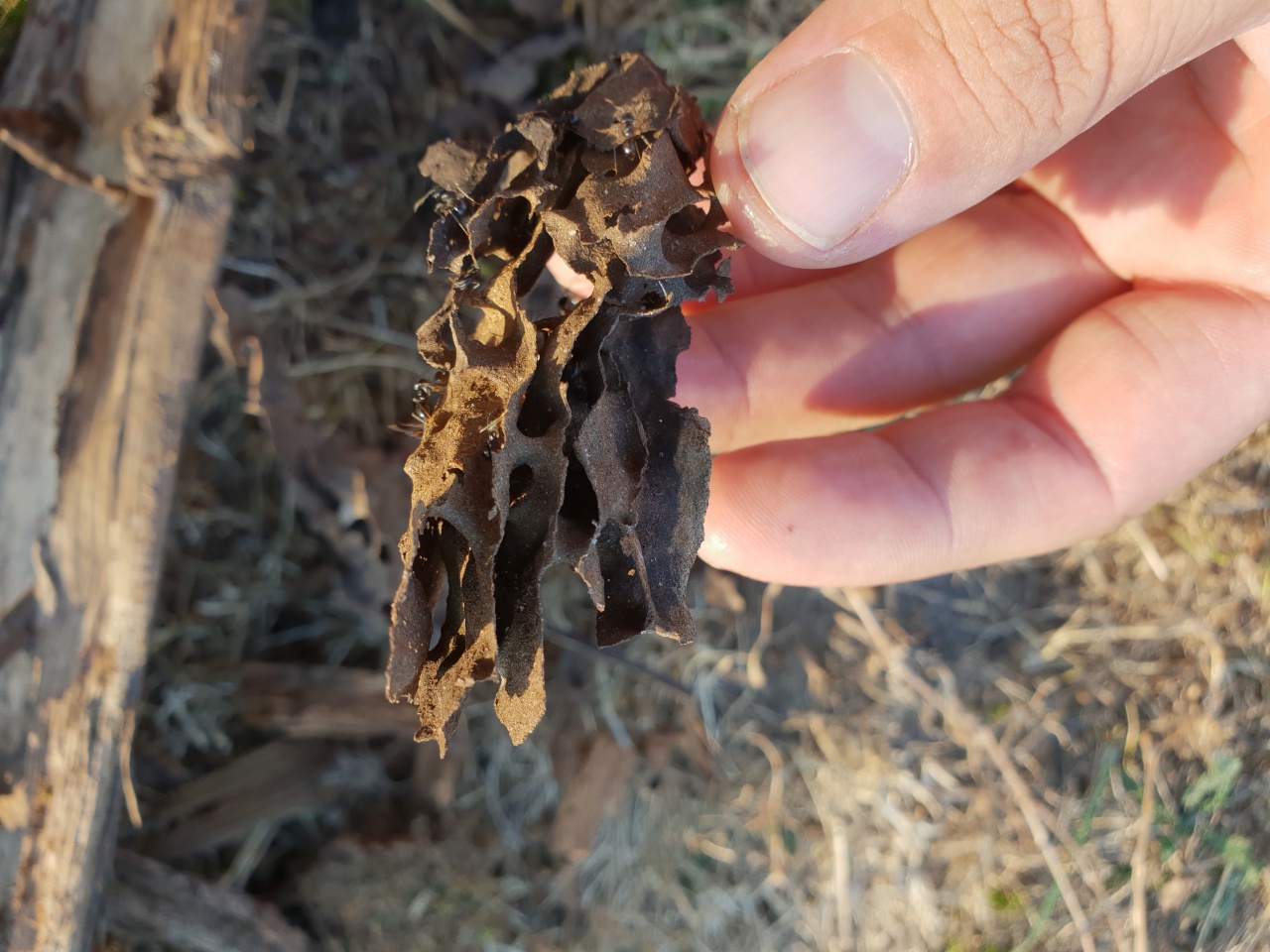 Nachdem ich mir also den Durchgang freigemacht hatte, kam die Sense zum Einsatz. Als der Bereich einigermaĂen frei war, bemerkte ich das groĂe Gewusel am Boden. Es war den Tag sehr heiĂ gewesen, ich wollte fertig werden und habe zuerst gar nicht darauf geachtet, welche Art ich da aufgeschreckt hatte. War auch nicht das erste Mal, dass ich eine Kolonie ungewollt ausgegraben habe. Jedenfalls hatte ich erst beim aufrĂ€umen bemerkt, dass ein Holz halb ausgehöhlt da lag und daneben StĂŒcke vom einem Kartonnest waren. Jetzt war mein Interesse dann doch geweckt und ich hatte ein paar Fotos gemacht.