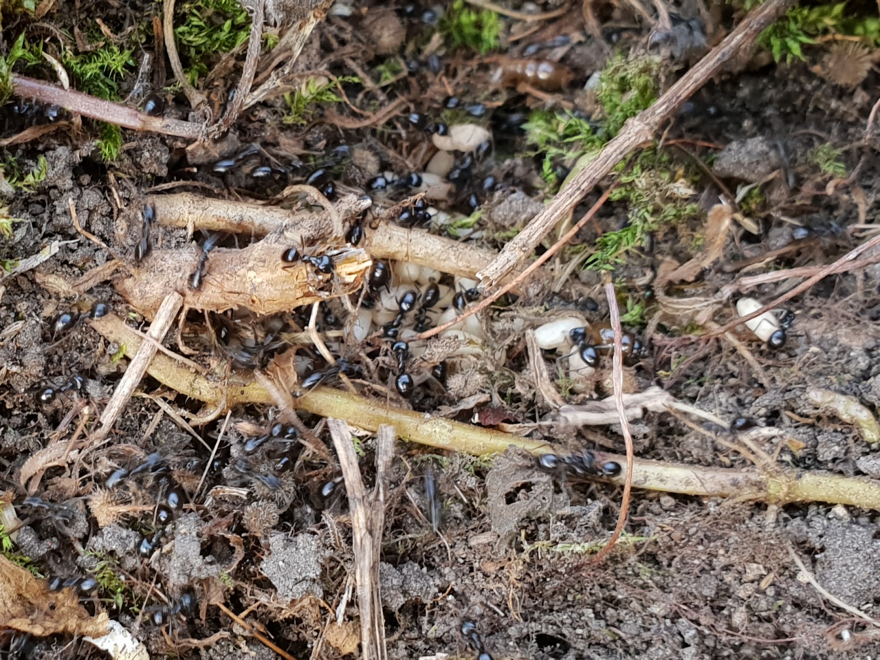 Ein paar Tage spĂ€ter habe ich mir die Stelle nochmal genauer angesehen und siehe da, die Kolonie ist noch vor Ort. Einen altes HolzstĂŒck (vermutlich sogar das, indem der GroĂteil der Kolonie lebt) hatte ich, zum GlĂŒck fĂŒr das Volk, ĂŒbersehen. Ich bemerkte einzelne Arbeiterinnen und legte eine Seite frei. Zu meiner Ăberraschung kam direkt die