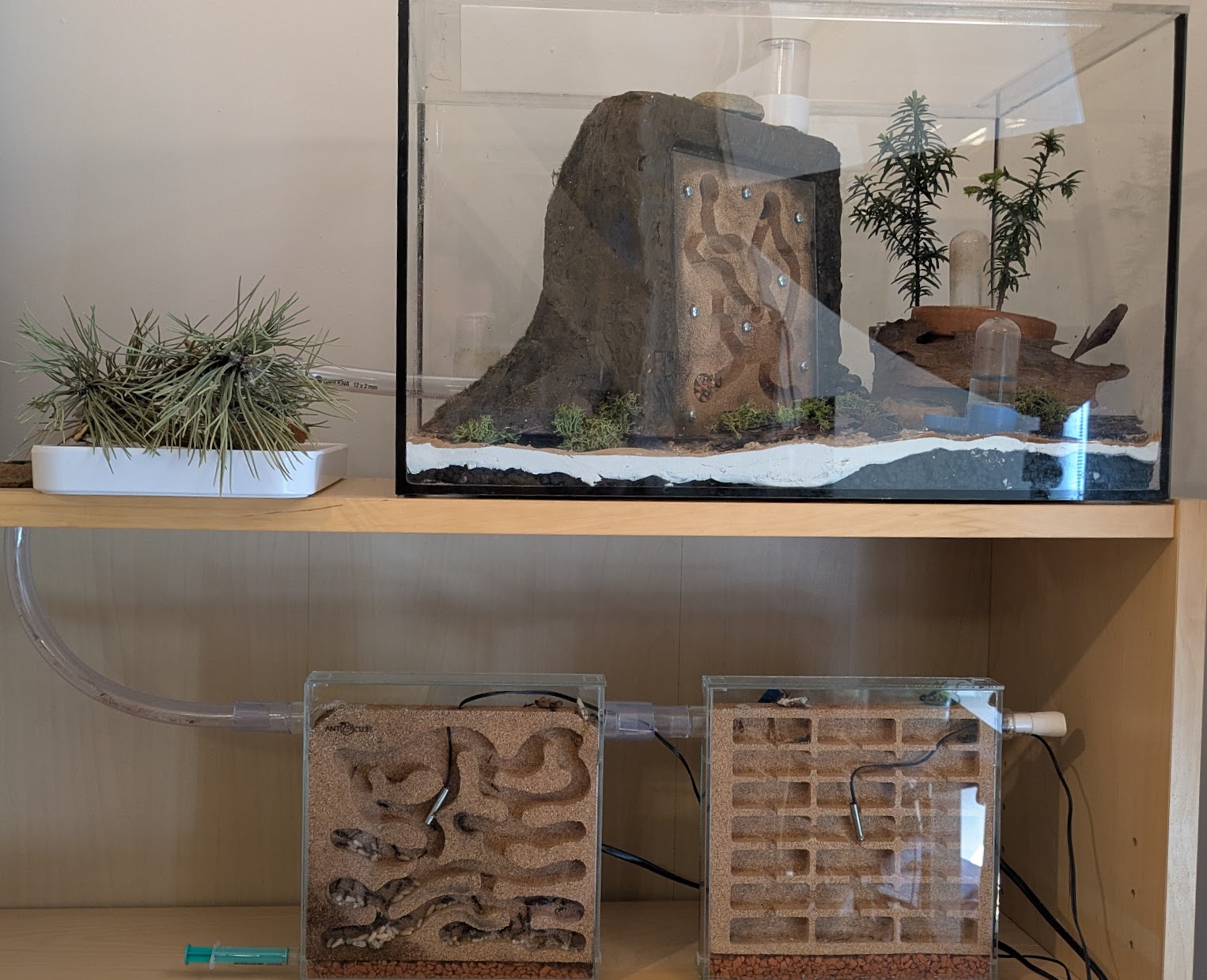 Drei Korknester stehen zur VerfĂŒgung. Es gibt WĂ€rme und Feuchte Gradienten von 90%-50% Luftfeuchte und Zimmertemperatur bis 28° WĂ€rme, gekreuzt mit Luftfeuchte. Gemessen ĂŒber vier FĂŒhler und Thermostat gesteuert (die WĂ€rme). Feuchtigkeit kommt von unten durch Wasser in den Korknestern. GefĂŒttert wird allerlei Getier (tĂ€glich) Schaben, Heimchen, Fliegen alles eingefroren. Als FlĂŒssigkeiten stehen ZuckerrĂŒbensirup, Industriezucker 2/3 Lösung in Wasser und frisches Wasser zur VerfĂŒgung.