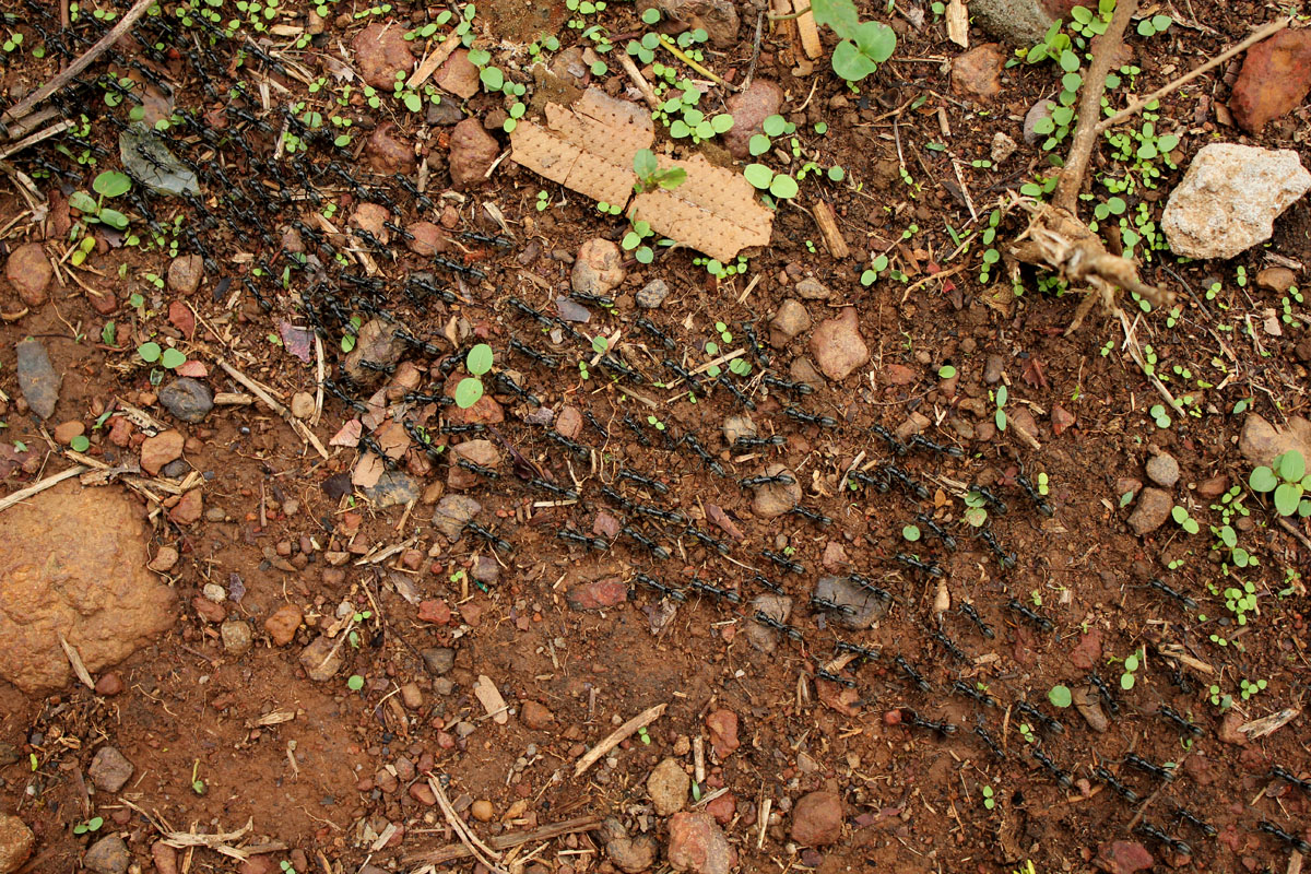 Im offenen Buschland Guineas (Westafrika) kamen uns morgens um etwa 9Uhr auf einem FuĂpfad eine ca. 3m lange Prozession von ca. 1cm langen Ameisen entgegen (Foto A1, A2).