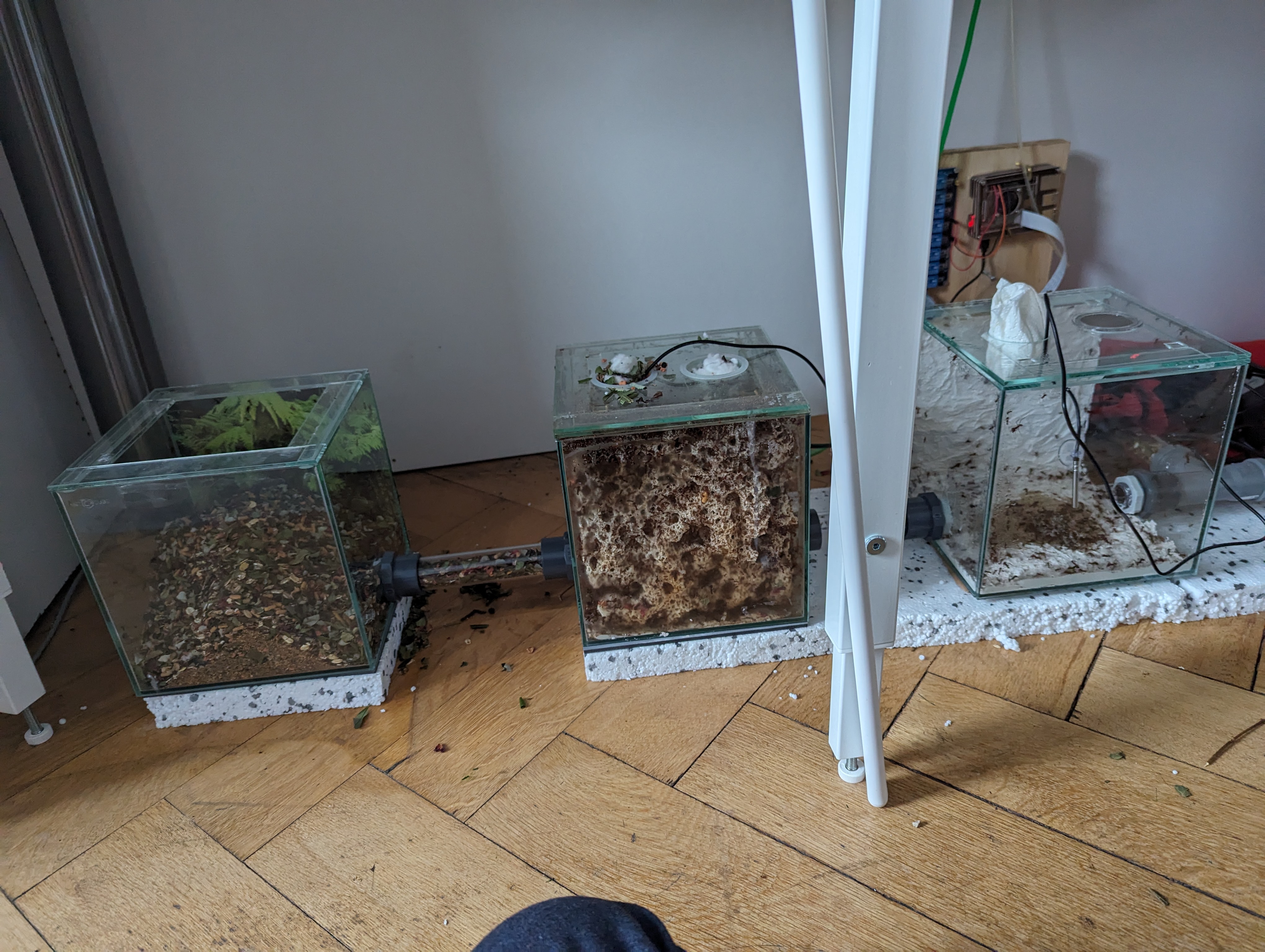Ich hatte eine neues Becken an mein Setup gehängt und als Pilzkammer eingeplant. Zwischen diesem Becken und der bestehenden Pilzkammer ist ein weiteres Becken, welches zur Außenwelt führt. Leider wurde das Becken nicht angenommen. Ich werde jetzt ein weiteres Becken direkt neben die Pilzkammer setzen.