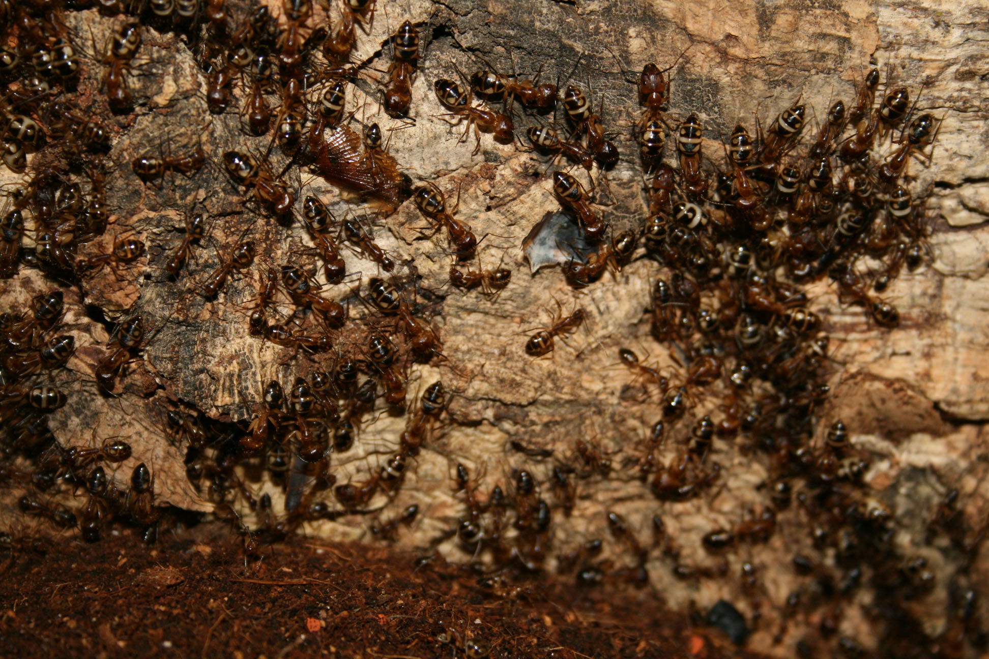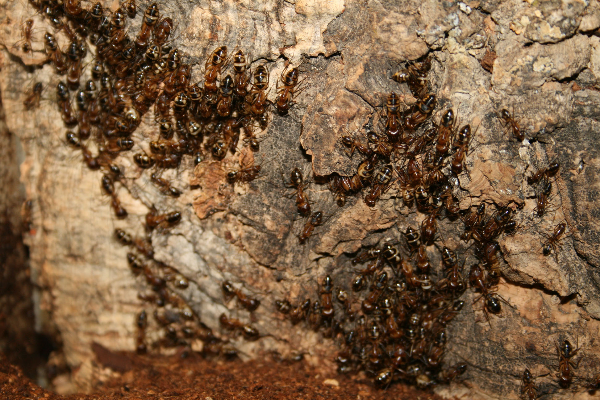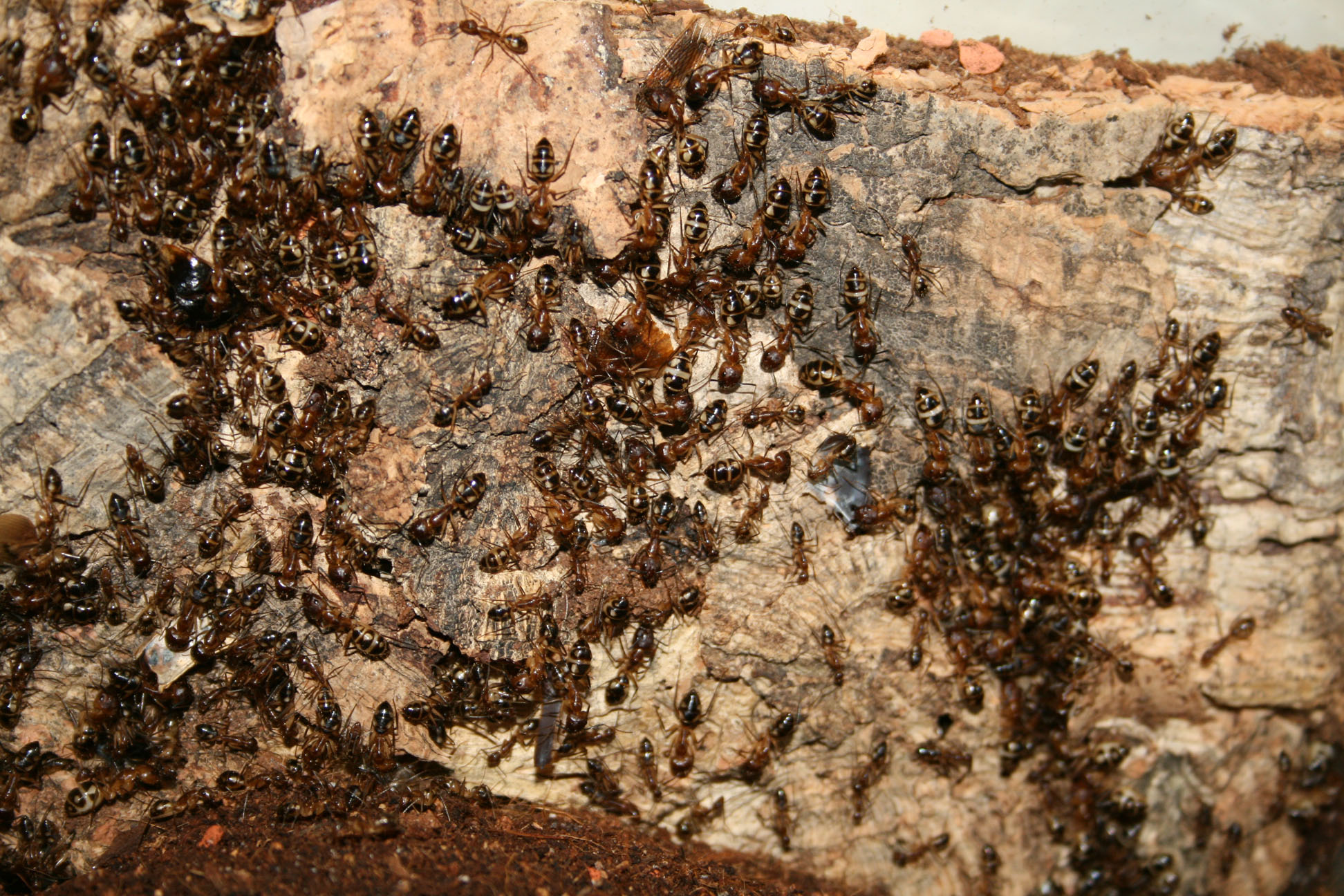 Kannst mal meine Camponotus substitutus besichtigen. Ich spiele mittlerweile stark mit dem Gedanken die Kolonie zu verkaufen. Macht bei der momentanen Koloniegröße wirklich keinen Spass mehr. Man kann praktisch nichts mehr am Becken machen ohne gleich zig Majore in der Hand hängen zu haben. Paraffinöl kann ich mittlerweile alle 3 Tage neu draufmachen weil die Dreck dran kleben. Sie "satt" zu bekommen hab ich seit Wochen nicht mehr geschafft. Sie nehmen praktisch alles außeinander. Einrichtung ist mittlerweile komplett kaputt oder eingegraben. Mit neuen Becken kom ich auch nicht nach. Wenn ich ins Becken schaue sieht das ähnlich einem Bienennest aus. Hunderte Ameisen die schön aufgereiht dasitzen und auf ihren Einsatz warten. Selbst Polyrhachis dives warn da stressfreier zu halten :/