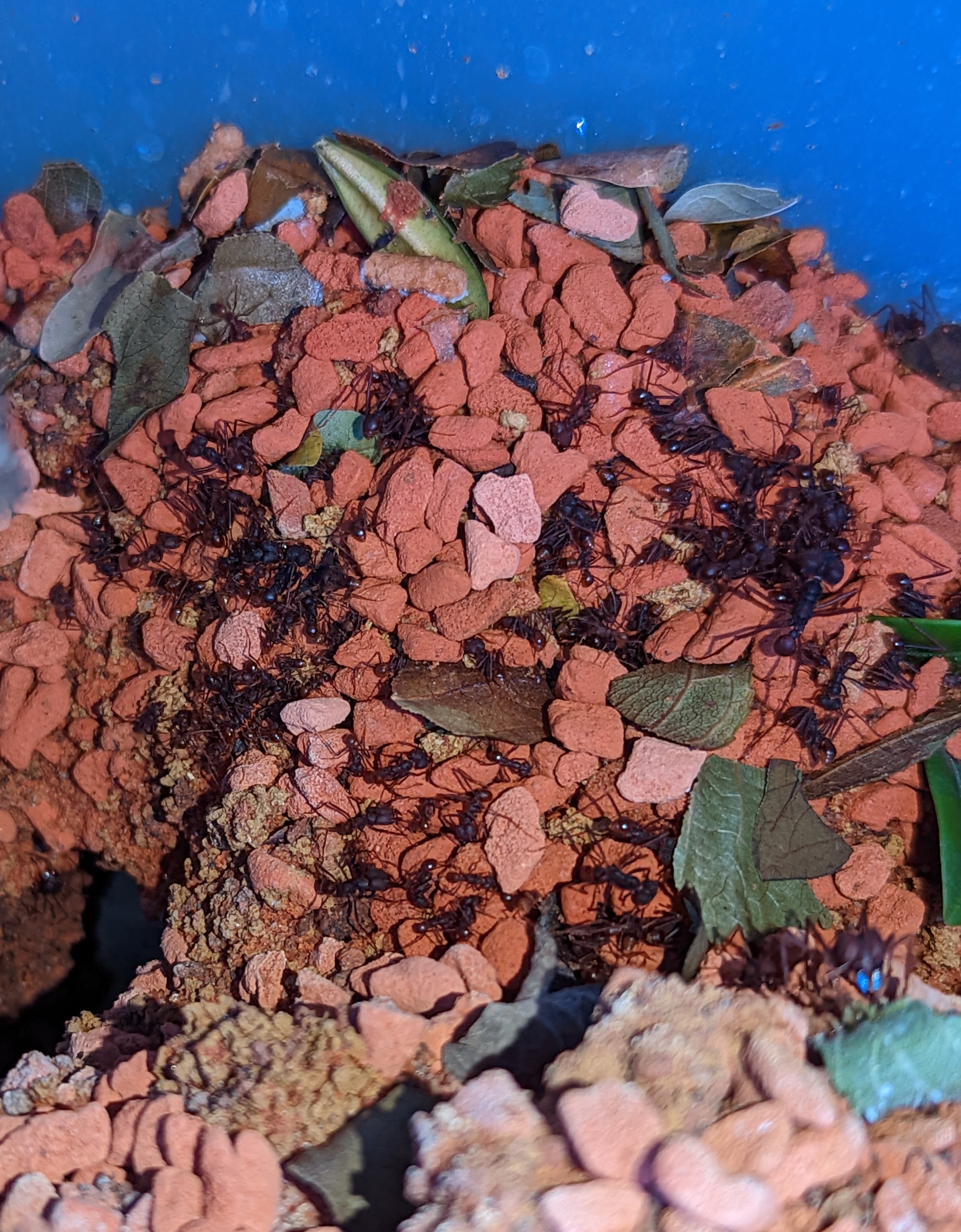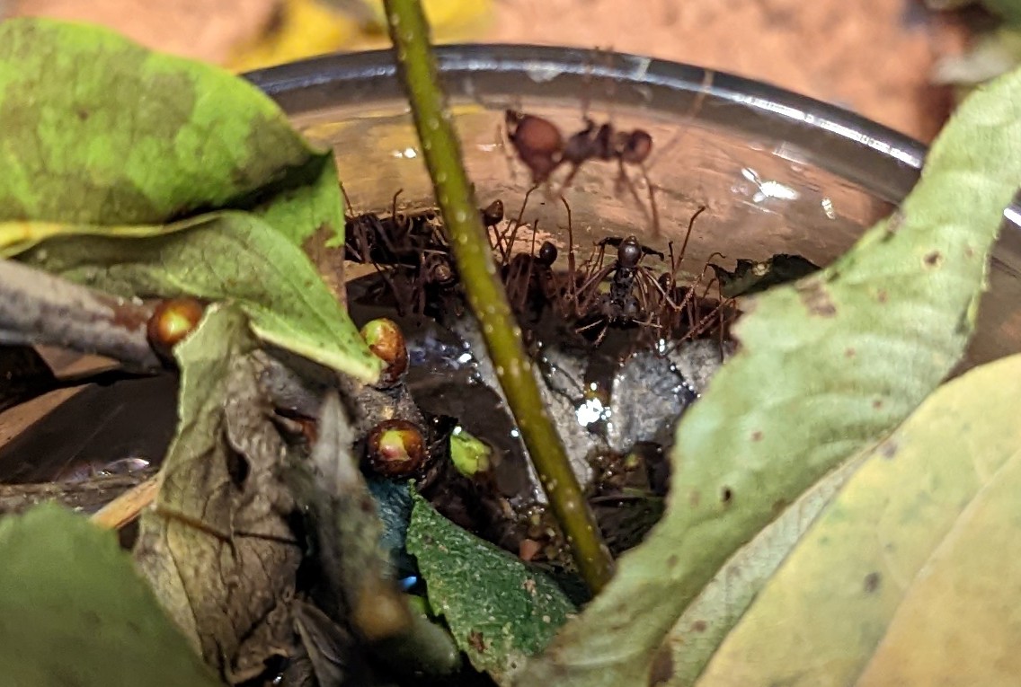 Ich biete den Atta Blätter meist in einer Vase an. Heute wollen sie aber nicht die Blätter sondern laben sich an einem Bakterienfilm, der sich an der Vaseninnenwand gebildet hat.