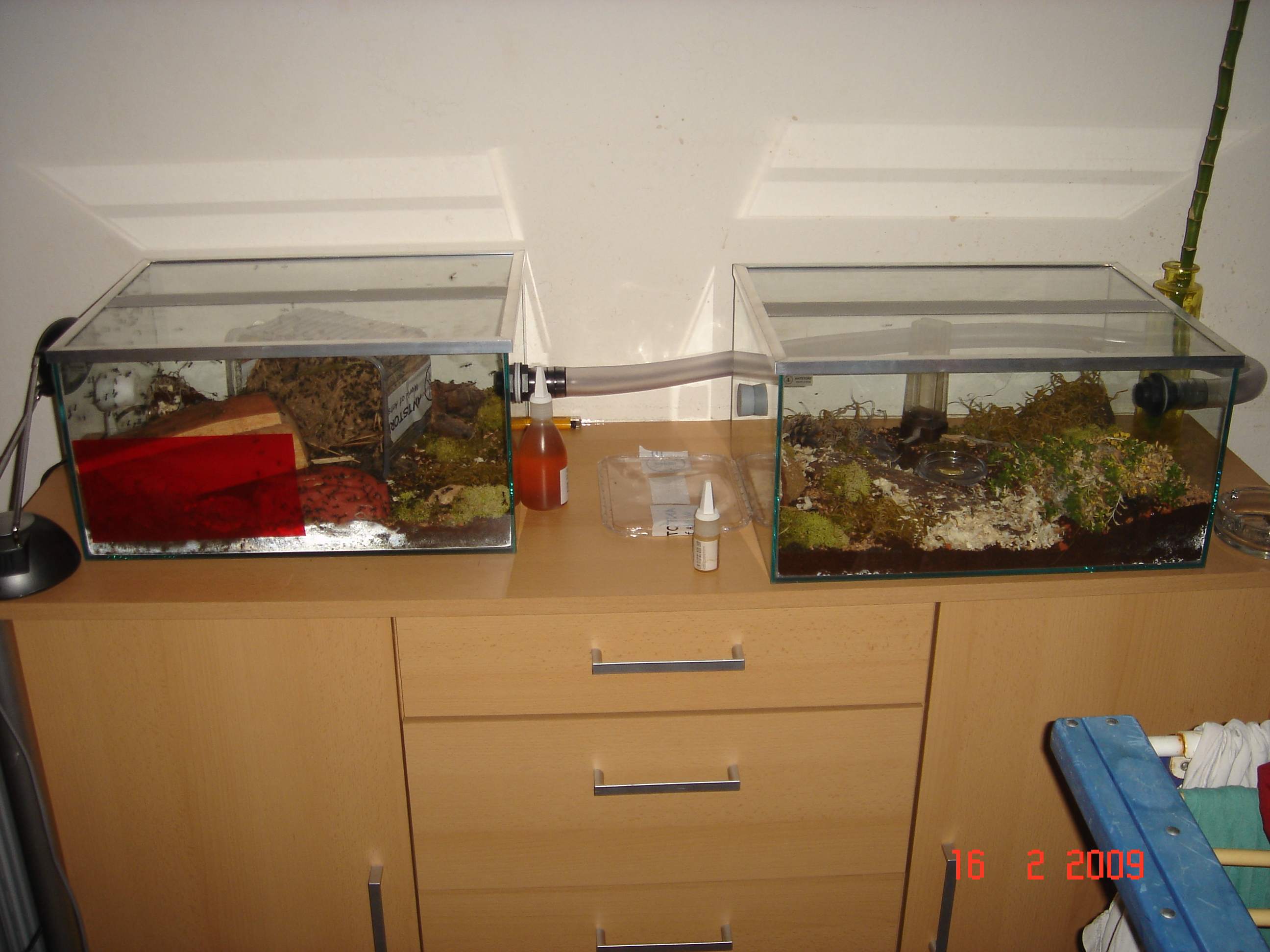 Der Verbindungsschlauch hat ca. 1m! Im Nestbecken benutze ich einen Heizstein, der Regelt die Temperatur ziemlich optimal =) ...Aja, ich weiĂ jetzt nicht genau ob die Kolonie nicht schon zugroĂ ist fĂŒr das was ich ihnen anbiete?!? Sind ca. 300 Tiere?!?