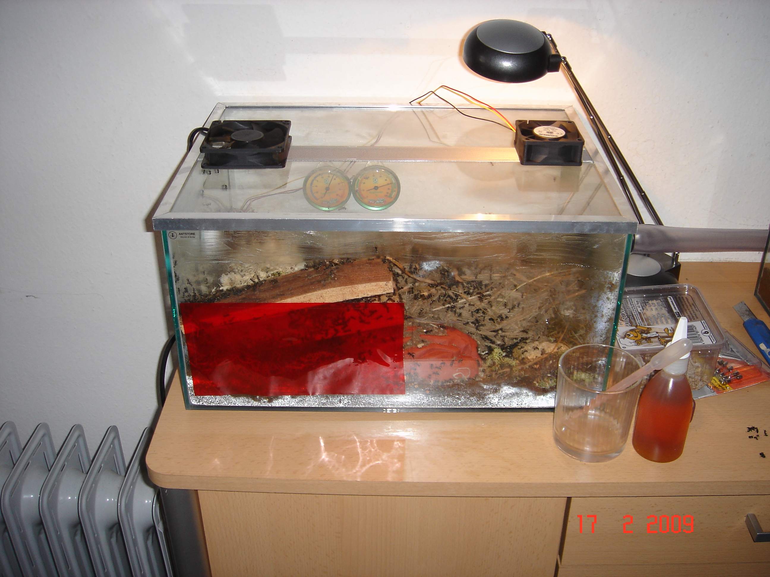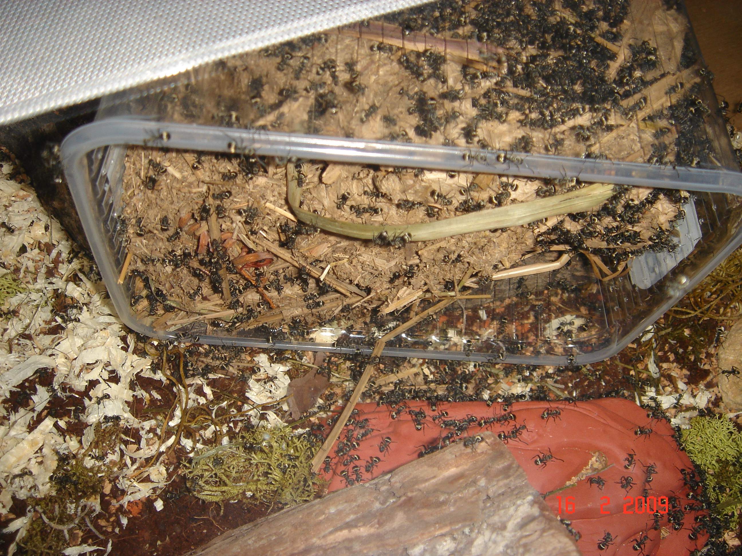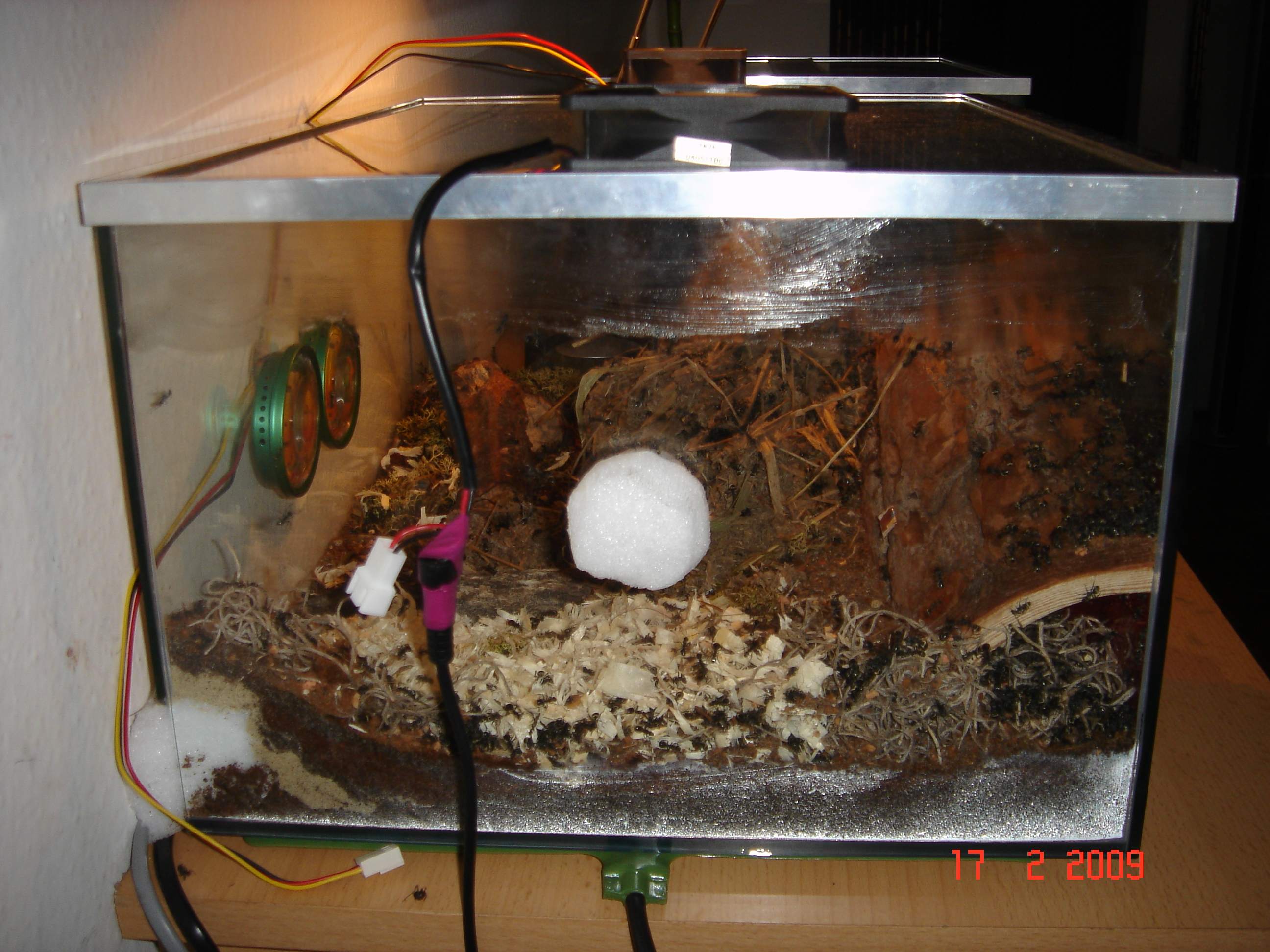 sodala, den trantpotbecher hab ich entfernt und da mir heute frĂŒh aufgefallen ist das ich kondenzwasser im nestbecken hab, hab ich mir 2 pc-lĂŒfter angeschlossen u. lasse sie langsam laufen so das es mir nicht auch die luftfeuchtigkeit runtersetzt! naja, das vaseline hab ich auch mehr aufgetragen u. siehe da, es kommt (fast) keine mehr hoch *:bananadancer:* ... einige arbeiterinnen tragen ihre toten schwestern *denke tranzportleichen* in der gegend rum, was kann ich dagegen machen? einfach lassen? ... hier einige fotos: