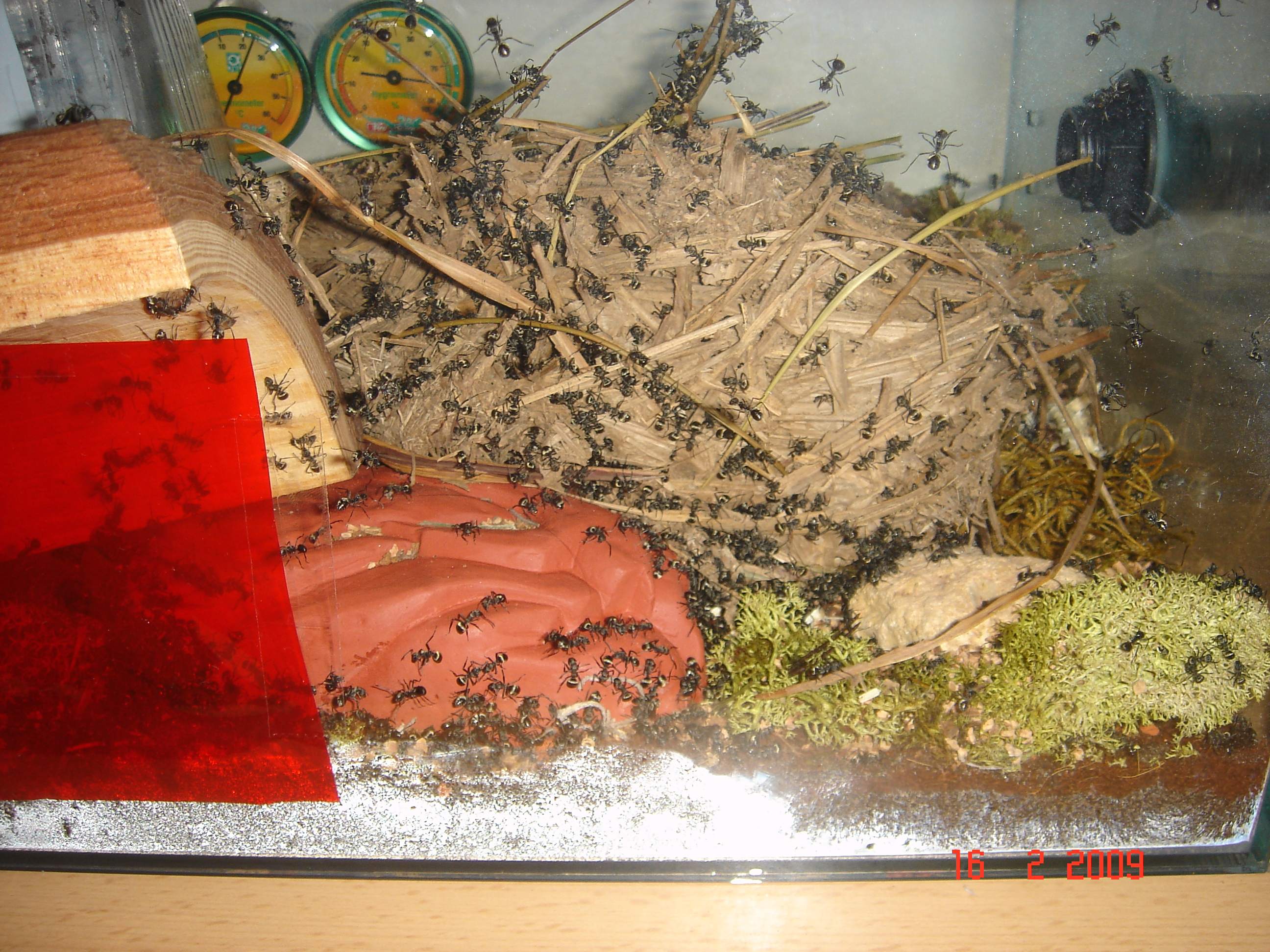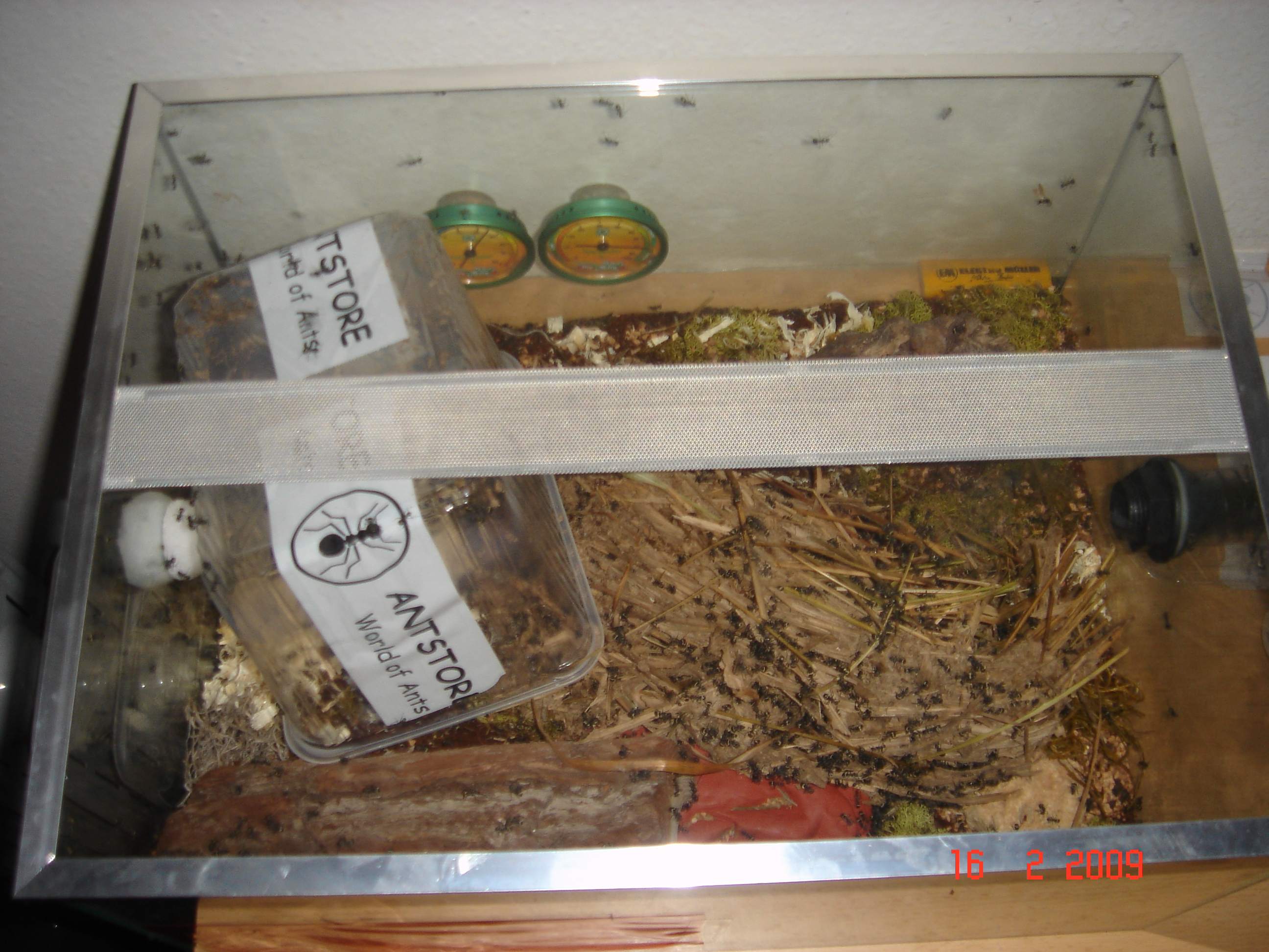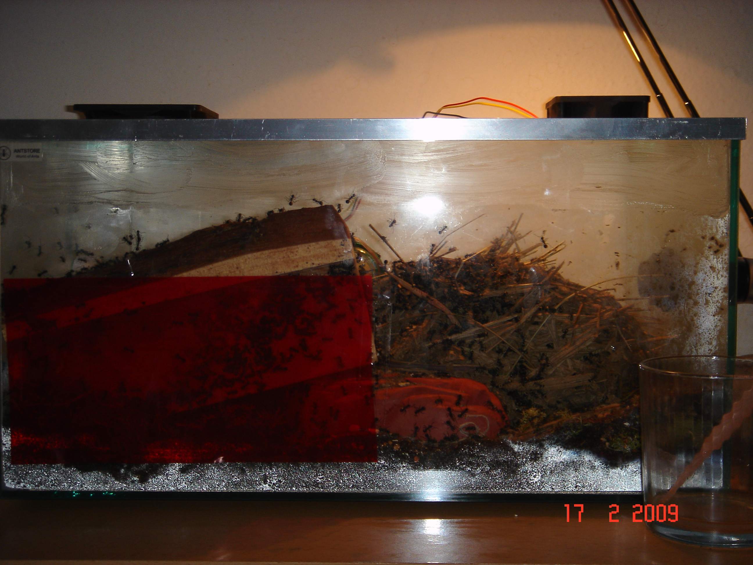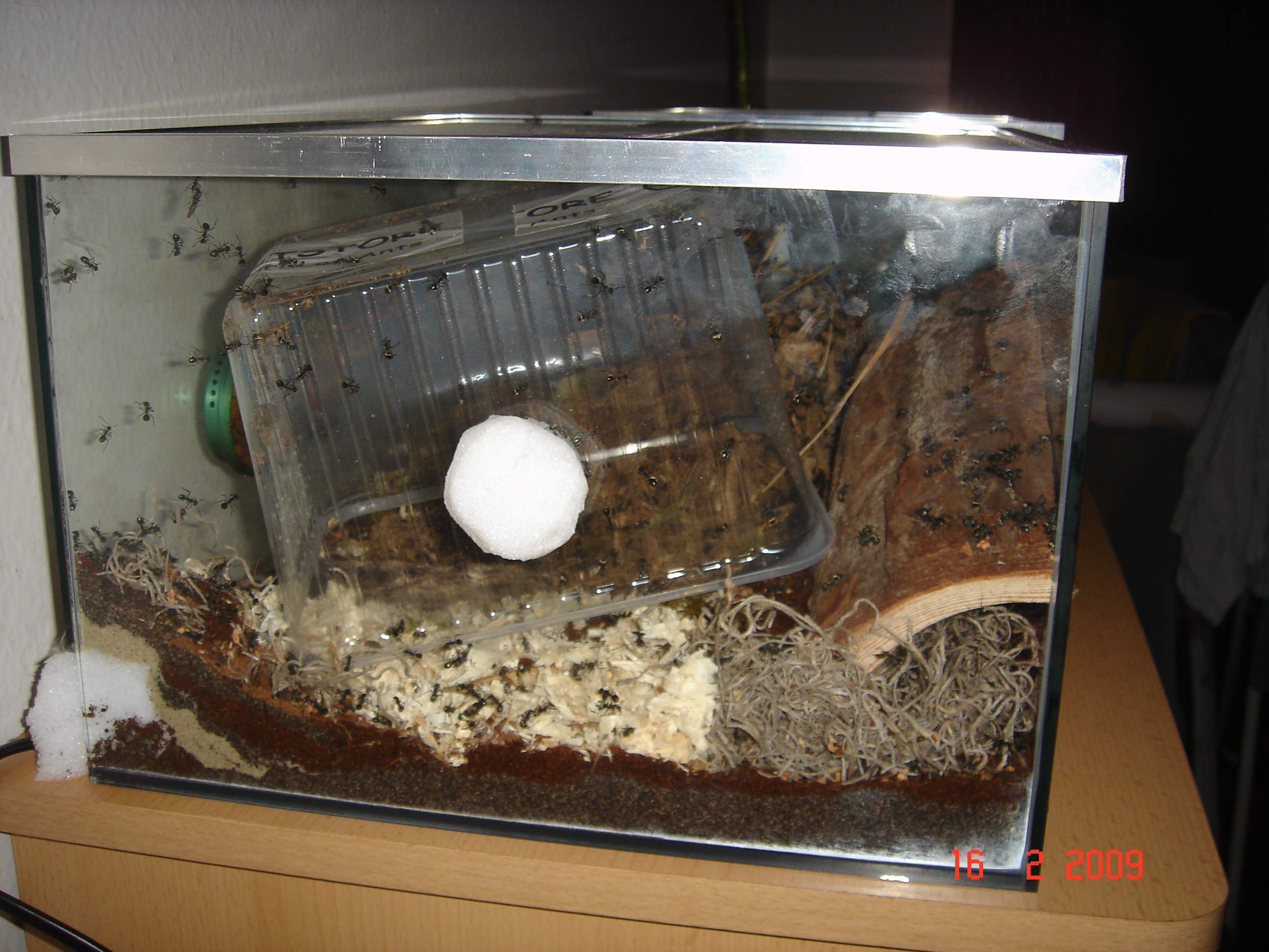 sodala, den trantpotbecher hab ich entfernt und da mir heute frĂŒh aufgefallen ist das ich kondenzwasser im nestbecken hab, hab ich mir 2 pc-lĂŒfter angeschlossen u. lasse sie langsam laufen so das es mir nicht auch die luftfeuchtigkeit runtersetzt! naja, das vaseline hab ich auch mehr aufgetragen u. siehe da, es kommt (fast) keine mehr hoch *:bananadancer:* ... einige arbeiterinnen tragen ihre toten schwestern *denke tranzportleichen* in der gegend rum, was kann ich dagegen machen? einfach lassen? ... hier einige fotos: