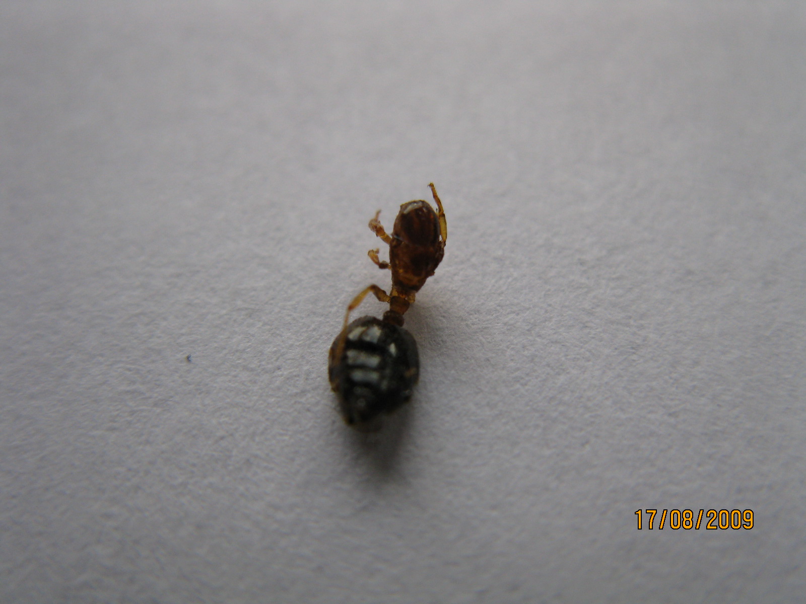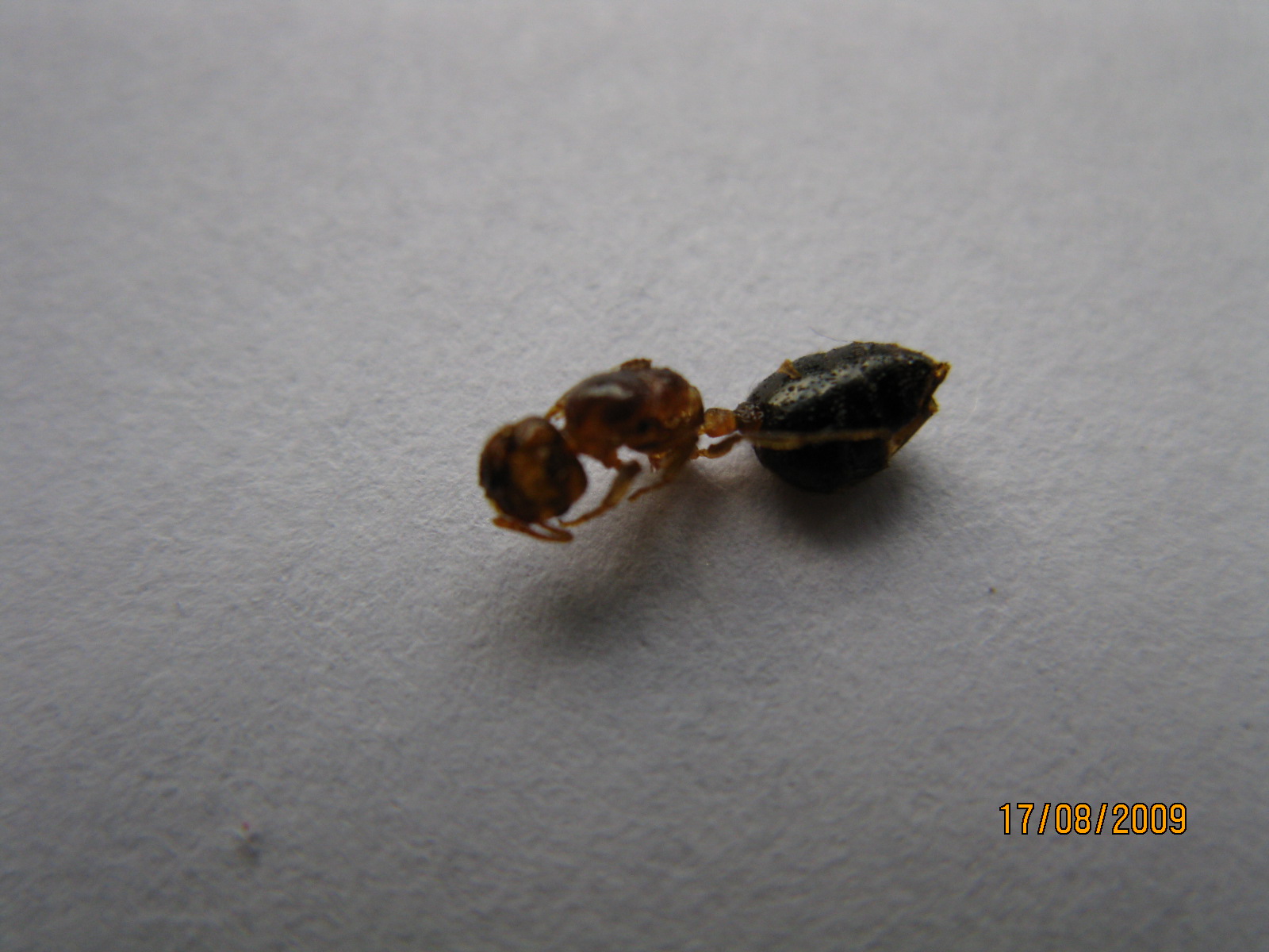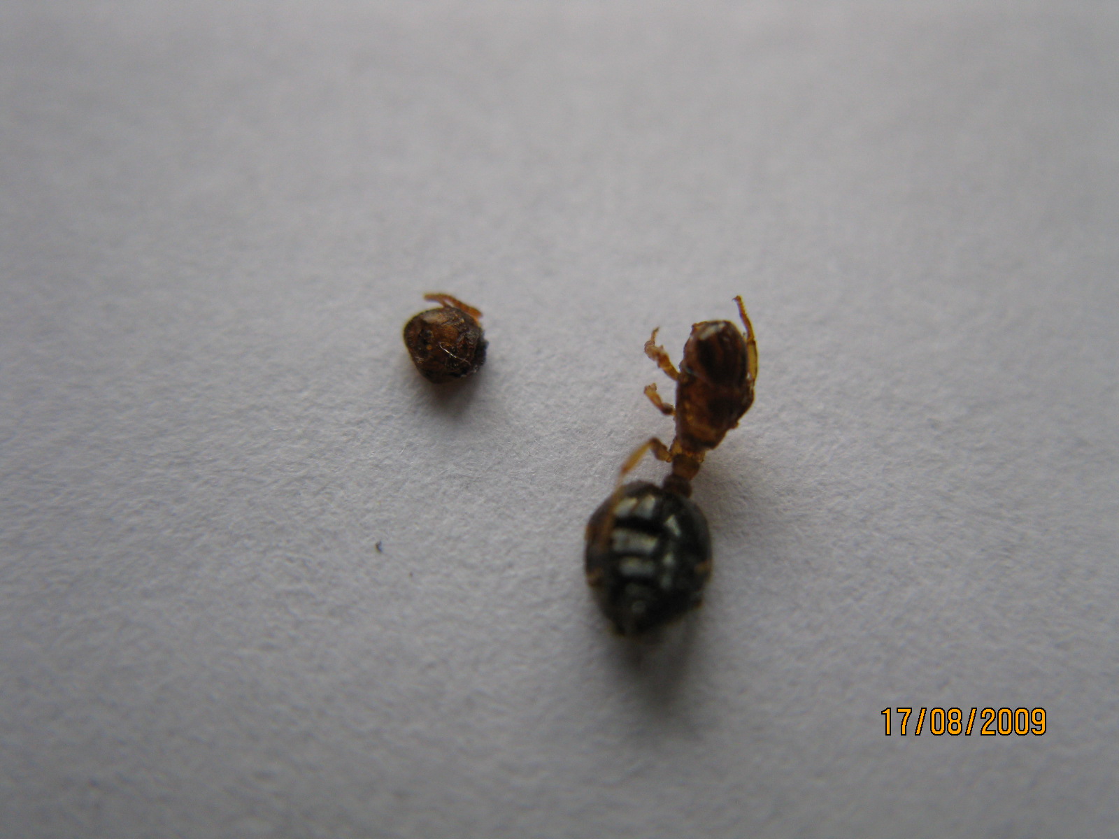 An diesem Beispiel sieht man wieder einmal, welche diversen Wege den Ameisen geboten werden. Und sie kommen lebend an. Meine schien noch gelebt zu haben. Noch ein paar Bilder des toten Tierchens. Ich habe den Kopf abgetrennt, um ihn fotografieren zu können. Deutlich sind die gekeulten Fühlergeisseln zu erkennen. Ebenso wohl der charakteristische Körperbau eines Crematogasterweibchens, spitz zulaufender