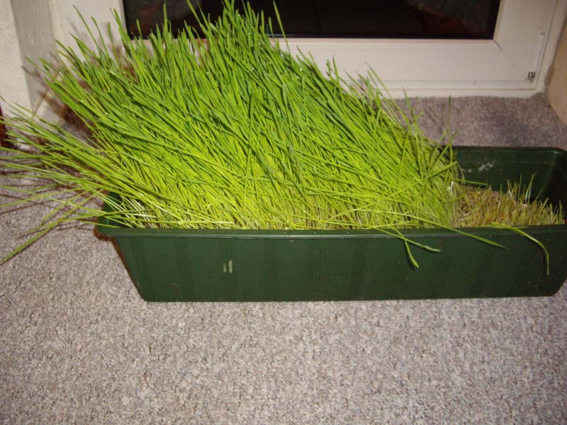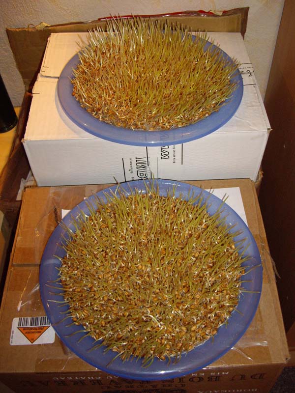 Heute sind 7 Tage vorbei und die Menge der Biomasse ist doch beträchtlich gewachsen. Aus dieser einen Hand voll, eine Schüssel, gefüllt mit Grünfutter.
