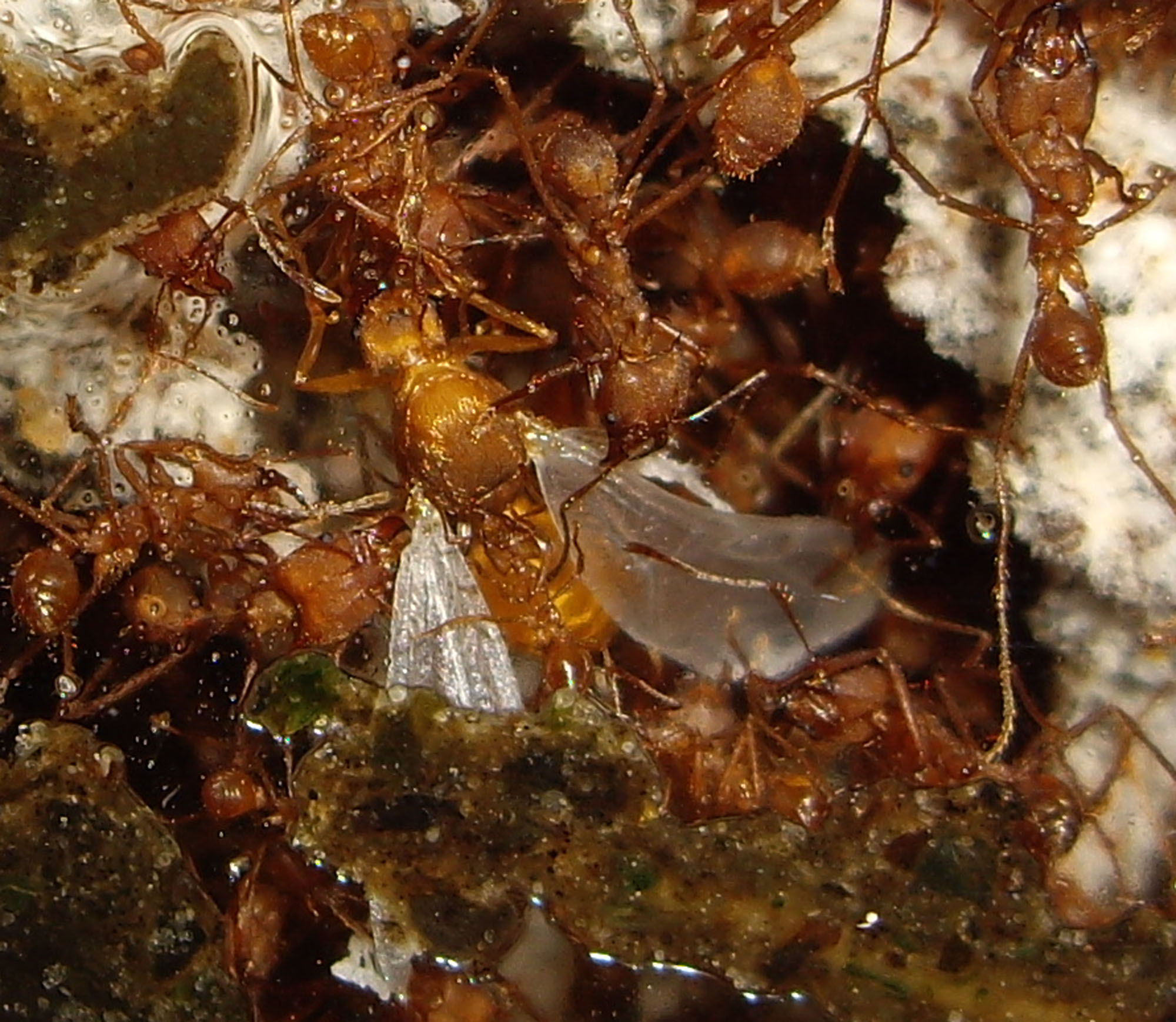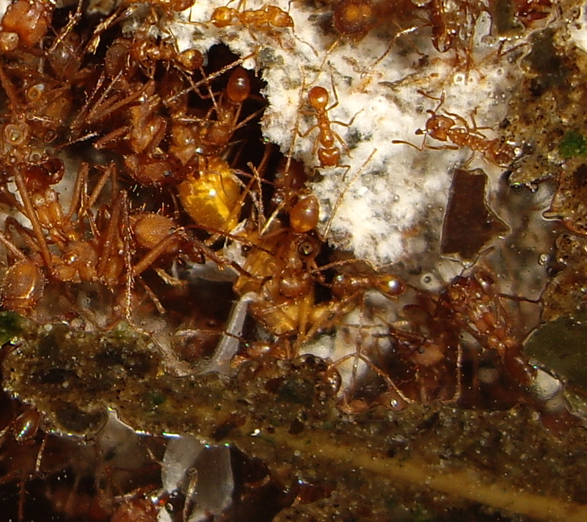 So, ich war mal so frei, das an meiner kleinen, blitzartig wachsenden Acromyrmex crassispinus auszuprobieren. Ich habe ihnen dafĂŒr das Hinterende eines Mehlwurms (~5mm lang) reingelegt. Zuerst wurde es unsicher betastet und vom NesthĂŒgel, wo ich es deponiert hatte, den HĂŒgel runtergeschleift. Auf dem Weg dorthin haben sich gut vier Arbeiterinnen um den Wurm gesammelt und an ihm getrunken, vereinzelt wurden die Mandibeln auf dem Seramis abgestreift. Nach einigen Unsicherheiten ist der Mehlwurm wie die BlĂ€tter huckepack genommen worden und zu einem Zwergpilzgarten gebracht, wo sich noch keine Brut befindet (noch relativ klein und daher ganz gut einsehbar). Dort kam er, genau wie die BlĂ€tter, die zur gleichen Zeit eingetragen wurden, auf den Pilzgarten. Momentan wird er noch durchgekaut (von 5 Arbeiterinnen).