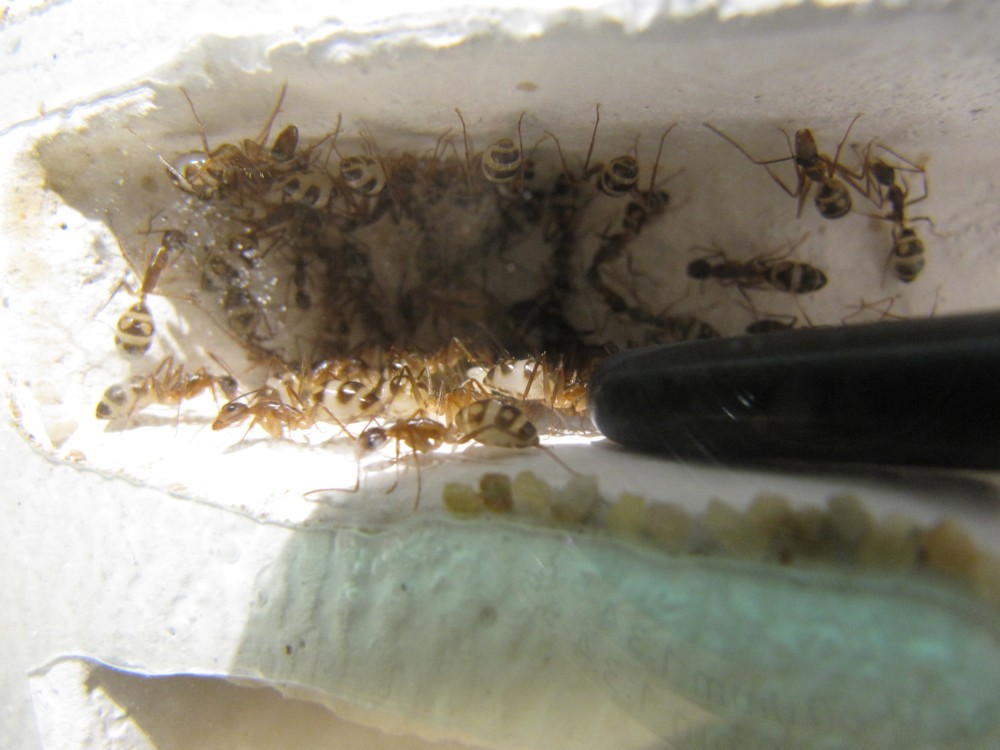 [font="]Jetzt zu meiner eigentlichen Frage. Was fĂŒttert ihr denn euren Camponotus substitutus? Bei mir bekommen sie meistens Heimchen und Wachsmaden. Diese werden dann ĂŒberbrĂŒht und kommen ins Gefrierfach. Bei bedarf werden sie aufgetaut und anschlieĂend gefĂŒttert. Und natĂŒrlich jede Menge Zuckerwasser (brauner Rohrzucker), den fressen sie am liebsten. Das Zuckerwasser wird aber zur Zeit auch nicht mehr so richtig aufgenommen, was zu Anfangs heiĂ begehrt war. Dort war auch immer ein oder mehrere Ameisen zu sehen.[/font]
