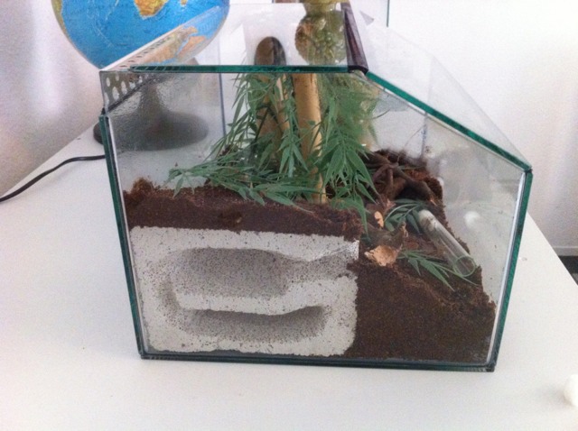 Das Terrarium wird auf meinem Naja naja Terrarium platz finden. Da profitiere ich von der Abwärme. Ich habe die Wahl je nach Position auf dem Terra zwischen 22 und 32 Grad. Ich kann also die Temperatur von Nest und Arena unterschiedlich gestallten.