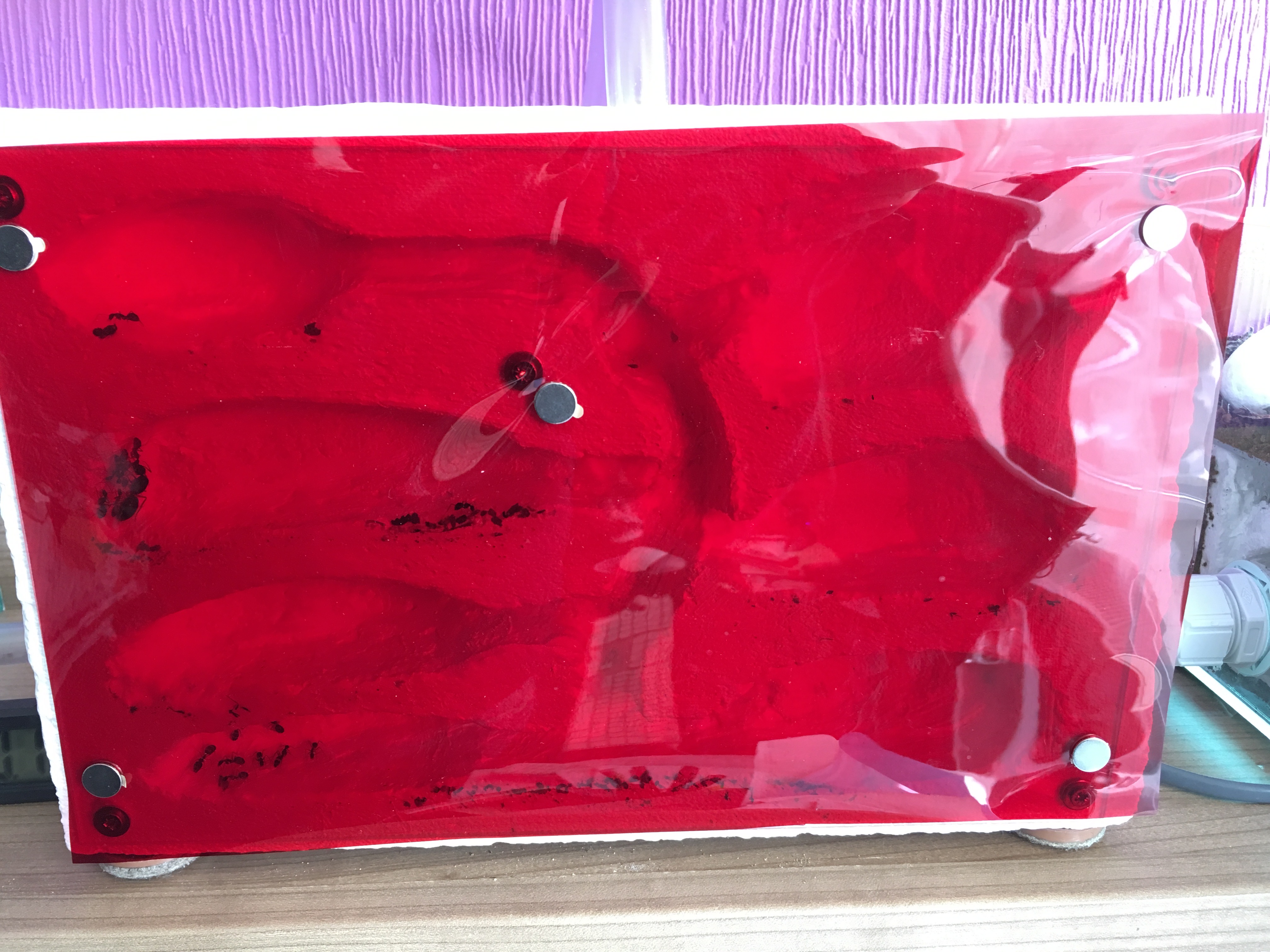 Wenn du versuchen möchtest sie direkt zu beobachten geht das am besten wĂ€hrend der Nacht mit einer Taschenlampe vor die rote Folie geklebt wurde. Die Taschenlampe sollte aber nicht zu hell sein, also kein 24-LED-Flakscheinwerfer und sollte auch nicht direkt auf die Ameisen gerichtet werden (hab meine mit roter Acrylfarbe ĂŒbermalt, mit der geht das, die ist dadurch aber auch sehr schwach was den Leuchtkraft angeht). Wahrscheinlich kommen die Ameisen so in der ersten halben Stunde nachdem es dunkel wurde raus.