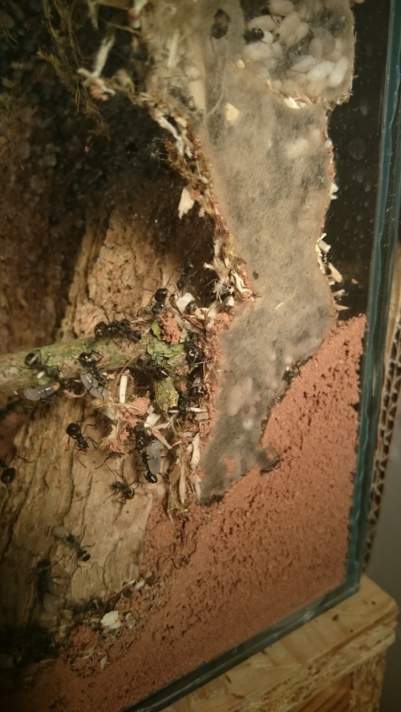 Es handelt sich um ein hohes Formicarium (20x20x40) mit Sand-Lehm-Gemisch. Die Einrichtung besteht aus aufgeschichteten, abgebackenen Rindenstücken und zwei, drei Ästen - das wars schon ;) Auf jeden Fall gibt es viel Lauffläche, was sicherlich nicht unwichtig bei dieser Art ist.