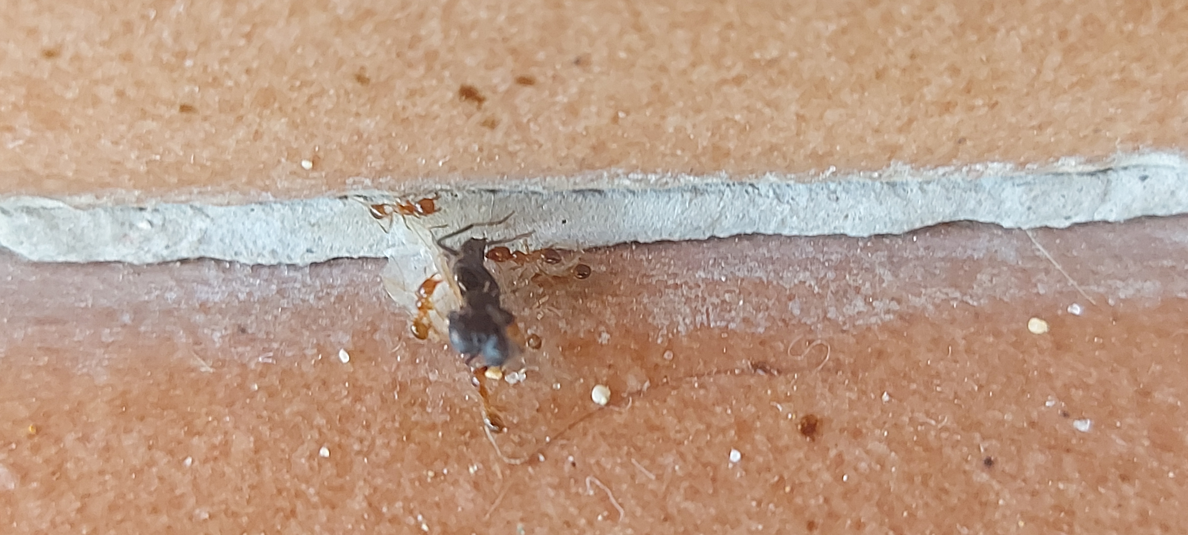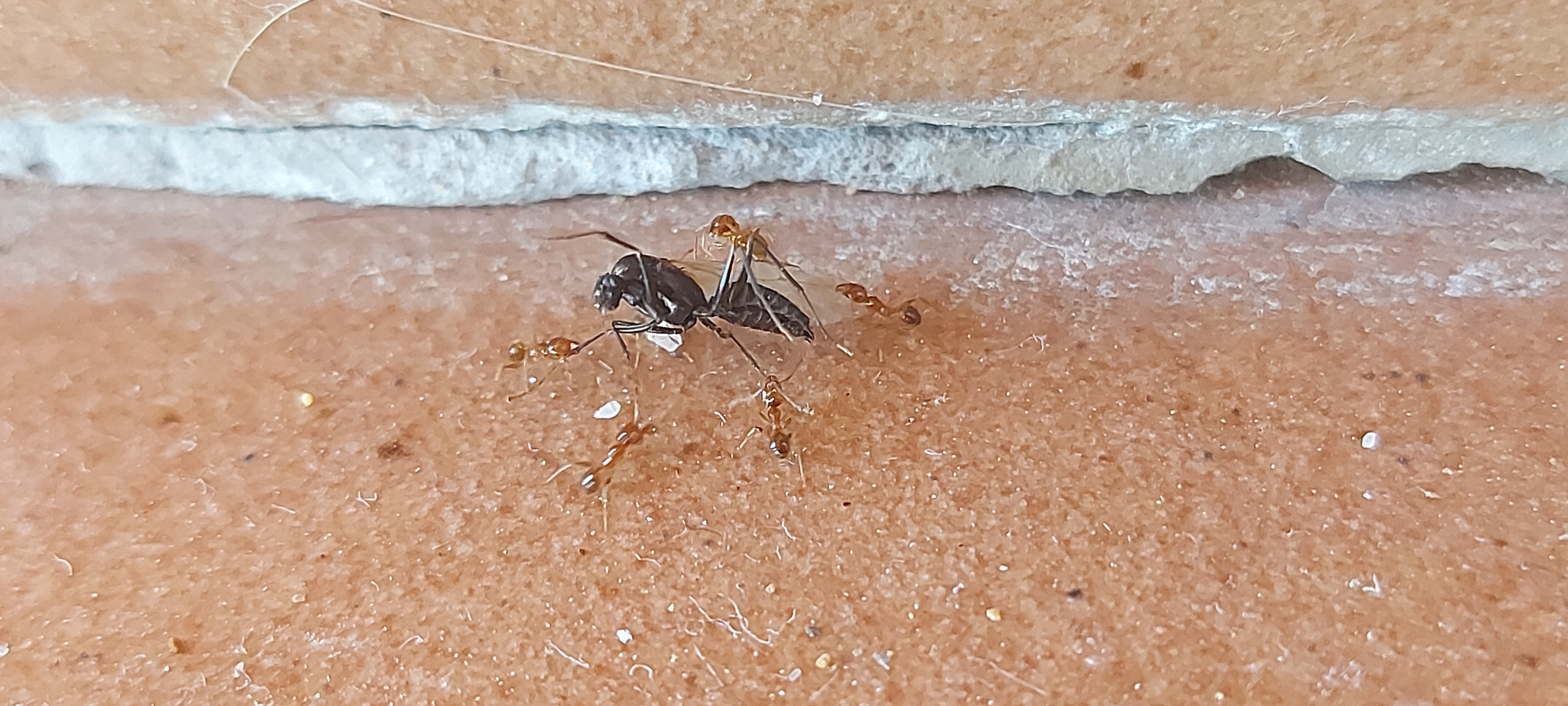 Ein paar (Themnothorax würde ich sagen) Arbeiterinnen haben ein Männchen oder eine Königinn gefangen und ins Nest gezogen.