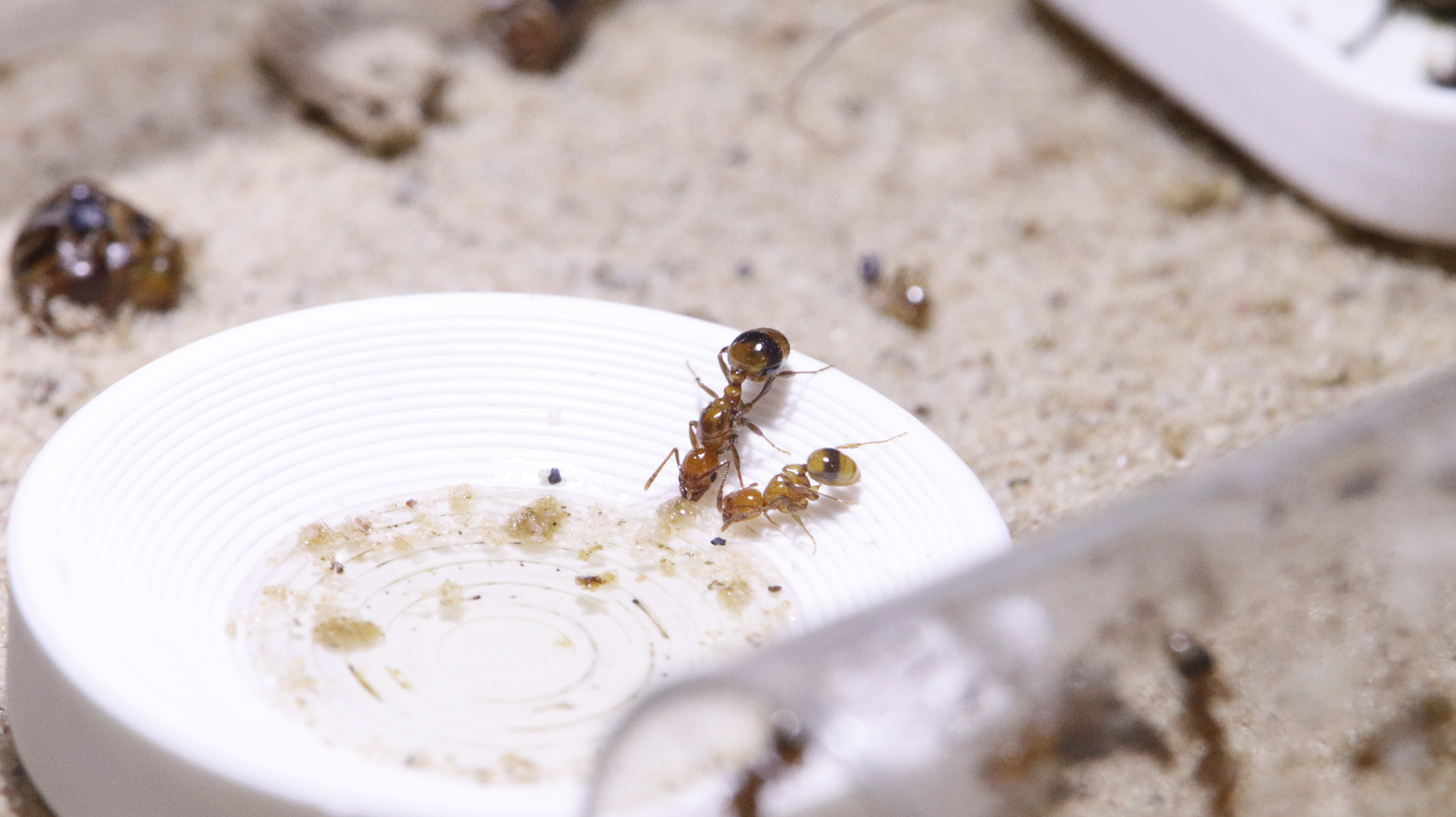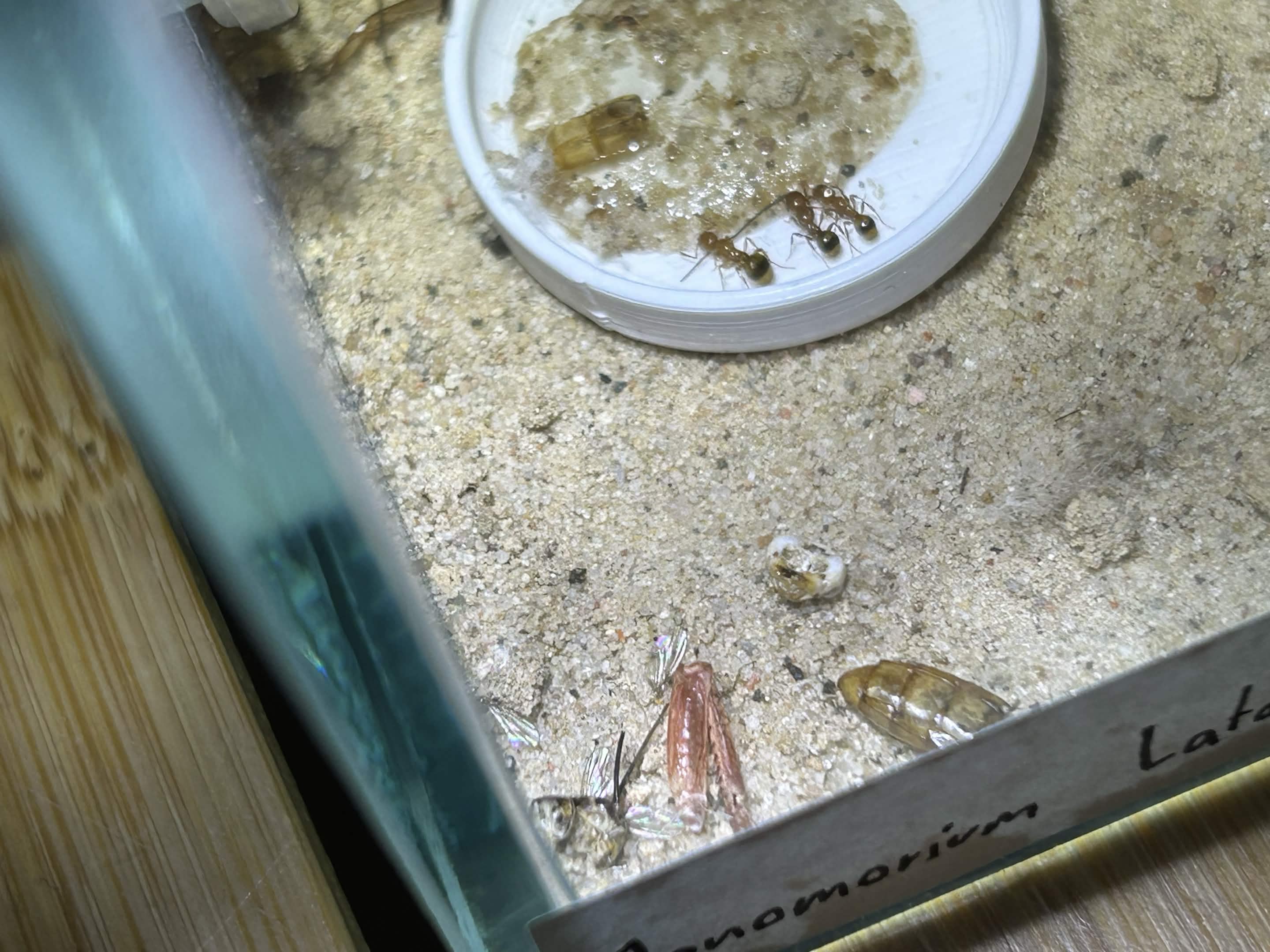 Zunächst war ich etwas verwundert warum eine der beiden Königinnen alleine und größtenteils unbewacht auf Nahrungssuche gehen würde... beide Königinnen saßen zu dem Zeitpunkt jedoch im Nest. Die Kolonie hat zu diesem Zeitpunkt noch nie Geschlechtstiere hervorgebracht und liegt bei gerade einmal 100+- Arbeiterinnen. In der Arena konnte ich ebenfalls 2 passende Flügelpaare dazu finden.