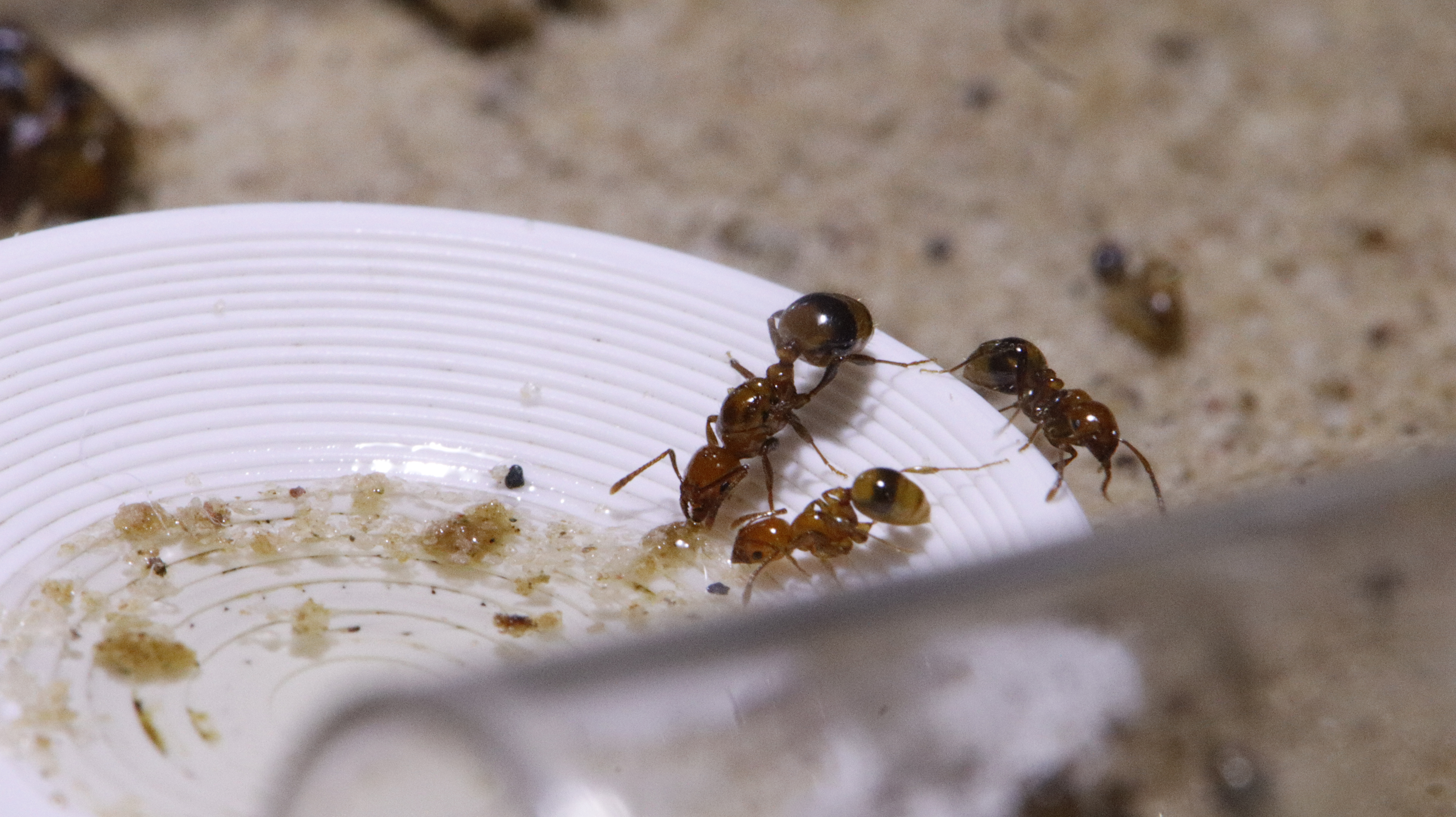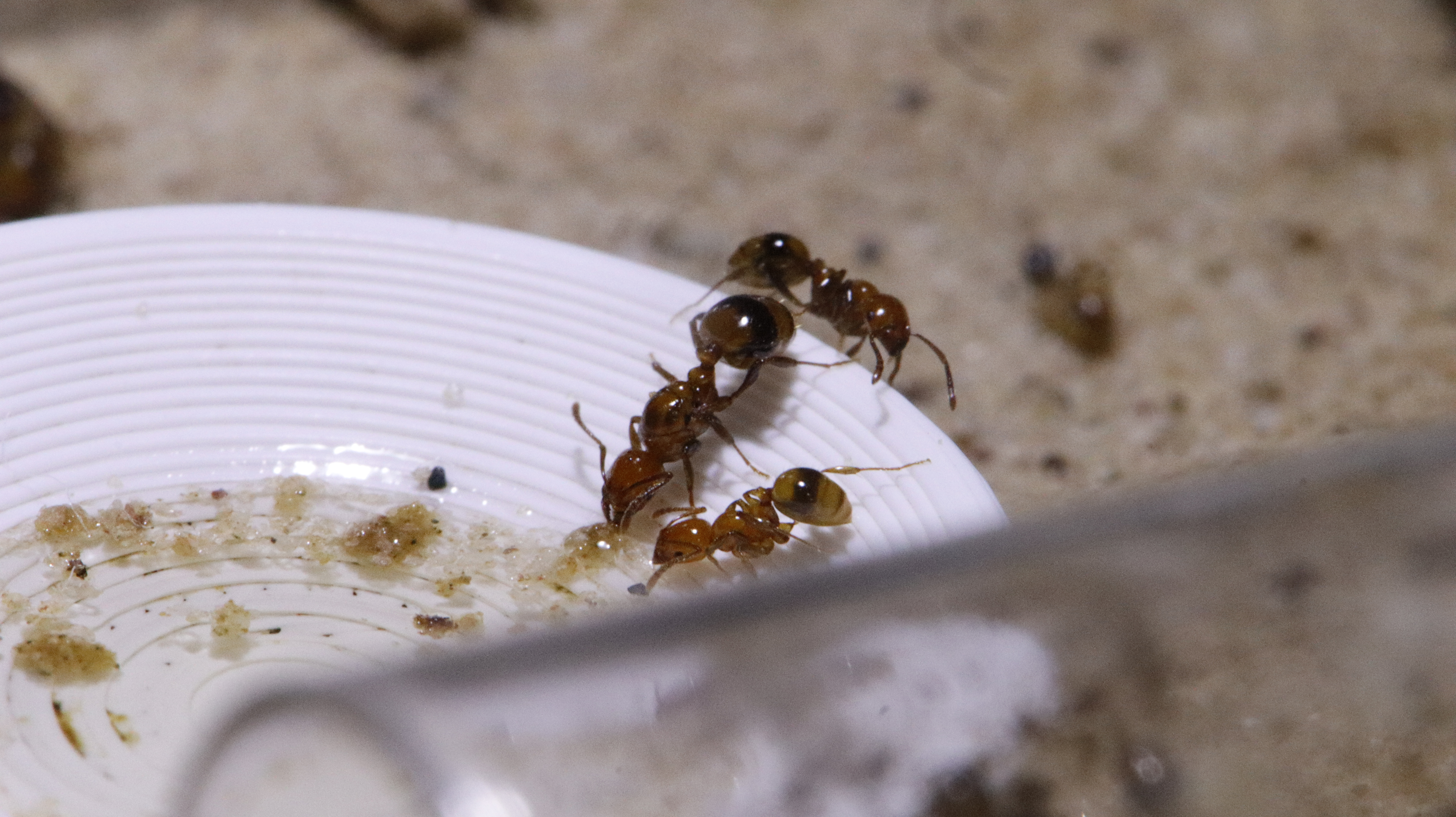 Ich habe gestern Nacht noch eine Beobachtung gemacht die ich gerne teilen würde. Bei meiner Monomorium latastei Kolonie konnte ich gestern folgende Ameise am Agavendicksaft beobachten: