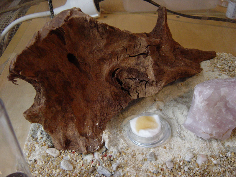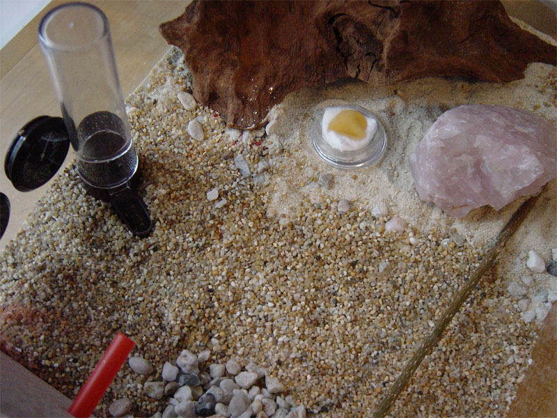 Sonst gibts noch Mangrovenholz, einen (ich glaube) Rosenquarz, sowie feinen Aquarienkies und Sand. Bis auf das Holz wurde alles im Backofen gebacken.