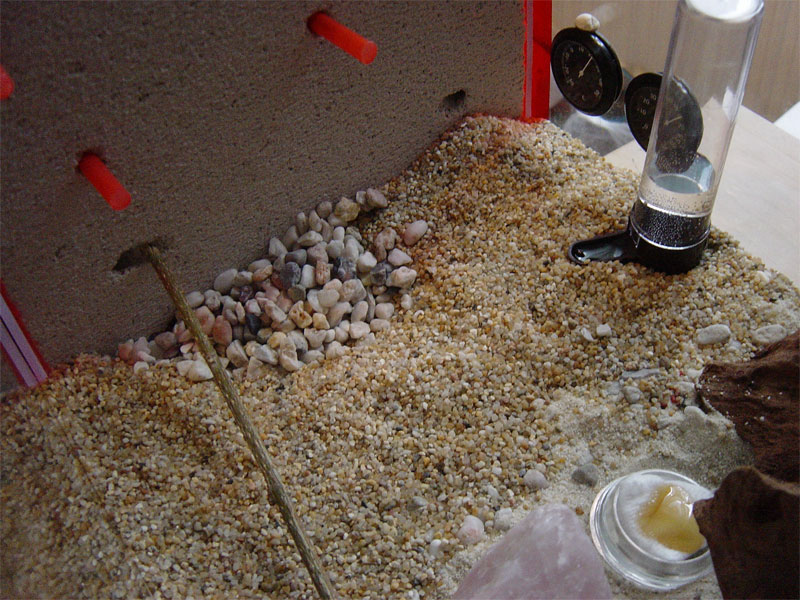 Bild 5: Blick auf den Ytongstein => 2 getrennte (Ganz unten/links und rechts) Kammern wurden geöffnet, in der Hoffnung den Ameisen einen Umzug ins Ytongnest schmackhaft zu machen. Unter dem groben Kies siedele momentan.