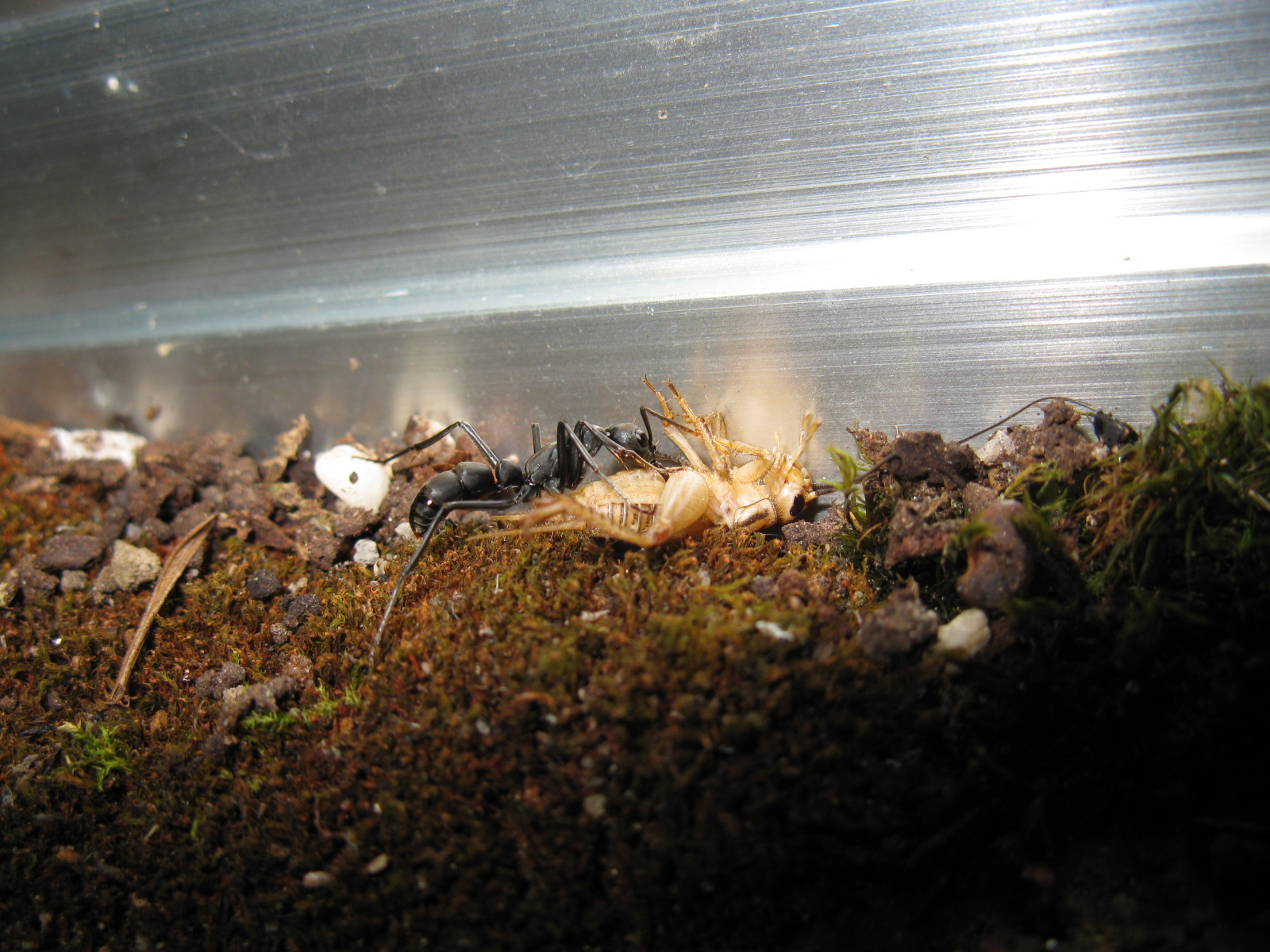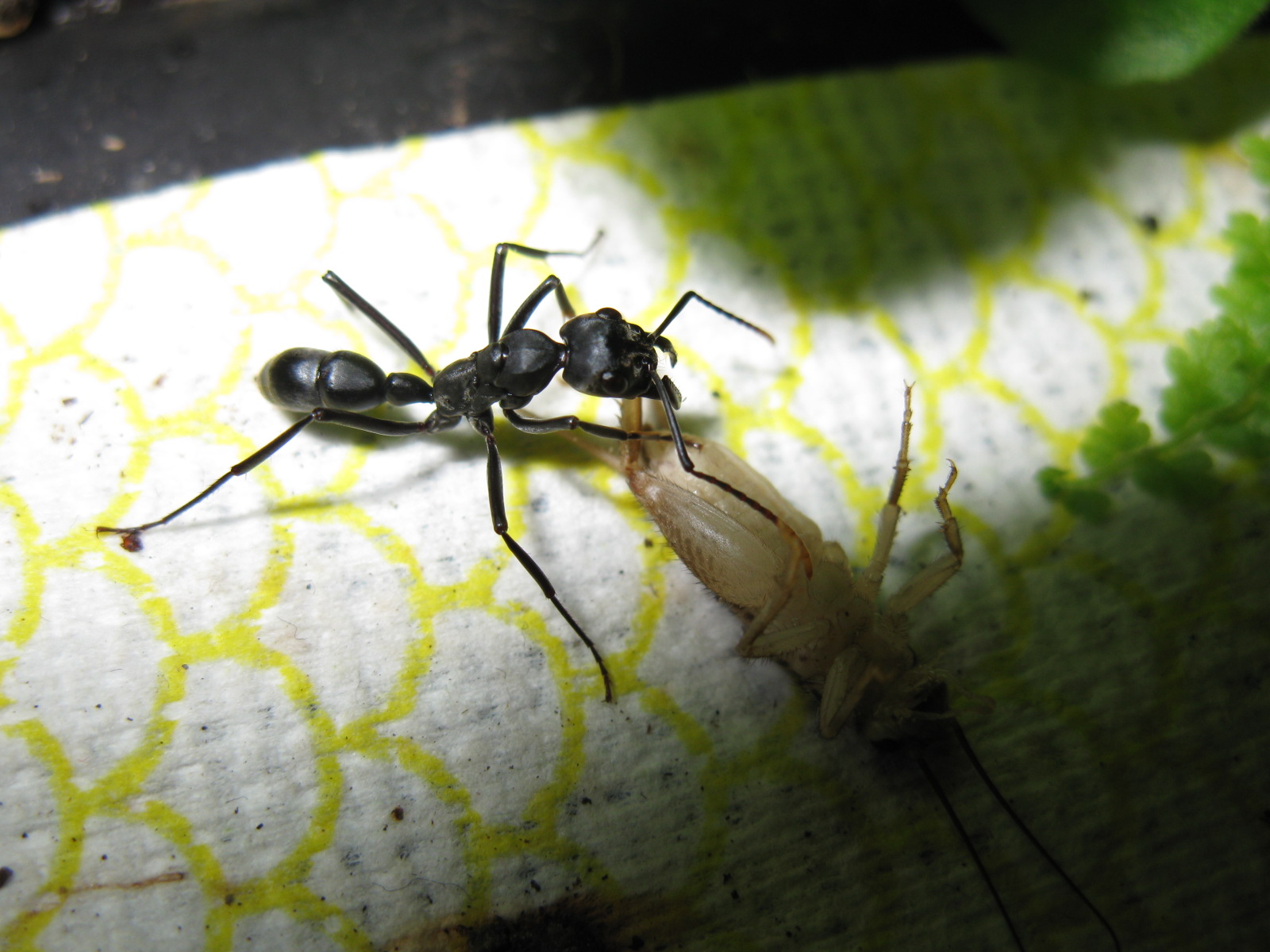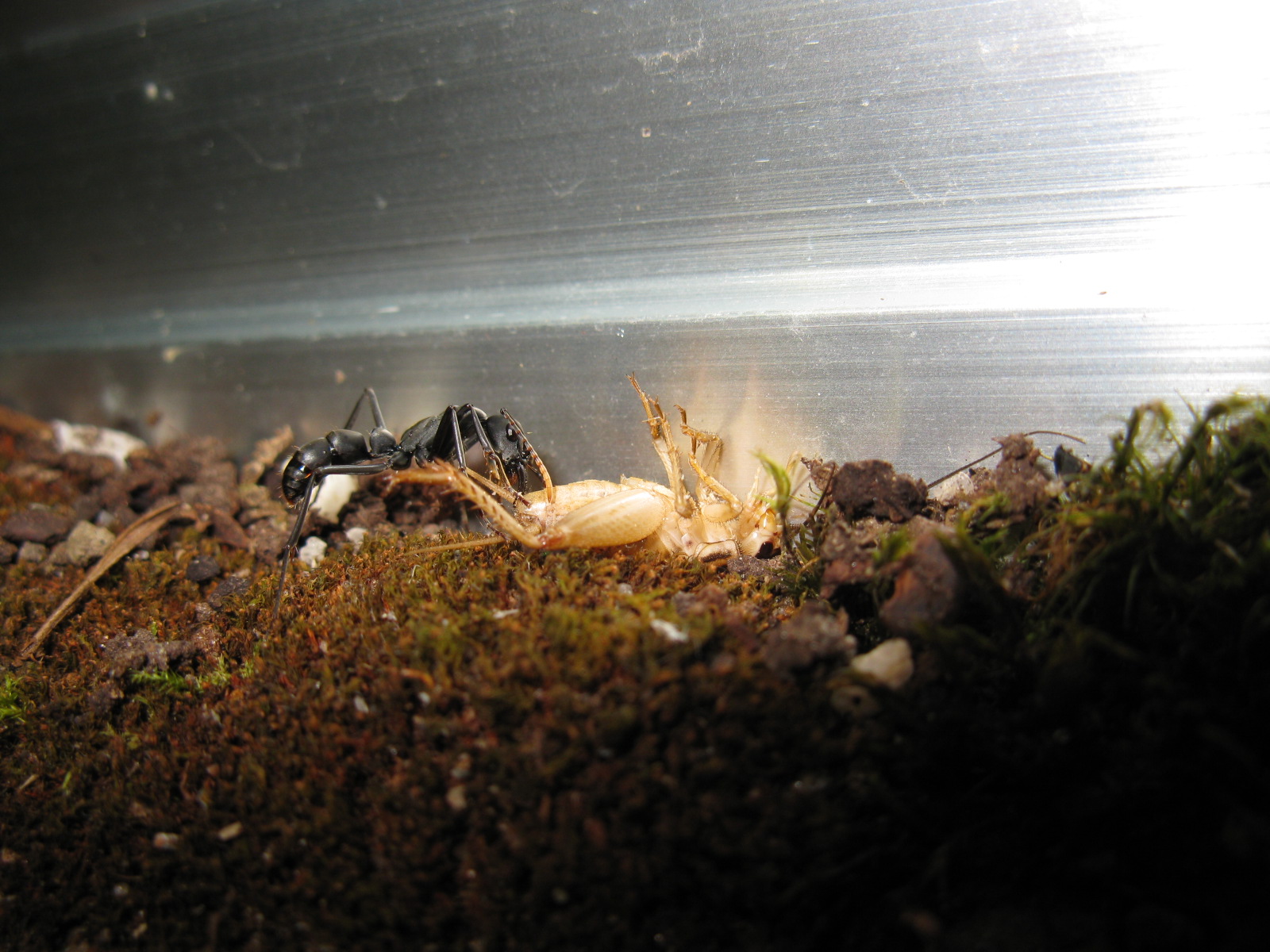Bilder der Ameisen, Gigantiops und Pachycondyla bei der Jagd. Beide Arten erbeuten regelmässig Insekten, ohne sich dabei in's Gehege zu kommen. Die Gigantiops erbeuten ihre Fruchtfliegen, die Pachycondyla apicalis grössere Beutetiere wie hier Grillen.