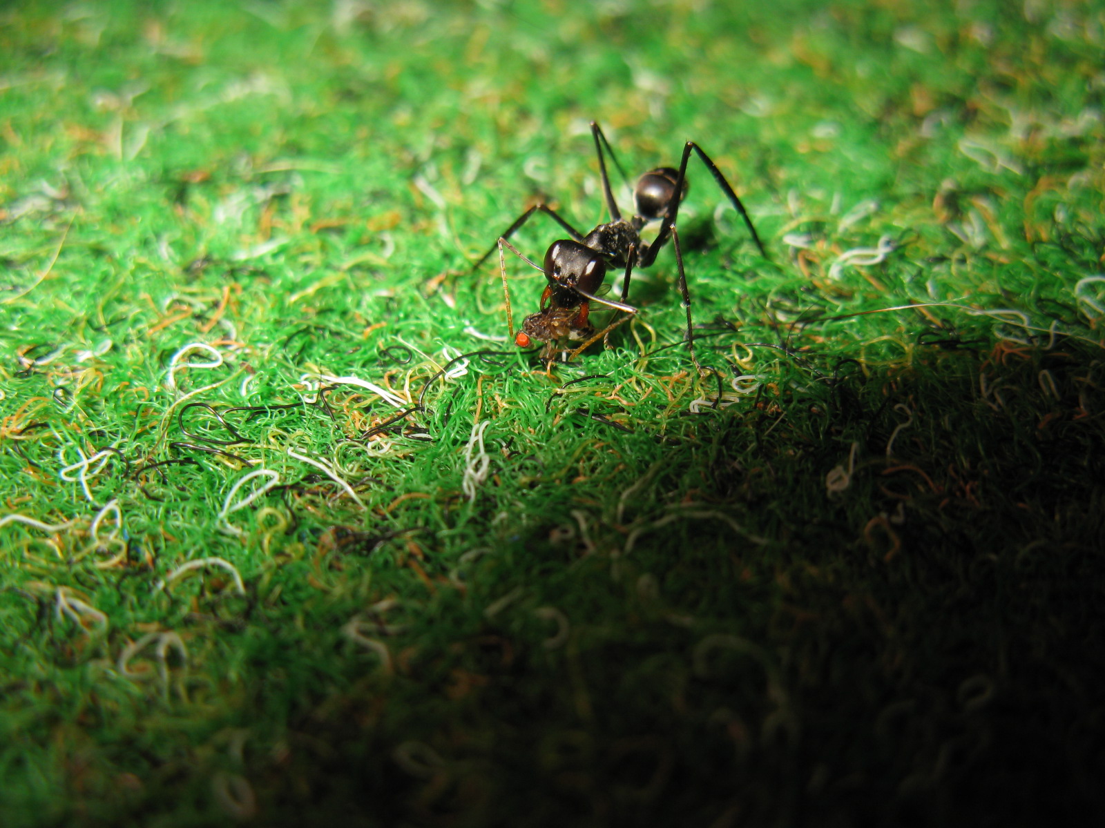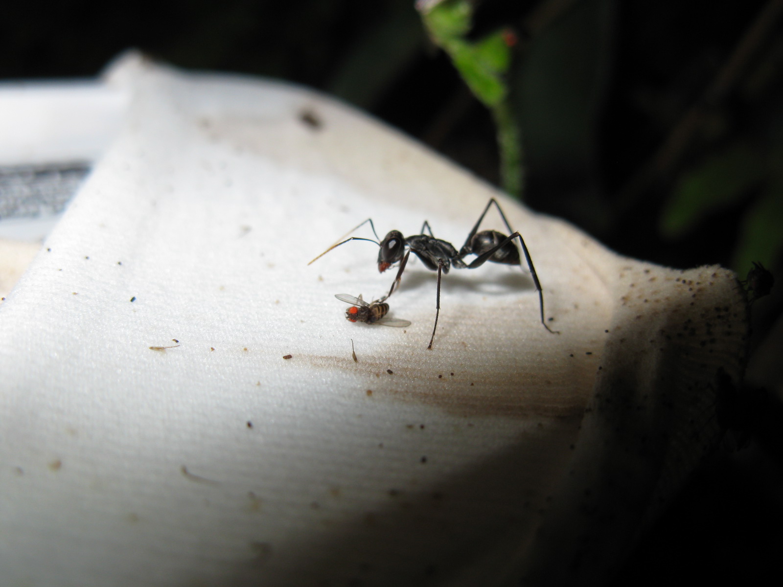 Immer wieder sehr schön zu beobachten, wie die Beute kampfunfähig gemacht wird. Gigantiops packt die Fliege und tötet sie mit gezielten Ansprühen mit Ameisensäure, die Ponerinen packen ebenfalls zu, stechen dann mehrmals zu und lähmen die Beute, die kurze Zeit später völlig bewegungsfähig ist und stirbt.