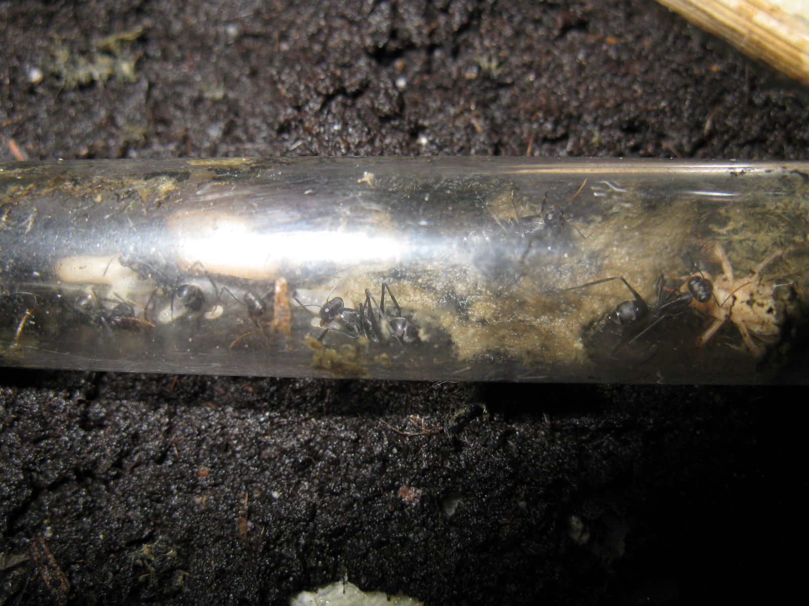 Als letztes Bild ein Foto einer jungen, sich gut entwickelnden Gigantiops-Kolonie. Schwierig zu fotografieren im mit Erde ausgebauten, spiegelnden Reagenzglas. Aber die kleinen Erstlingsarbeiterinnen sind zu sehen.