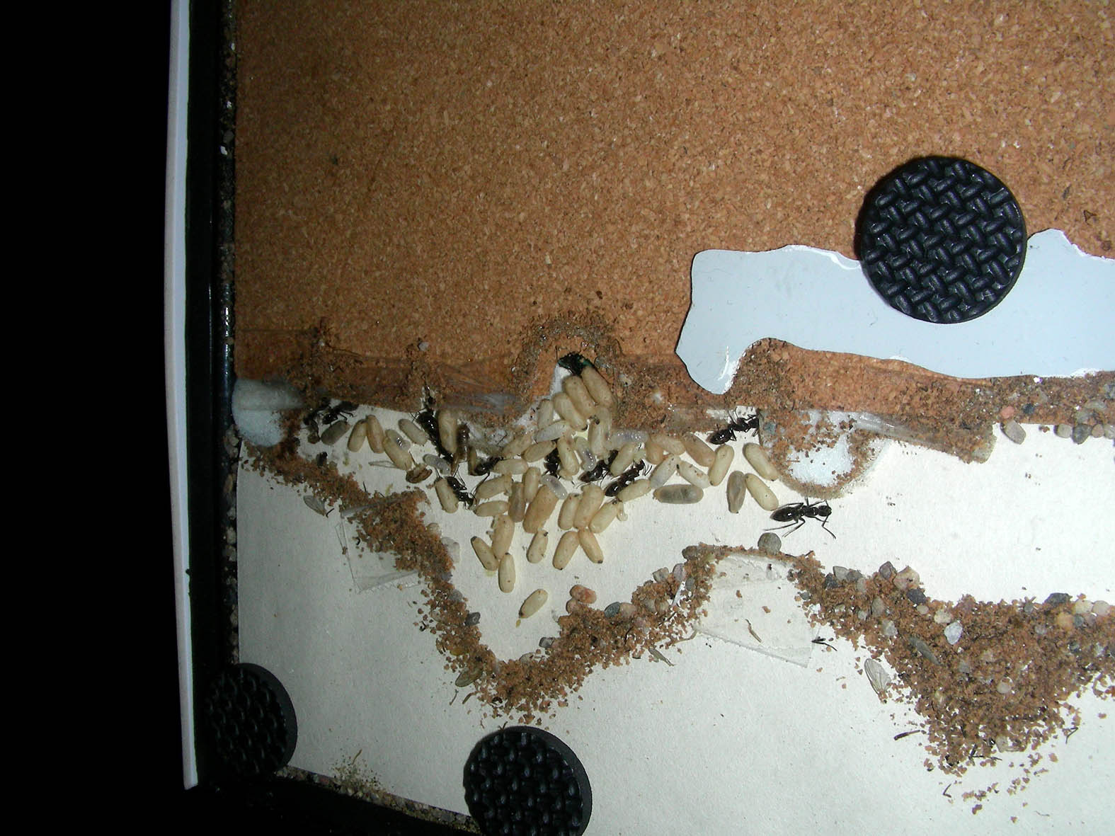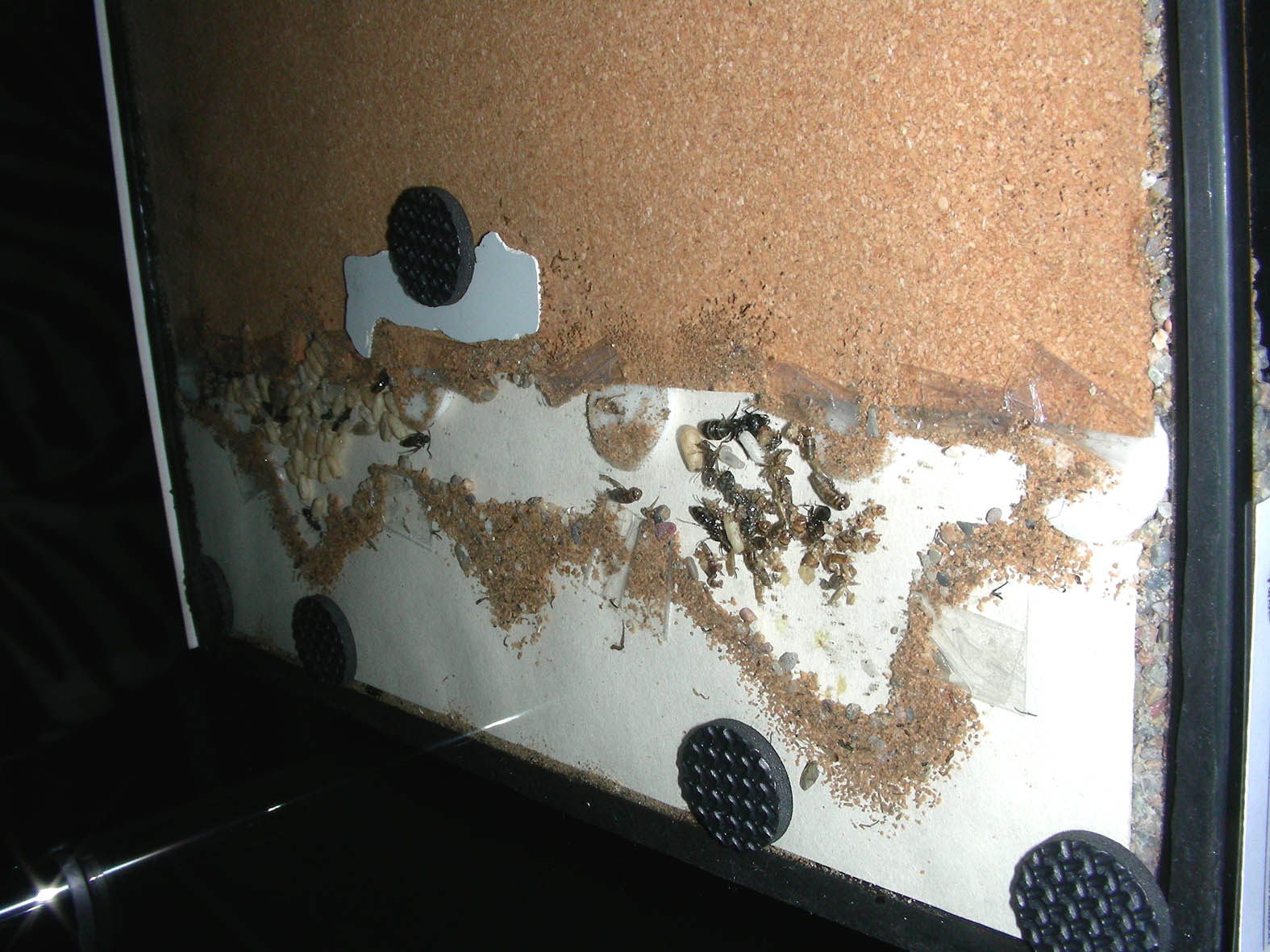 Sie hatten nie die gebauten Nester im Formikarium sondern immer unterhalb des Korkbodens der sich durch Feuchtigkeit nach oben gewölbt hatte gehaust. Fotos dazu werden noch aufgetrieben. Sie überwinterten 2011/2012 bei meiner Mutter am Balkon.