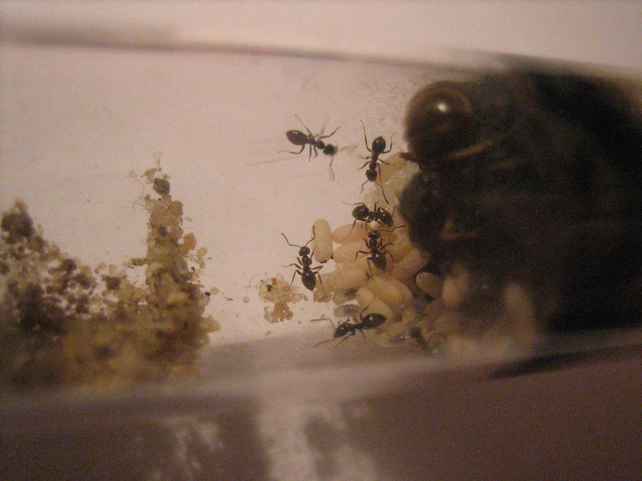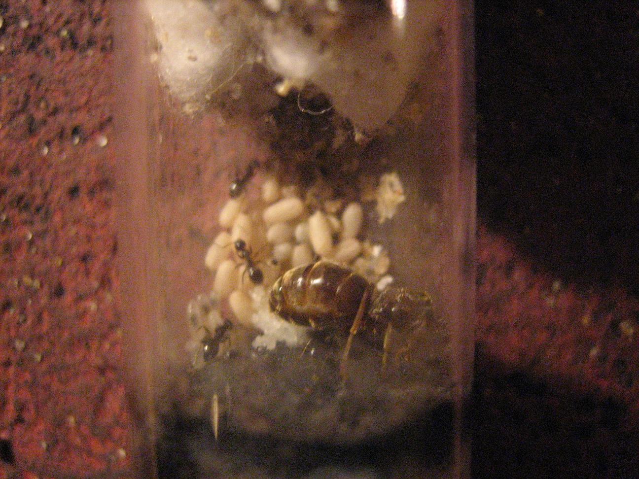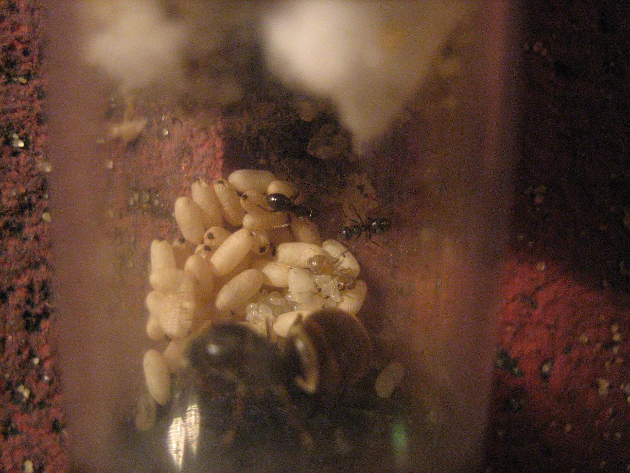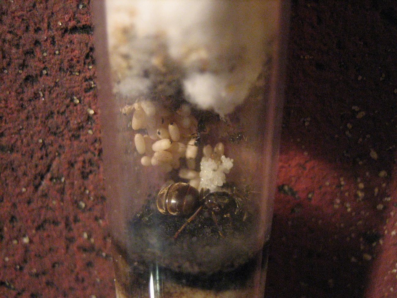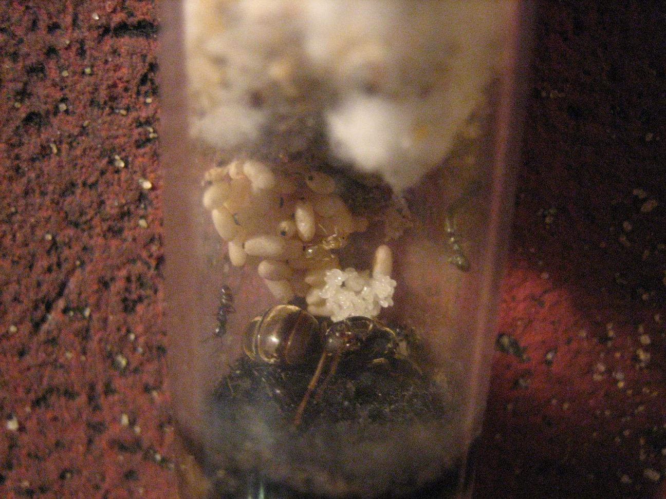 (zu sehen: Bildmitte). Sie Àhnelt, von der Farbe her, leicht den Lasius flavus. Der Kokon befindet sich auch noch im Nest (Reagenzglas) und ist oben links auf dem Puppenberg zu erkennen.