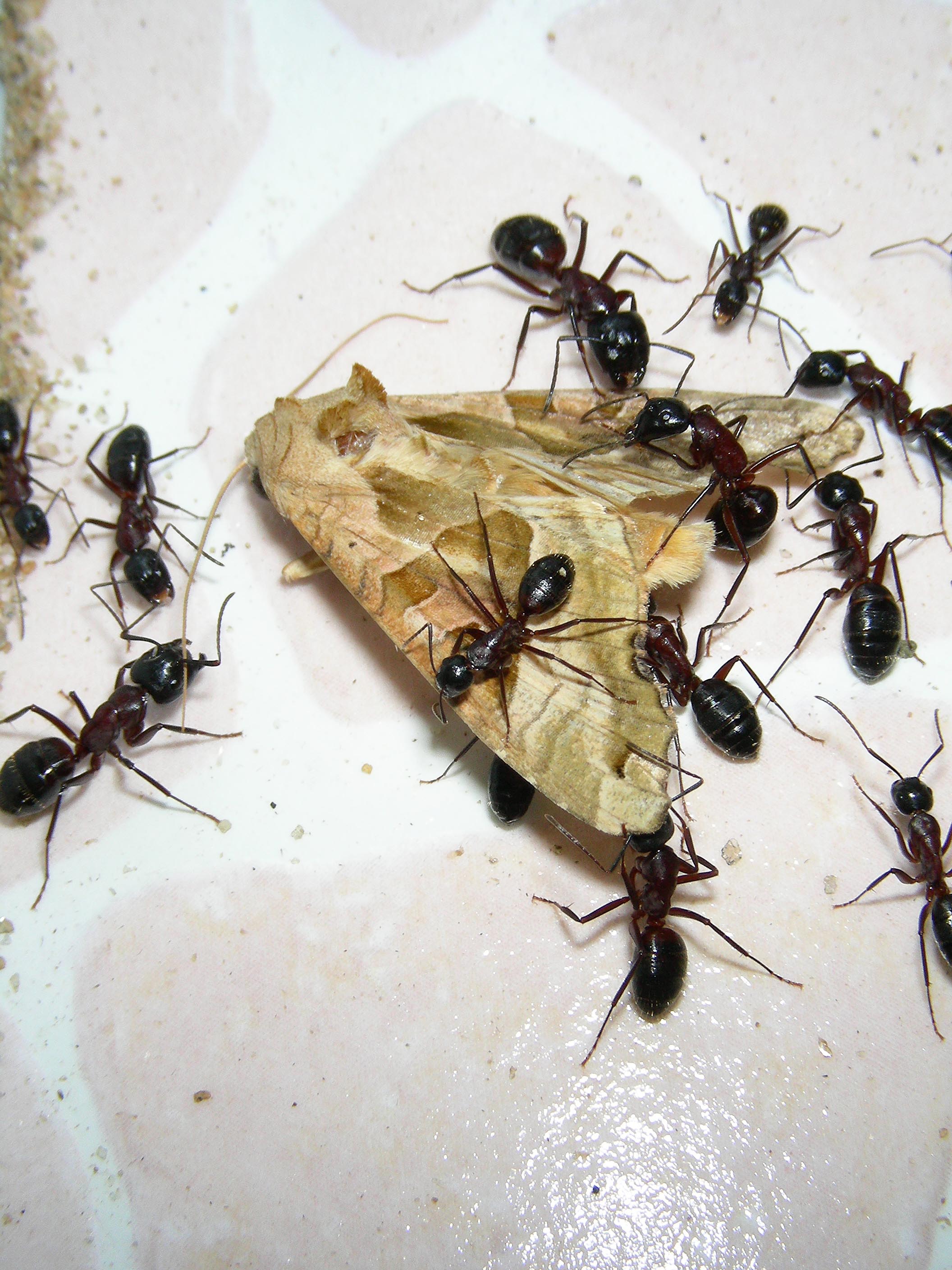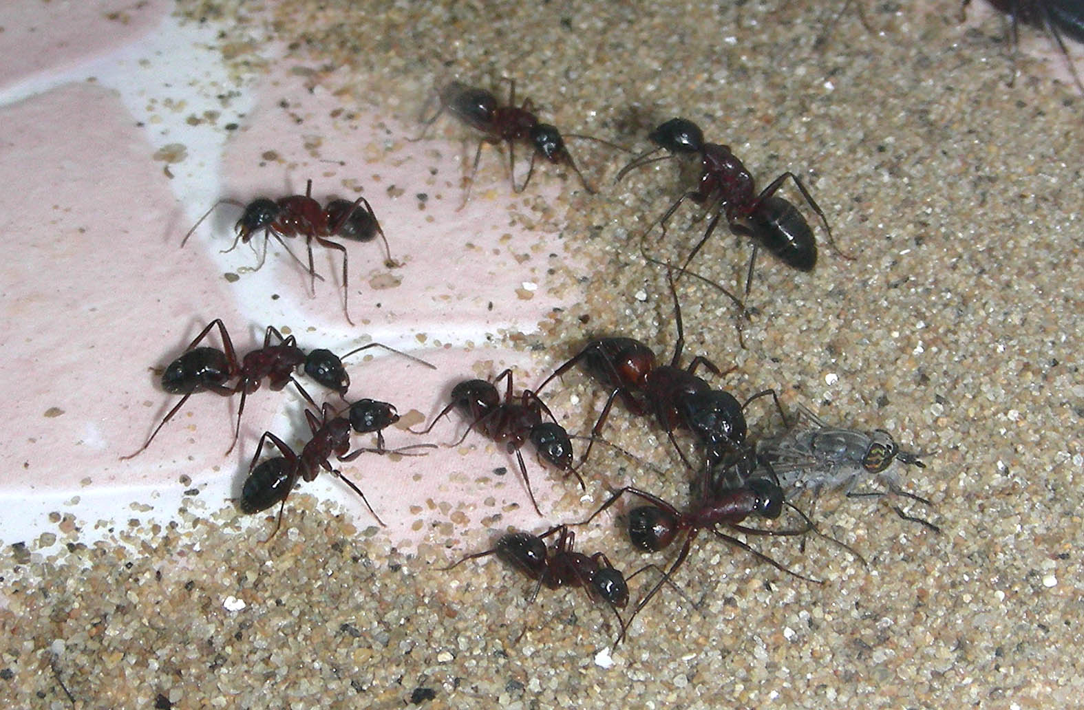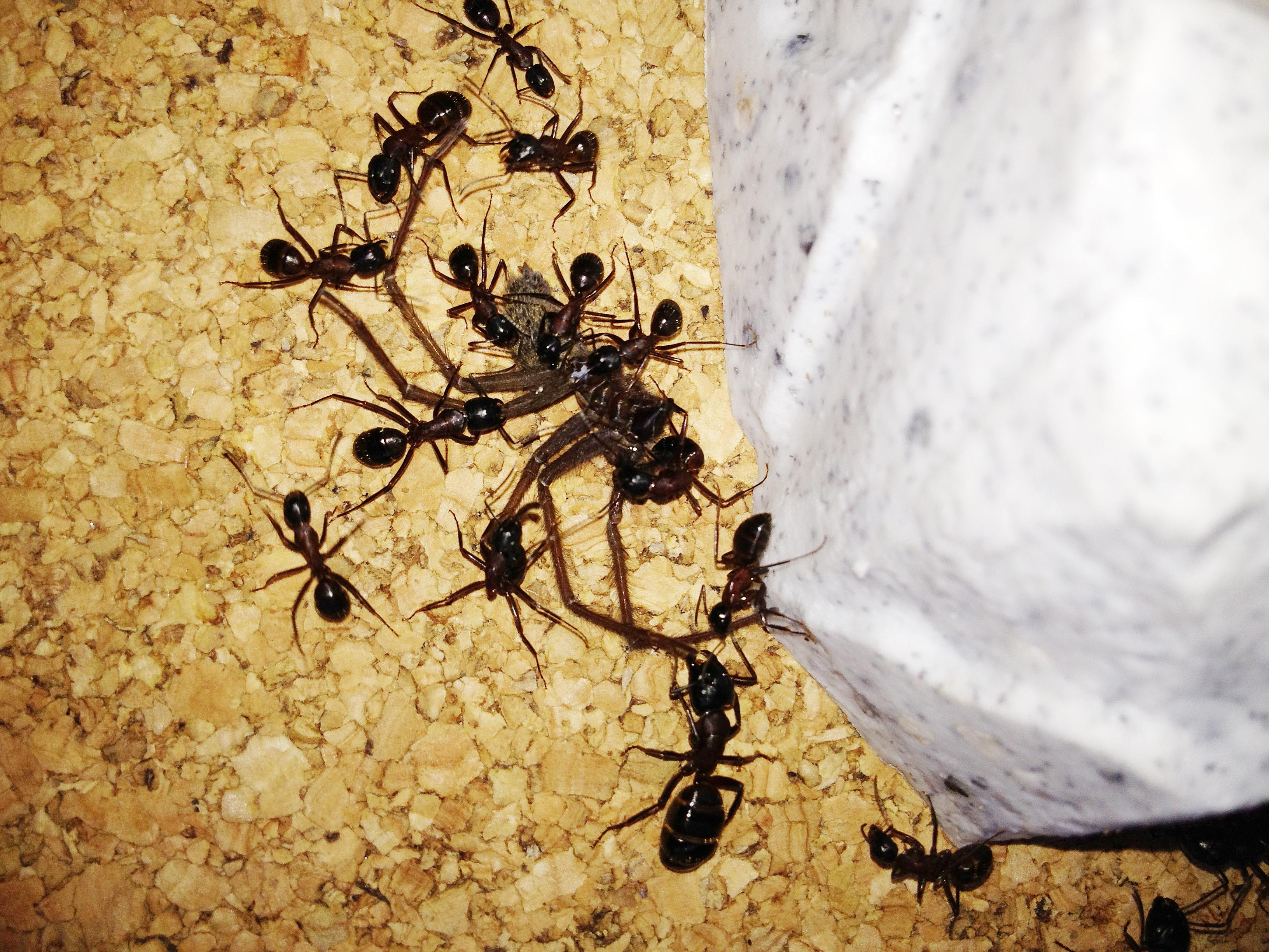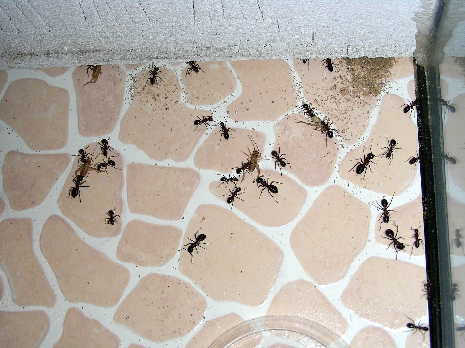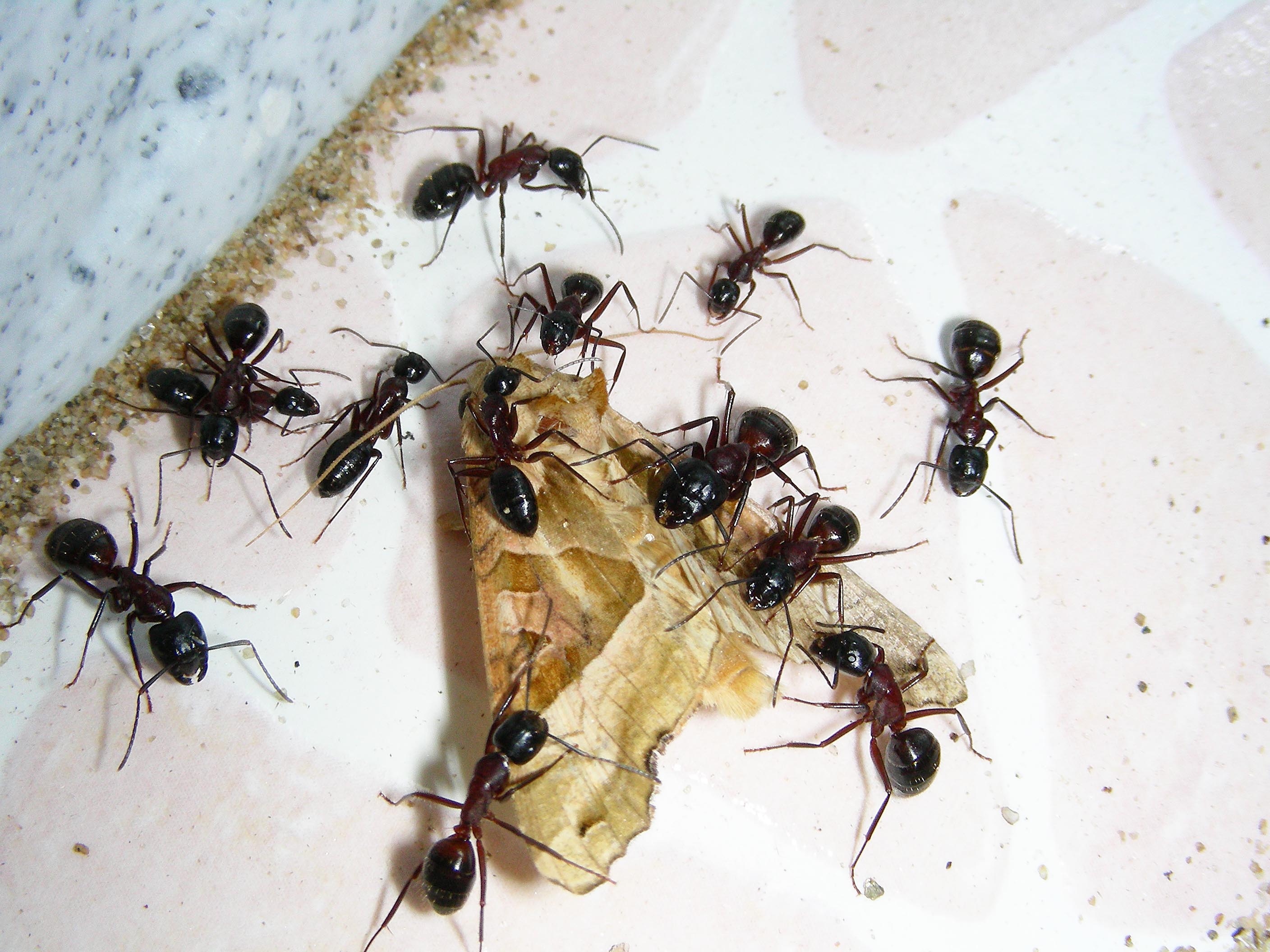 18.03.2011 Gab ihnen in den letzten Tagen immer wieder Insekten hinein die sie alle komplett verwendeten. Heute waren es kleinere Insekten und zwar 90 Essigfliegen - mit denen sie aber bis zum Abend (bis auf ein paar wenige) nichts anfangen konnten - deshalb wieder entfernt. Hoffe ich merke mir das die Camponotus nichts mit den Essigfliegen anfangen können.