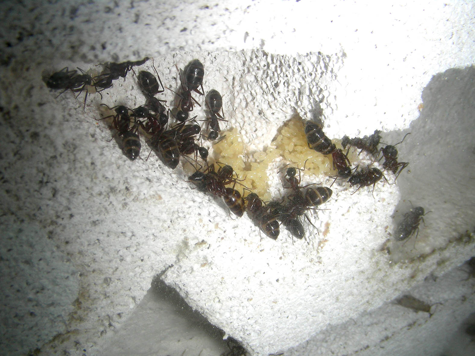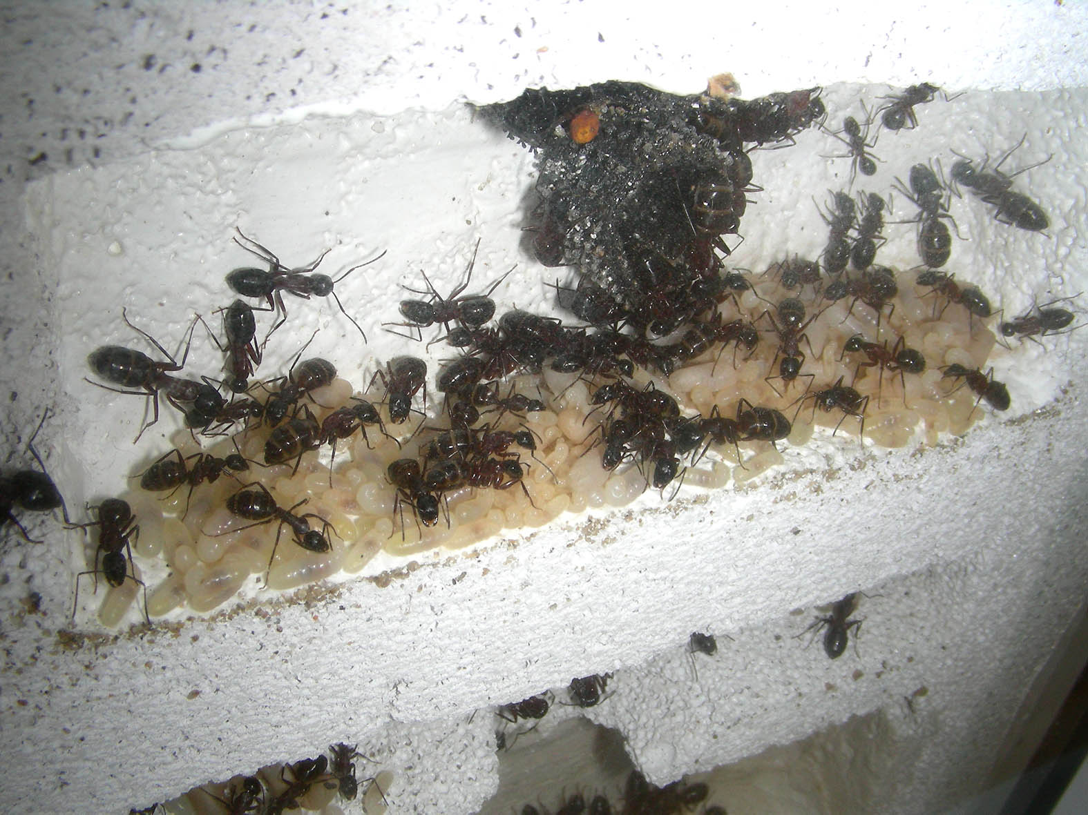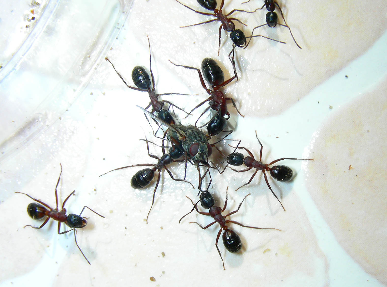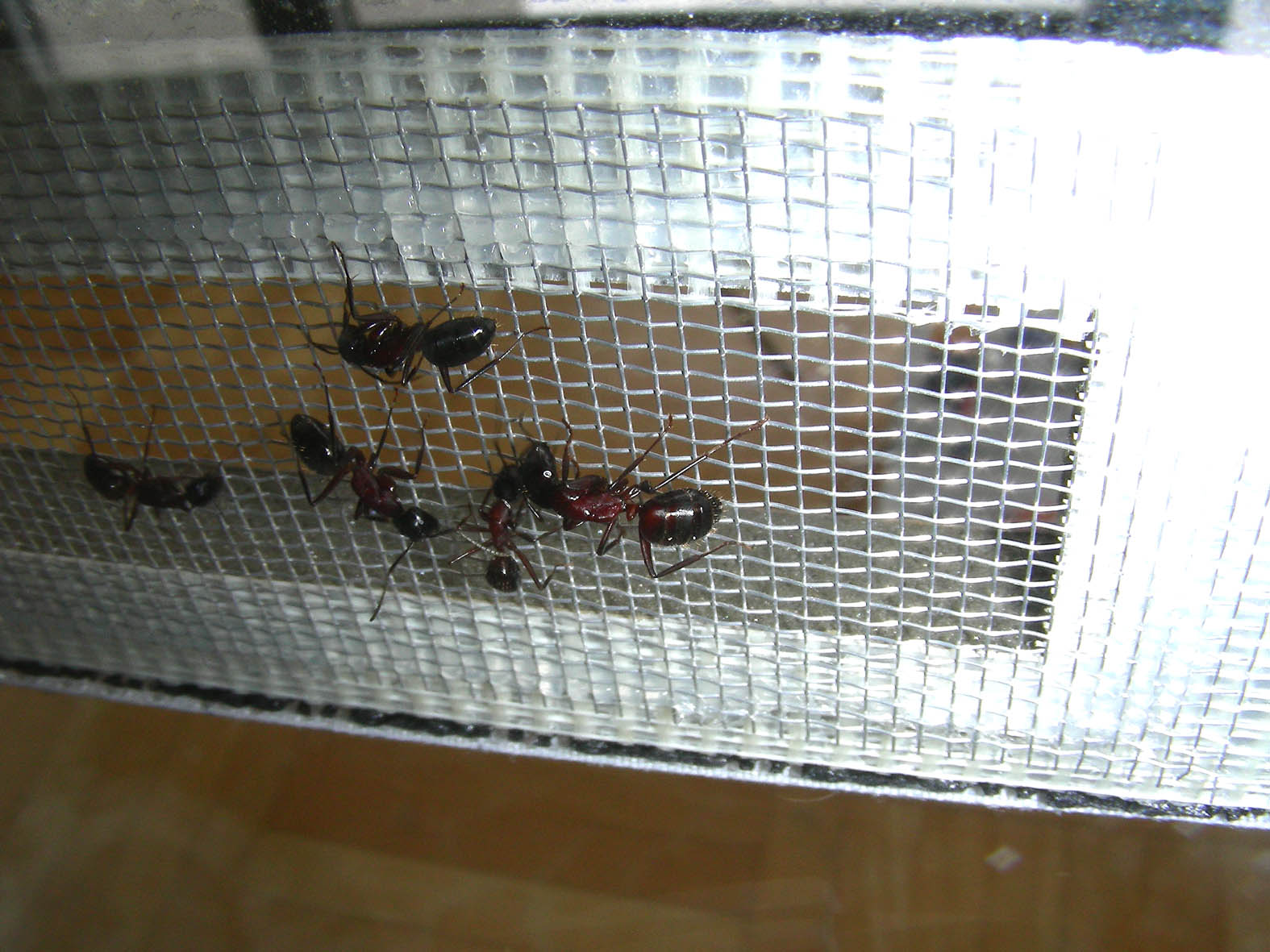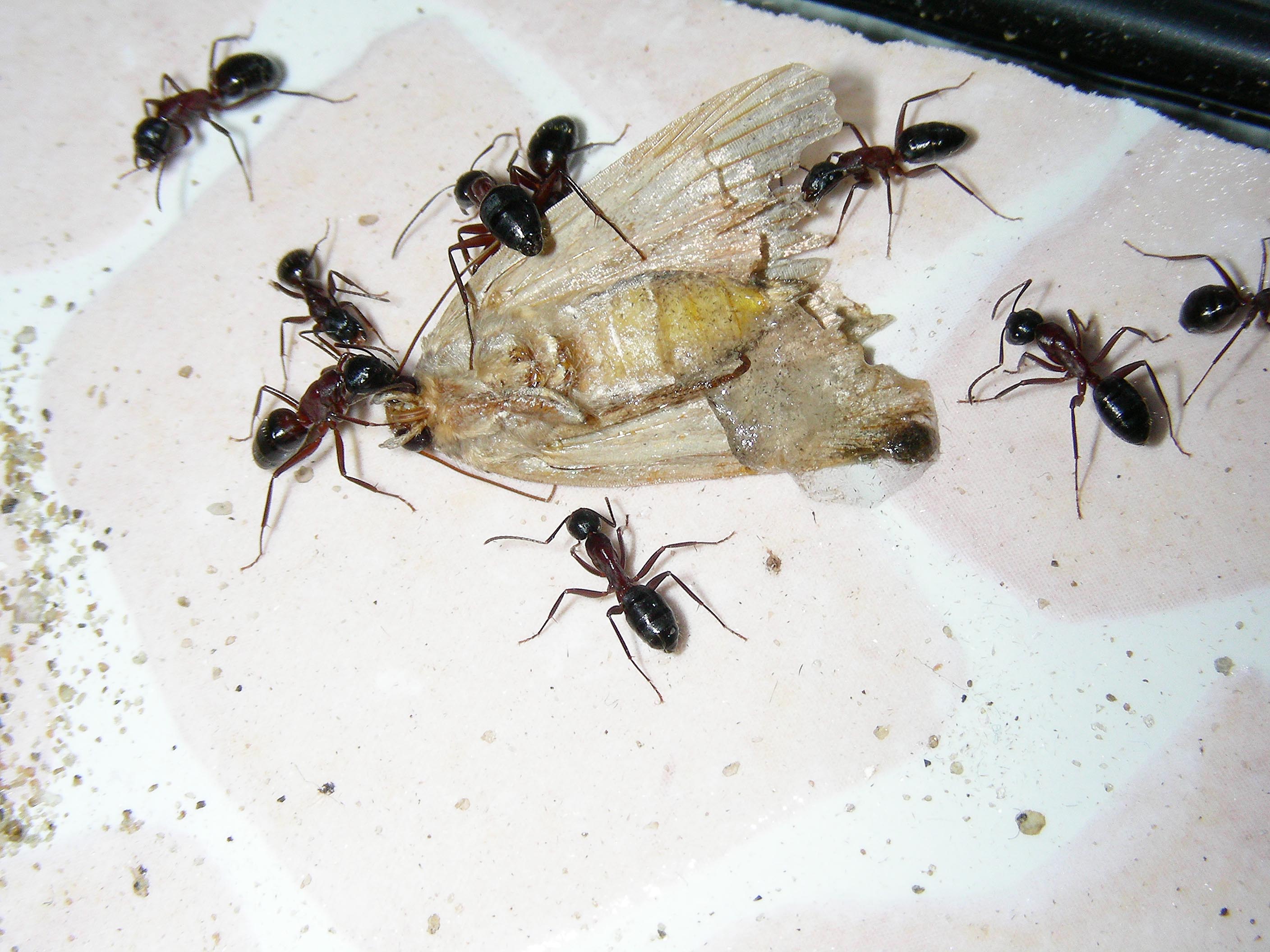 18.03.2011 Gab ihnen in den letzten Tagen immer wieder Insekten hinein die sie alle komplett verwendeten. Heute waren es kleinere Insekten und zwar 90 Essigfliegen - mit denen sie aber bis zum Abend (bis auf ein paar wenige) nichts anfangen konnten - deshalb wieder entfernt. Hoffe ich merke mir das die Camponotus nichts mit den Essigfliegen anfangen können.