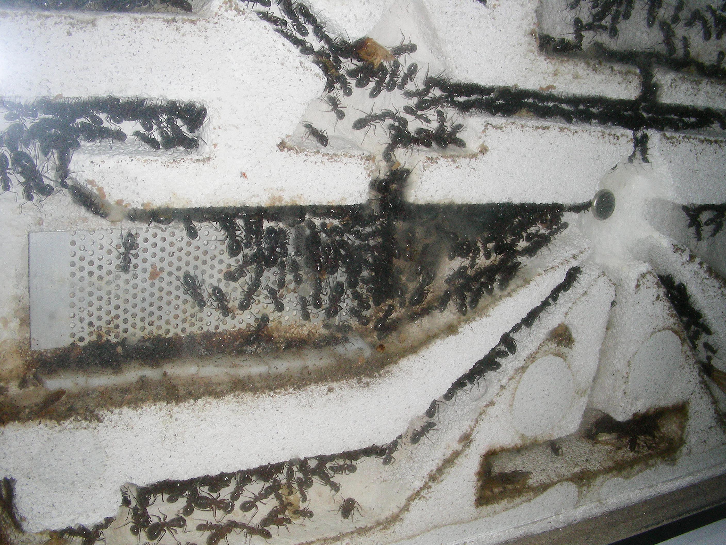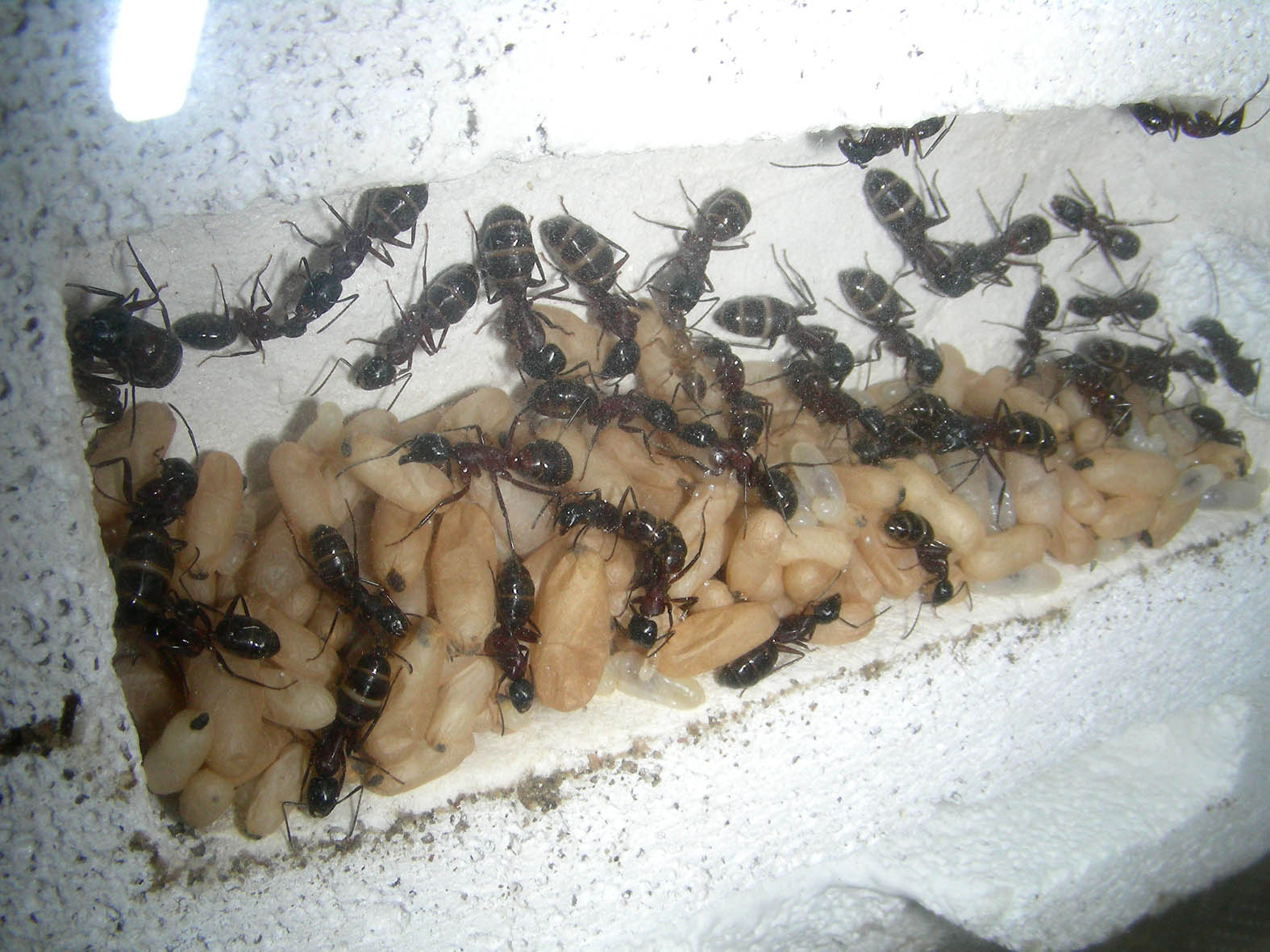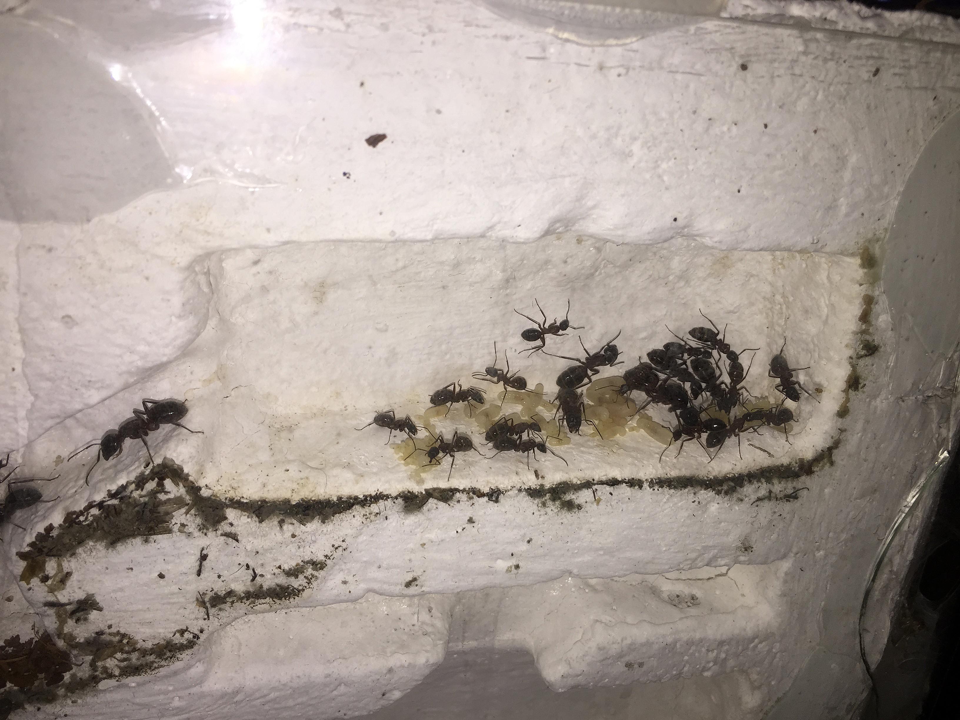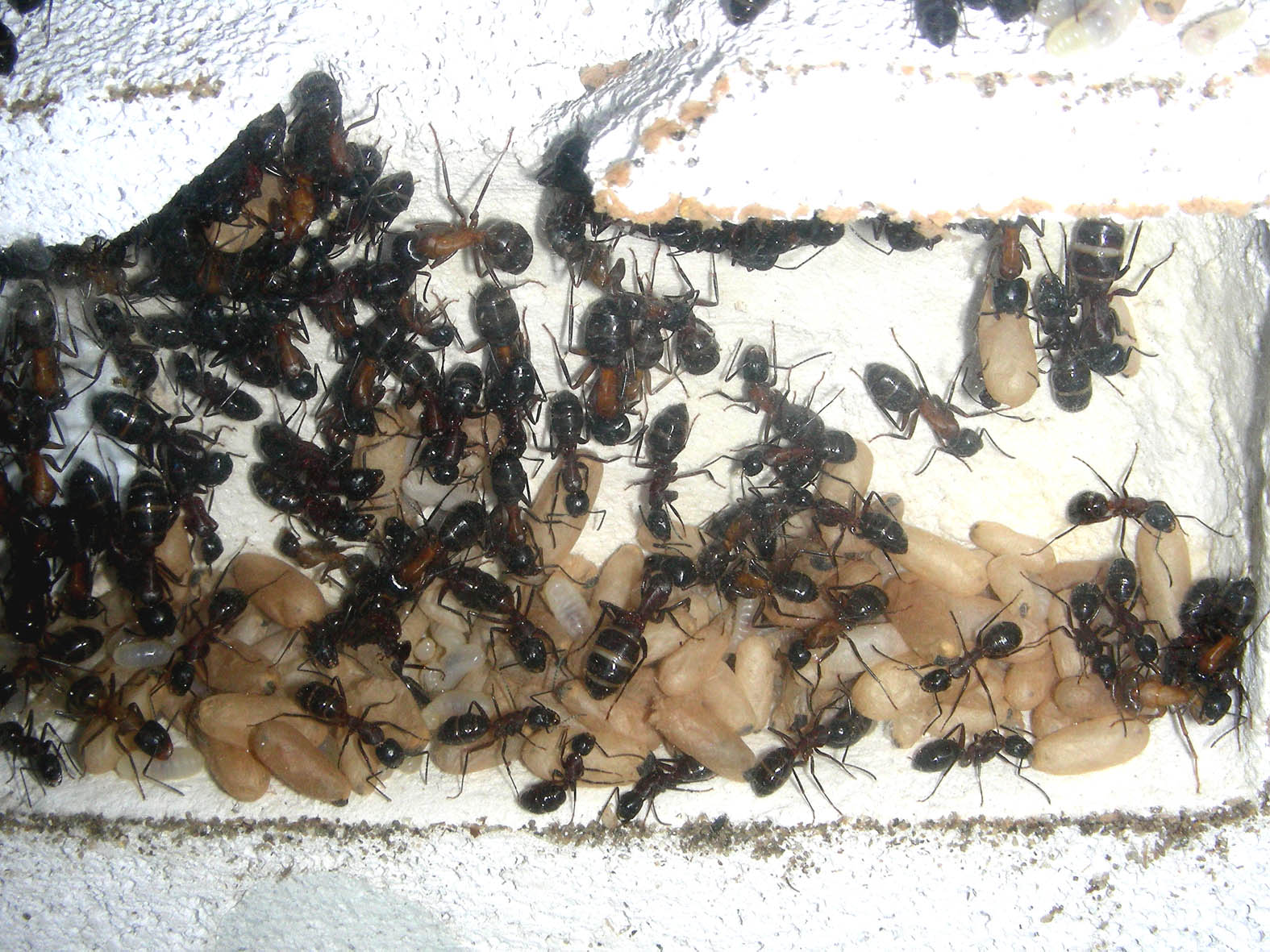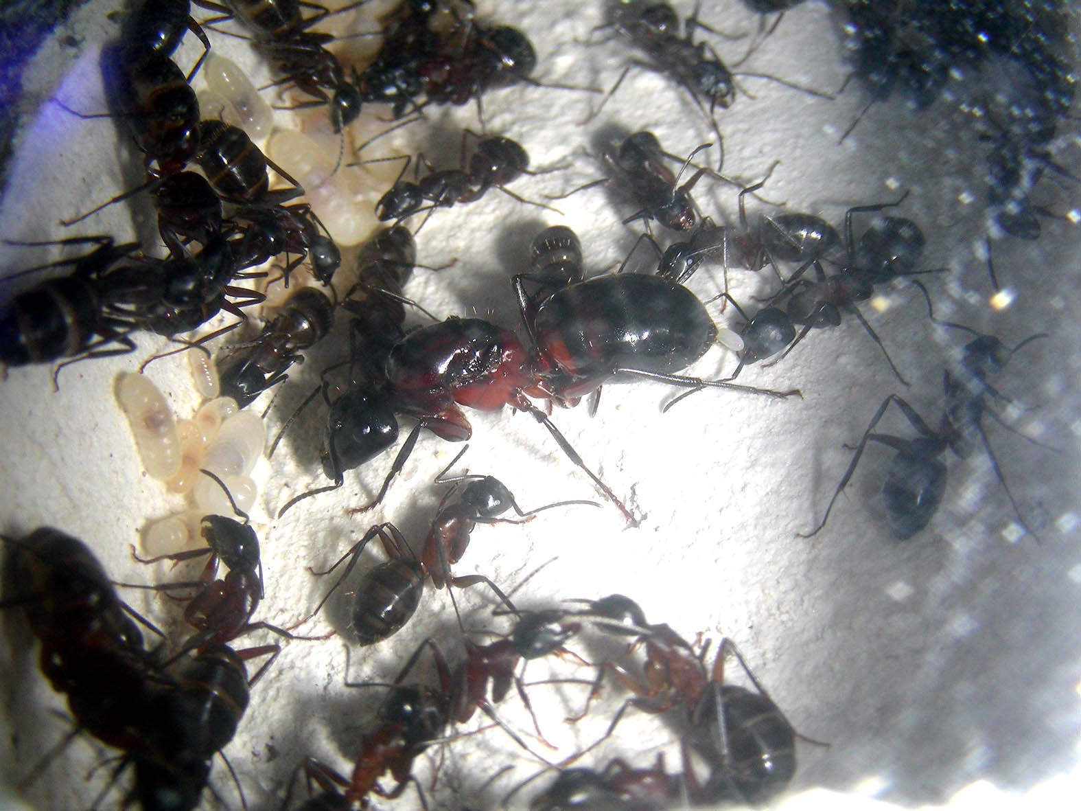 18.03.2011 Gab ihnen in den letzten Tagen immer wieder Insekten hinein die sie alle komplett verwendeten. Heute waren es kleinere Insekten und zwar 90 Essigfliegen - mit denen sie aber bis zum Abend (bis auf ein paar wenige) nichts anfangen konnten - deshalb wieder entfernt. Hoffe ich merke mir das die Camponotus nichts mit den Essigfliegen anfangen können.