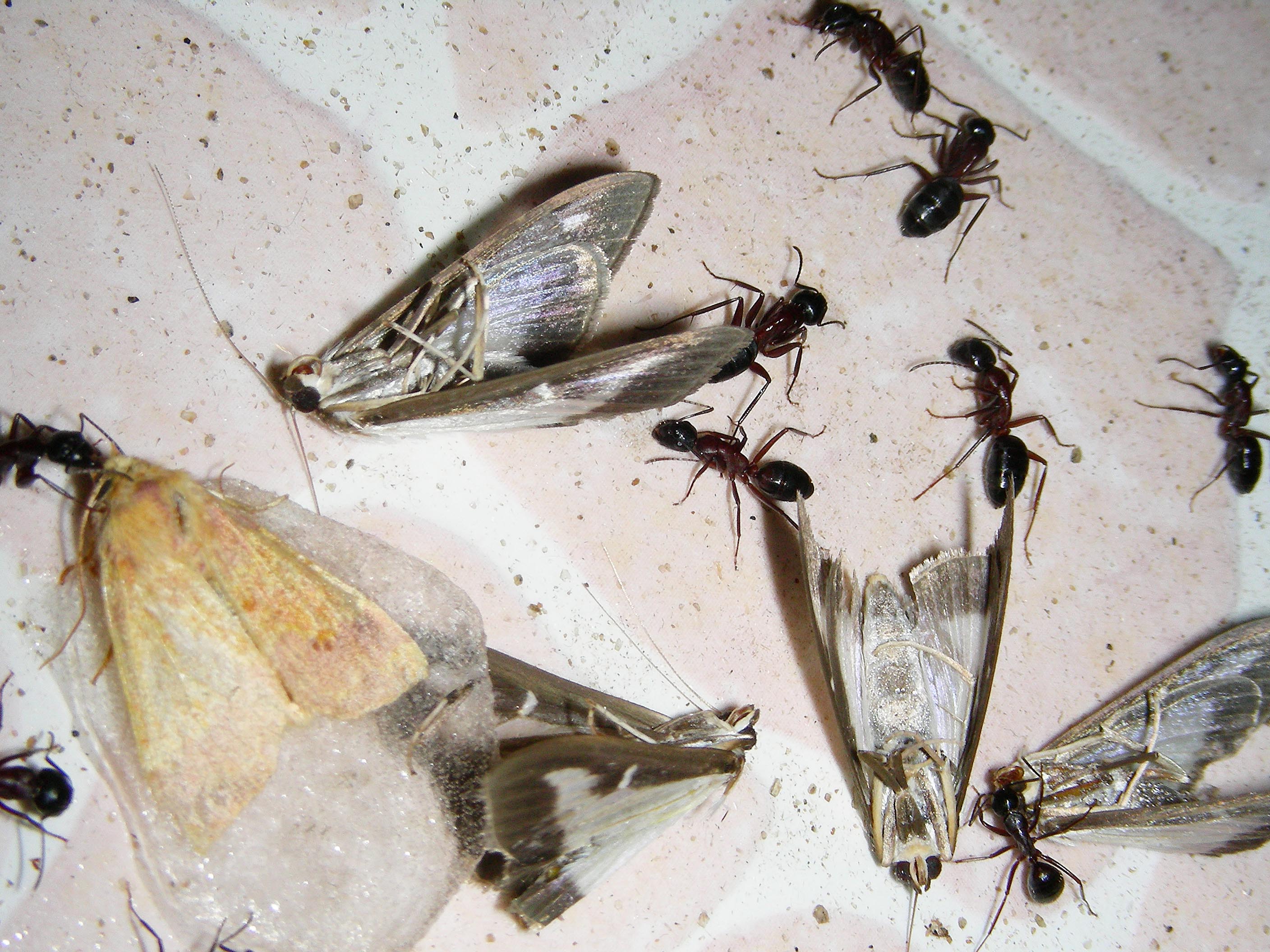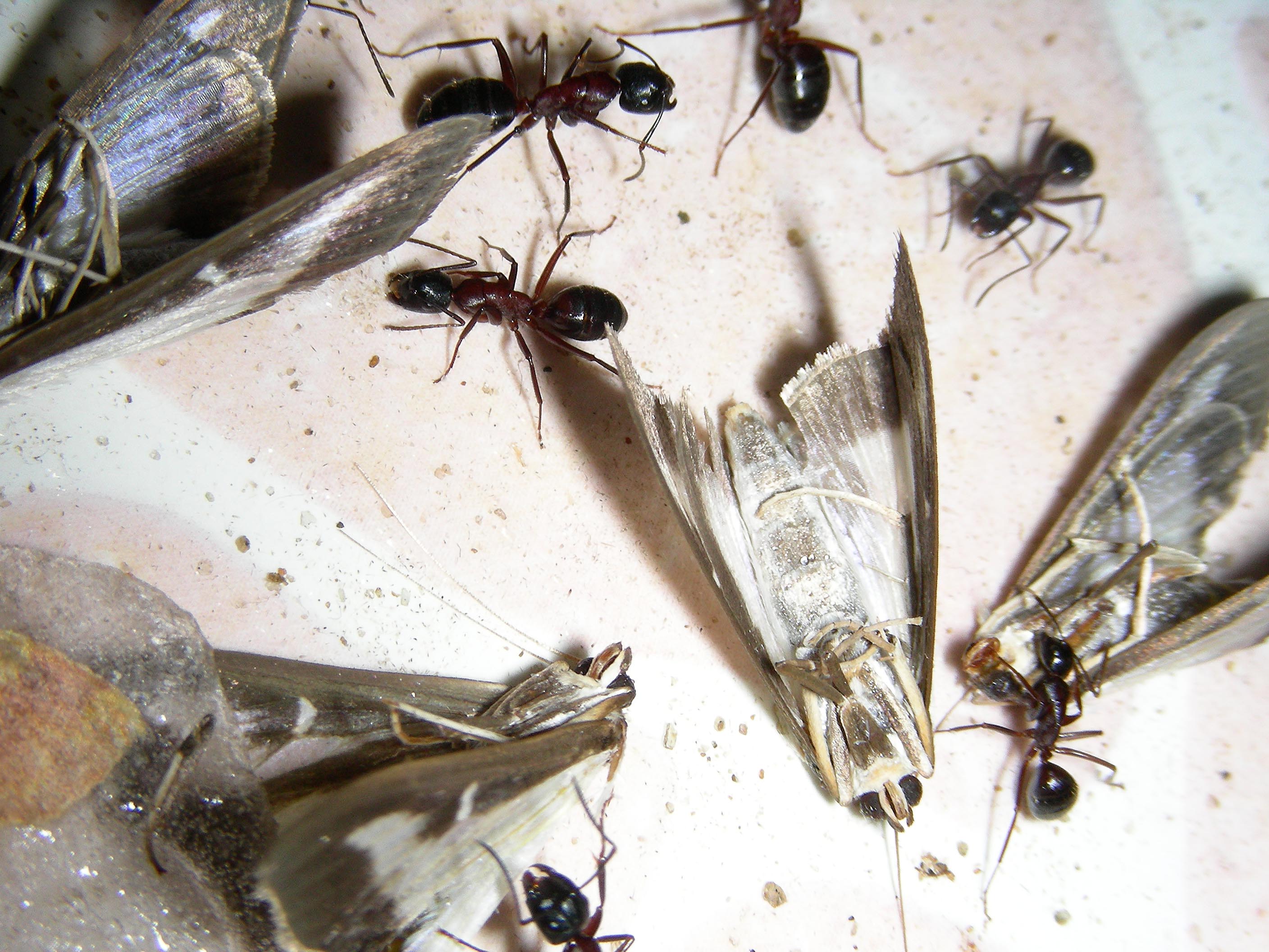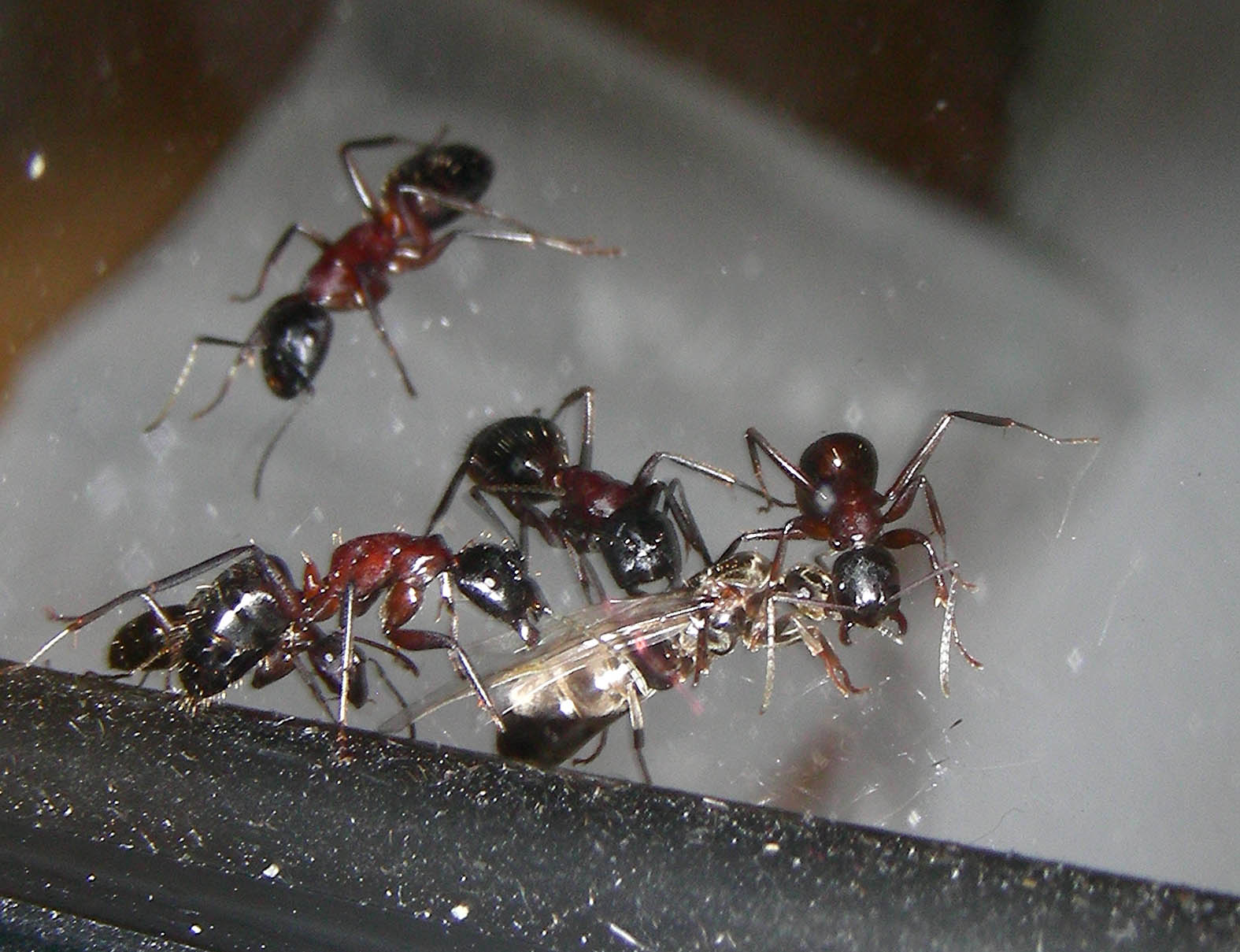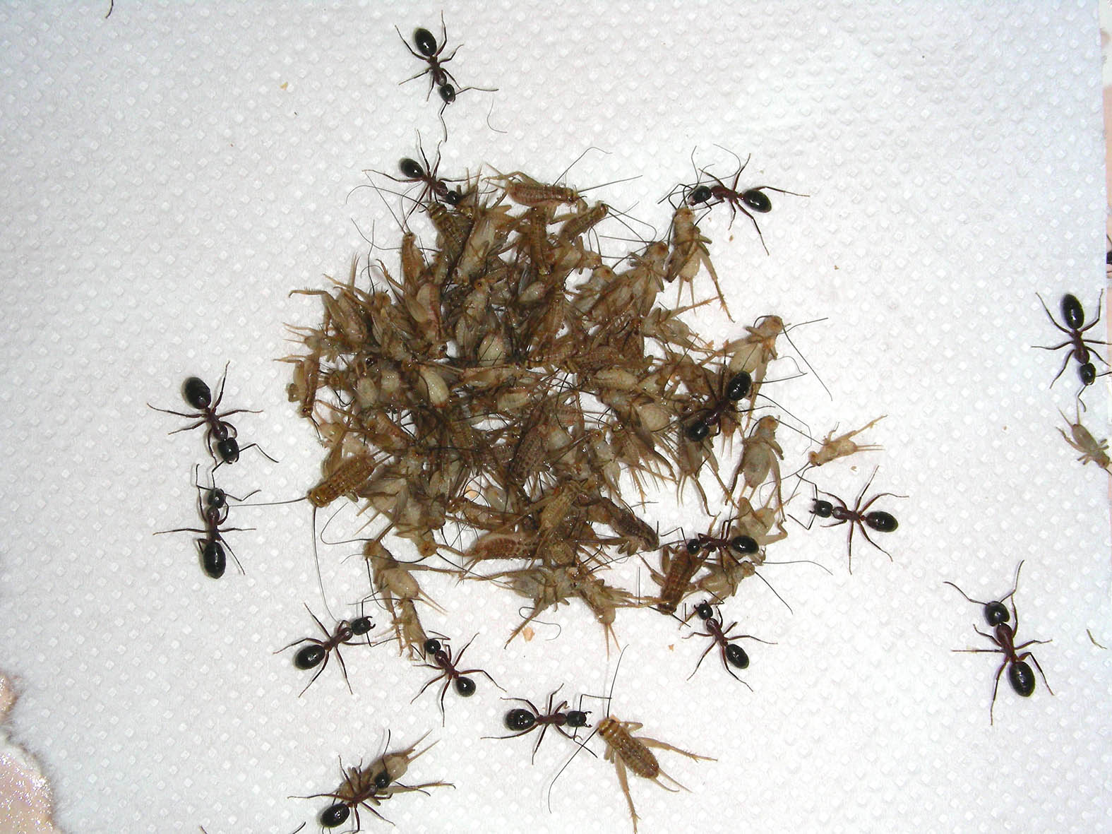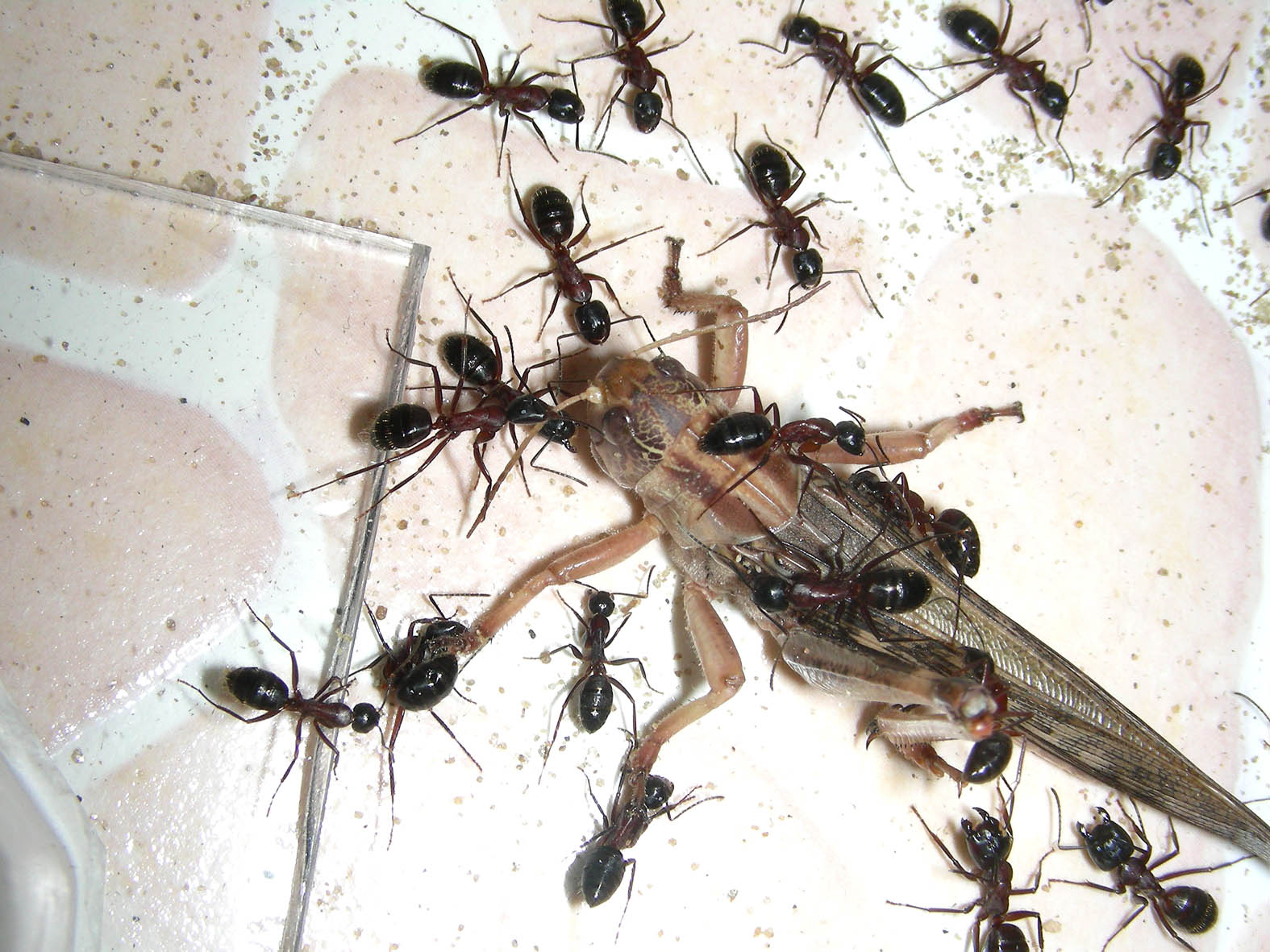 18.03.2011 Gab ihnen in den letzten Tagen immer wieder Insekten hinein die sie alle komplett verwendeten. Heute waren es kleinere Insekten und zwar 90 Essigfliegen - mit denen sie aber bis zum Abend (bis auf ein paar wenige) nichts anfangen konnten - deshalb wieder entfernt. Hoffe ich merke mir das die Camponotus nichts mit den Essigfliegen anfangen können.