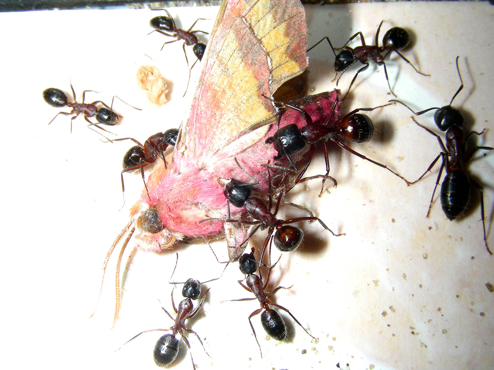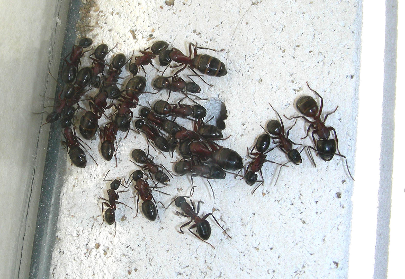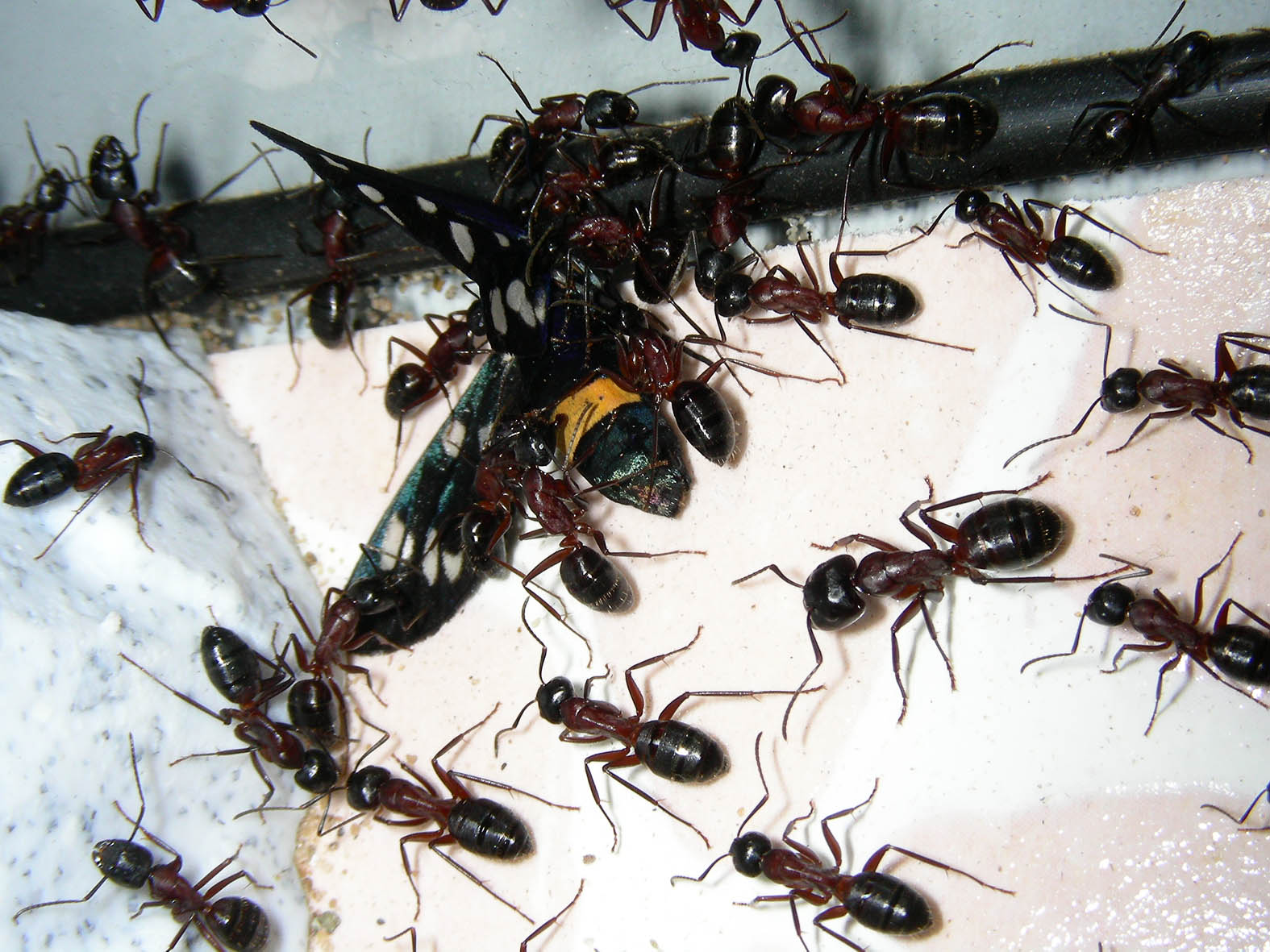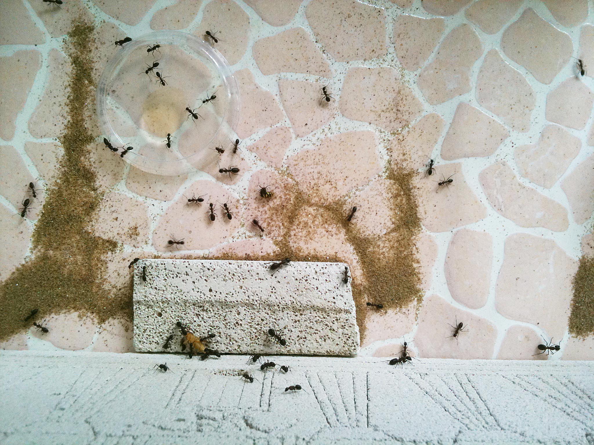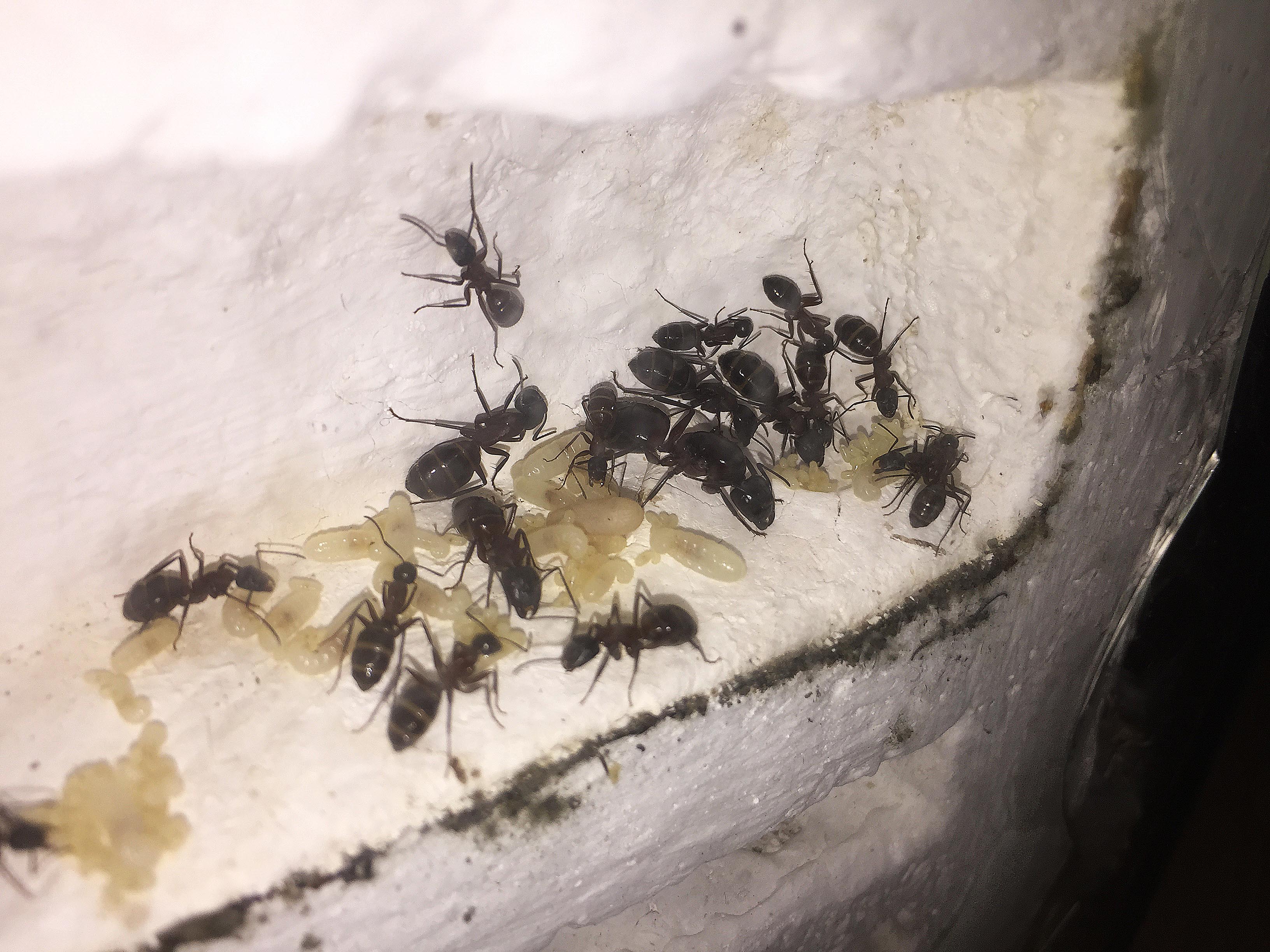 18.03.2011 Gab ihnen in den letzten Tagen immer wieder Insekten hinein die sie alle komplett verwendeten. Heute waren es kleinere Insekten und zwar 90 Essigfliegen - mit denen sie aber bis zum Abend (bis auf ein paar wenige) nichts anfangen konnten - deshalb wieder entfernt. Hoffe ich merke mir das die Camponotus nichts mit den Essigfliegen anfangen können.