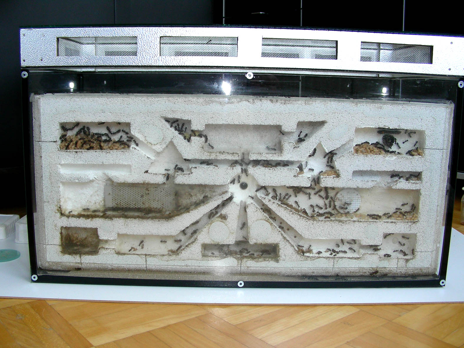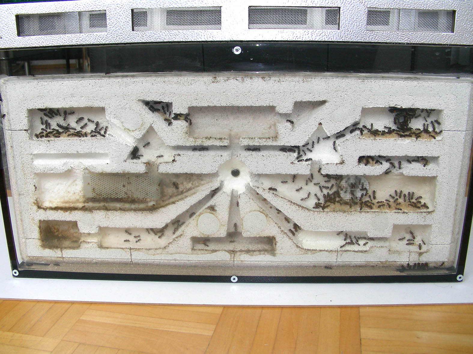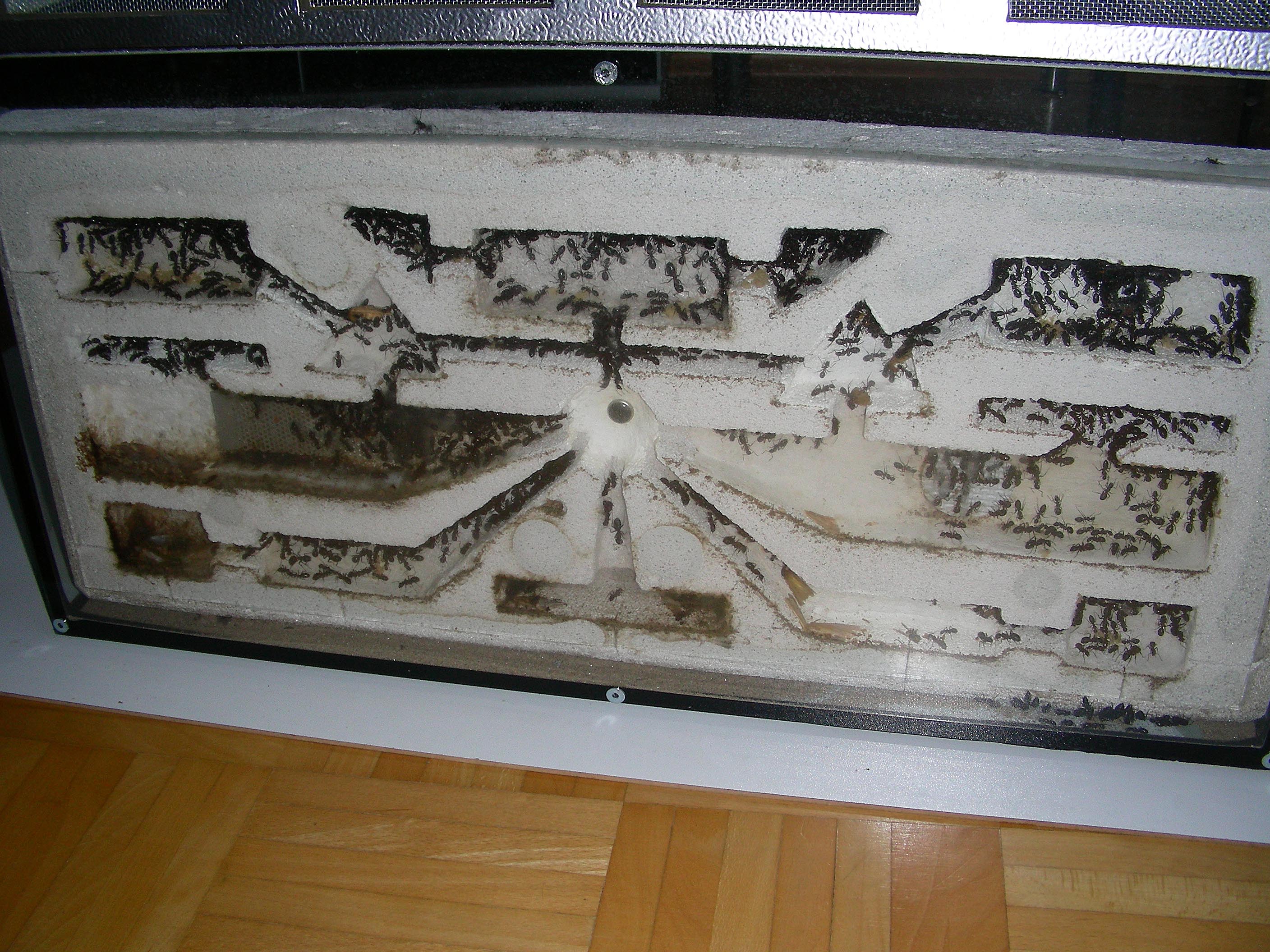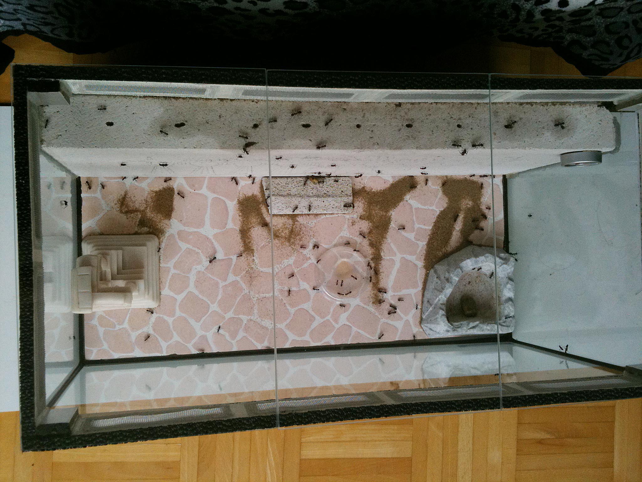 13.03.2011 Heute war schon eine größere Ansammlung von Arbeiterinnen in der Arena - deshalb hab ich das Formikarium vom Balkon meiner Mutter wieder zu mir in die Wohnung geholt. Die ersten Stunden bei offenem Fenster stehen gehabt. Das ganze Formikarium dann wieder ordentlich Grund gereinigt. Die letzten Tage hatte es draußen immer um die 15 bis sogar 18°C - deshalb