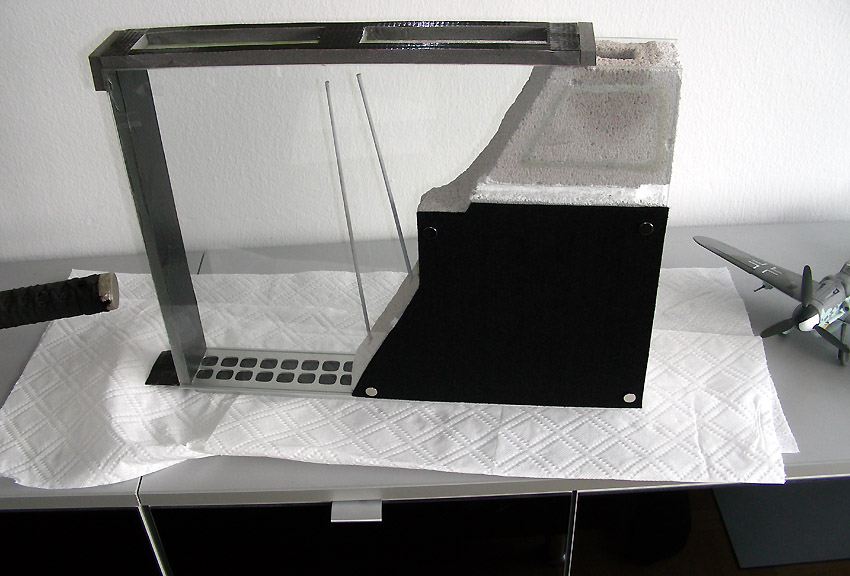 8.10.2010 Heute 2 1/2 Stunden gebraucht für das einfügen der Stangen, Bau der Basis mit dem Schiebemechanismus und der Verbindung von Basis und Glaskompunente mit YTONG. Dann auch noch die Einklemmstutzen für die Abeckung gemacht.