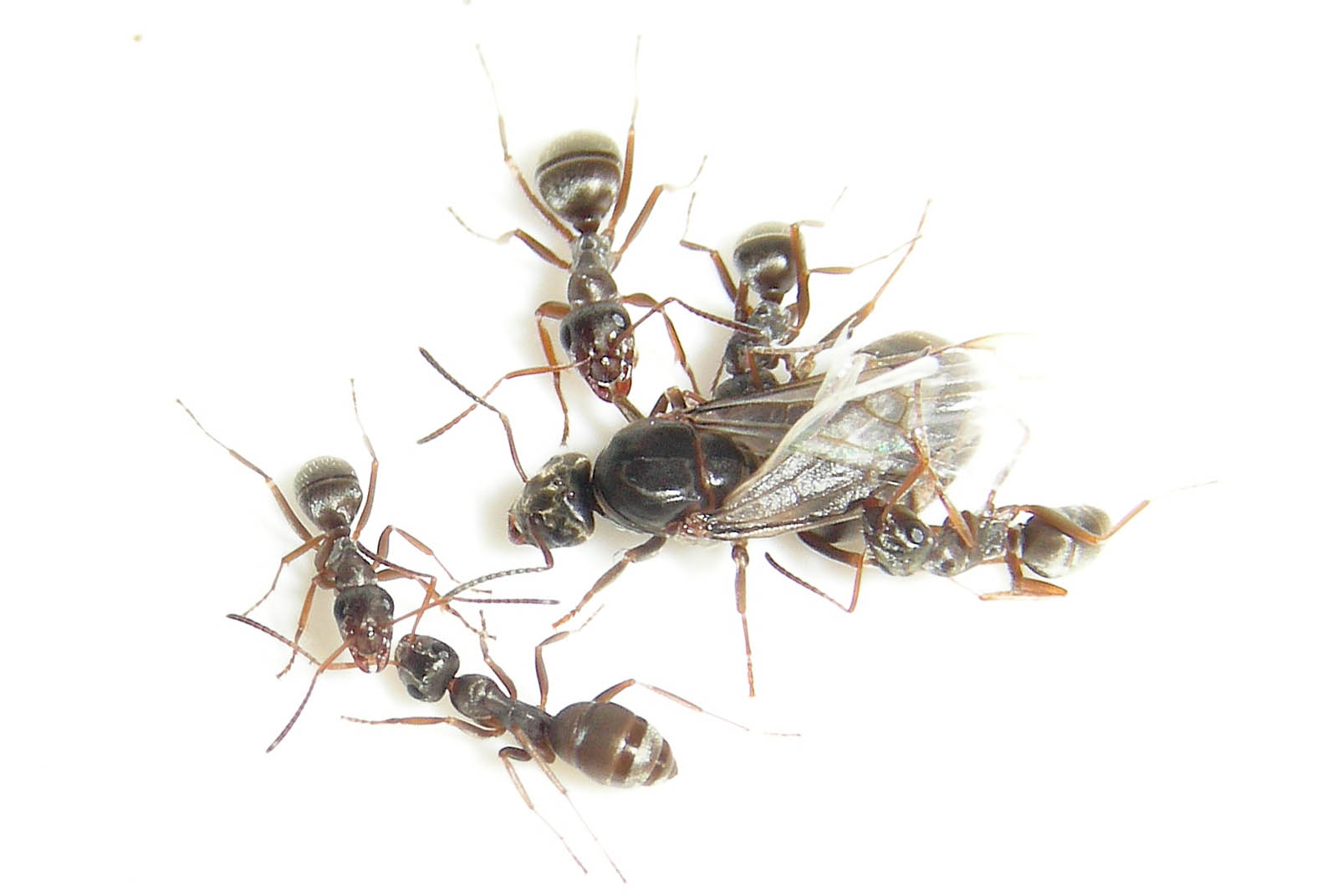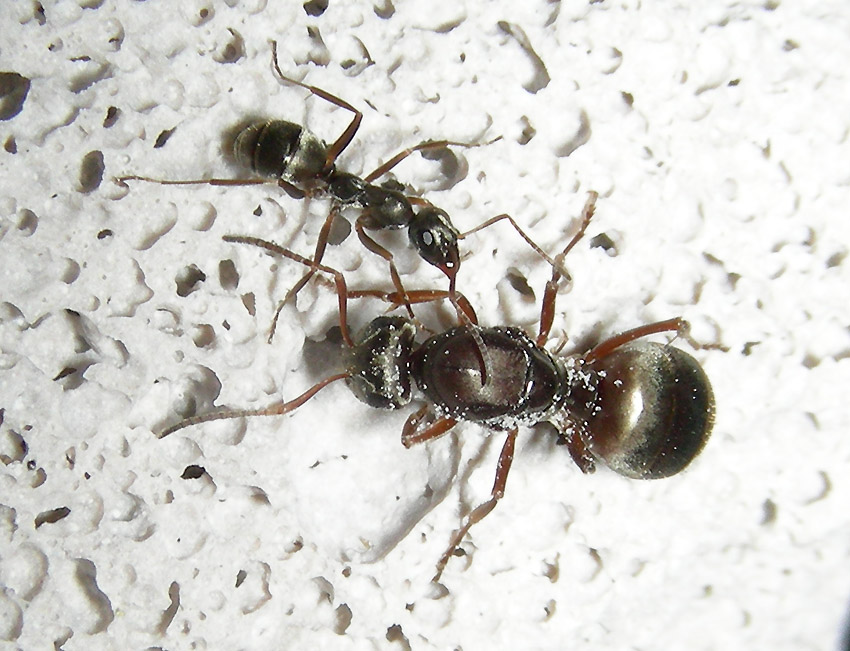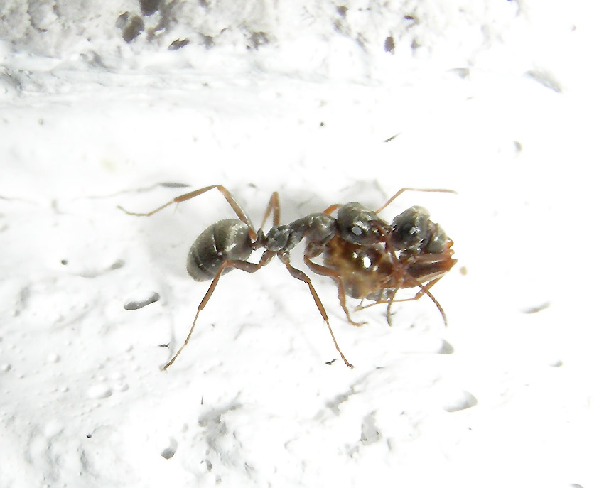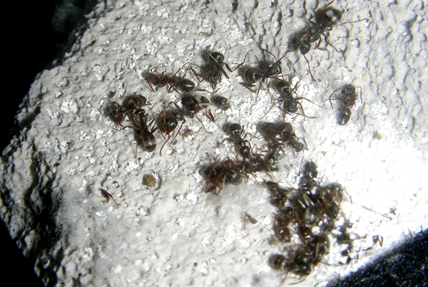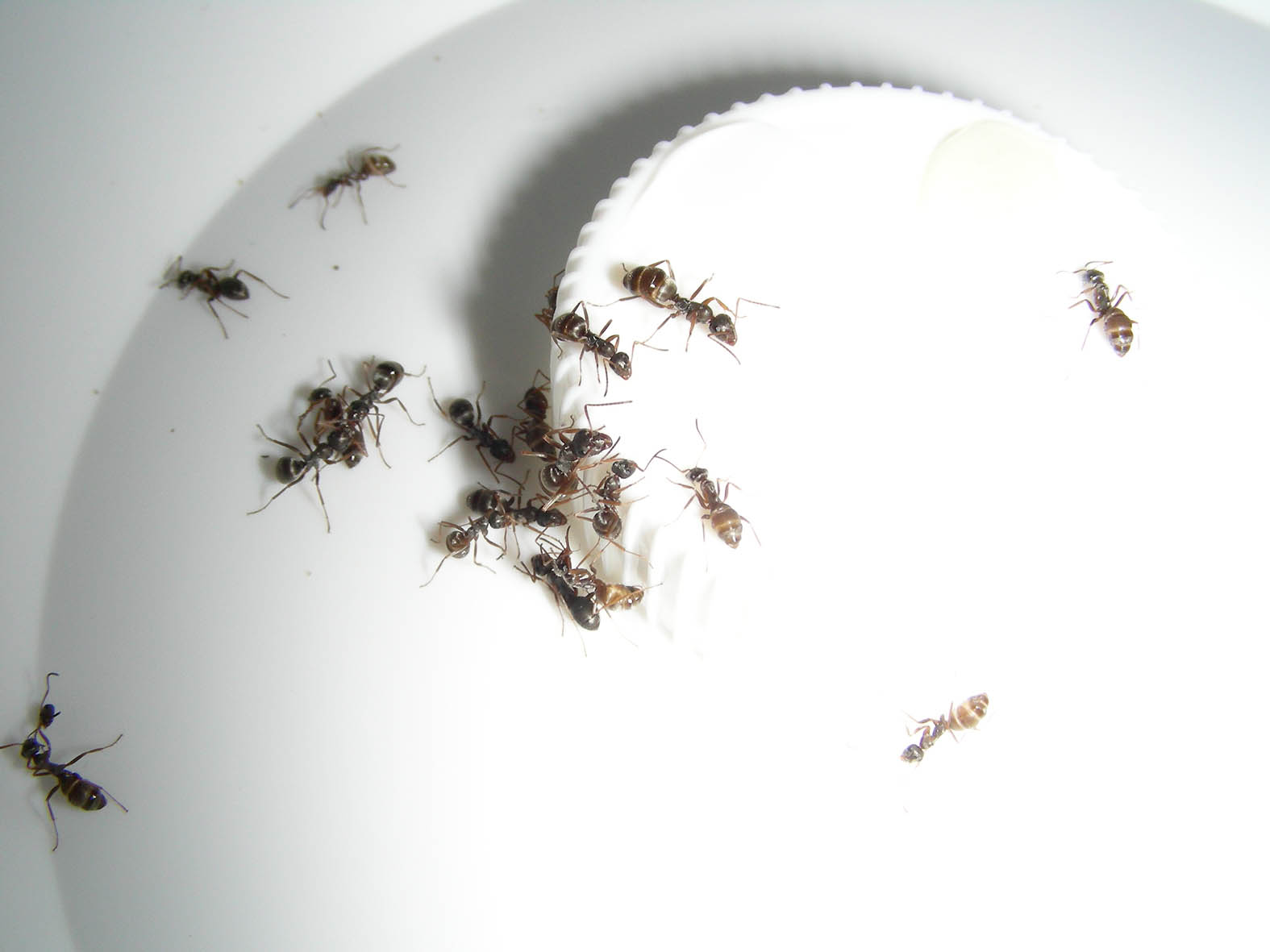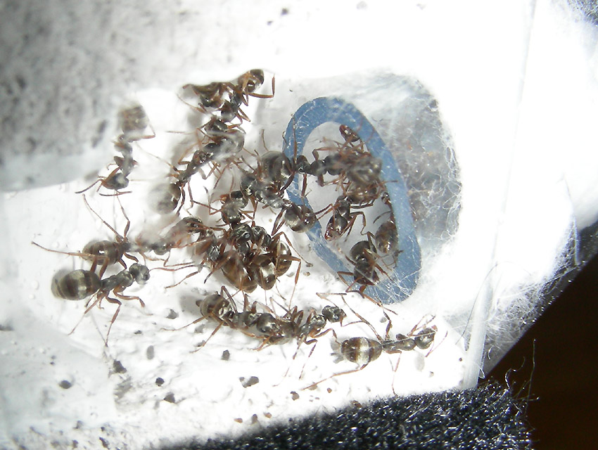 31.05.2011 Gab ihnen eine neue weisse Arena und gab die andere Weg - hin und wieder wurden Ausbruchversuche durch die Uhuklebepads unternommen in die sie einfach Löcher bissen. Heute gab ich als Versuch 7 Lasius fuliginosus Arbeiterinnen hinein die ich beim spazieren fand. Wollte wissen ob die Formica wirklich so reagieren wie geschildert. Zuerst griffen die Formica an - waren aber bald von etwas getroffen, dass sie planlos umher irren ließ mit verzogenen Fühlern. Die L. fuliginosus liefen dann so gut wie ungehindert umher - sogar in den Schlauch rein und die Formica waren durch die paar Arbeiterinnen komplett verwirrt worden! Doch das sonderbarste Ergebnis dieses Versuches kommt noch! DieKönigin der Formica wurde plötzlich von etlichen Arbeiterinnen an den Beinen und einem Fühler festgehalten!! Erst Stunden später hielt nur noch eine Arbeiterin die Königin am Fühler fest und diese Arbeiterin wurde auch von einer anderen Arbeiterin am Bein gehalten. Ich weiß nicht wieso sie ihre Königin festhielten - aber der Königin ging es später gut und sie lief wieder frei umher in den Kammern. Ich vermute die Formica wollten sie schützen indem sie sie festhielten, aufdass sie den vermeintlichen starken Angriffern der L. fuliginosus nicht zum Opfer fiel. Das die 7 L. fuliginosus aber nie in das Formikarium eindrangen war wohl egal. Später spülte ich den Schlauch aus, was ein paar Opfer unter den F. cunicularia forderte und entdeckte erst später eine neue Sonderbarkeit. Meine Formica haben die Arena ein paar Tage lang nicht betreten obwohl ich sie ausgewaschen habe. Vermutlich hatten sie immer noch großen Respekt vom vorhandenen Geruch von L. fuliginosus. Kann also die Überlegenheit dieses fuliginosus Sekrets in seiner Wirkung auf Formica bestätigen + das festhalten der Königin hinzufügen.