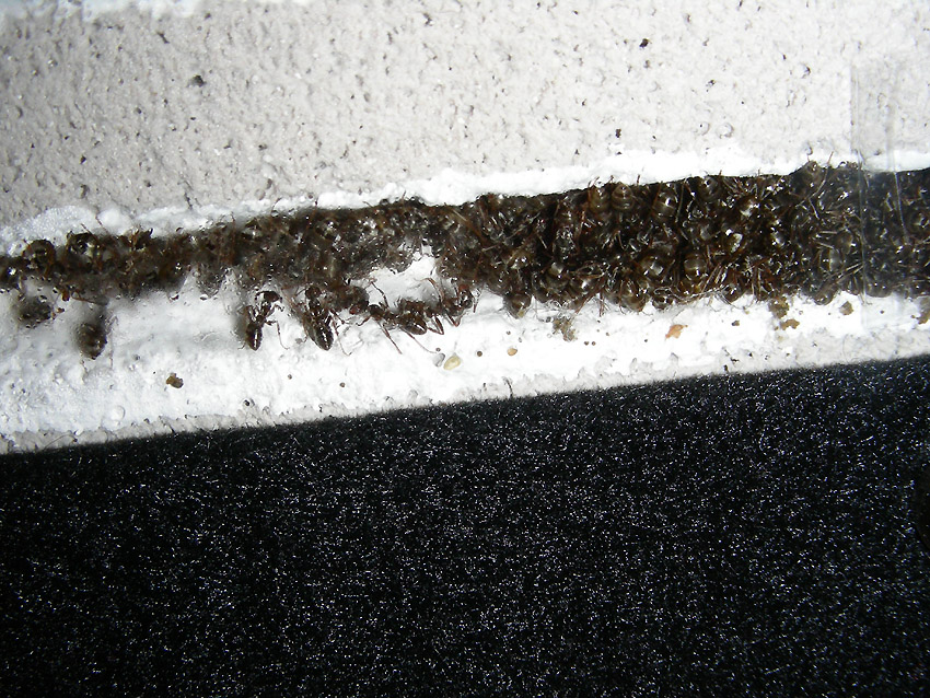 10.10.2010 Stand heute um 08:30 Uhr: über 200 Arbeiter im Formikarium - aber nur im Andockgang (nur ein paar Arbeiter sind wirklich im Formikarium drinnen, 600-700 Arbeiter halten sich im Schlauch auf und der Rest von 400-500 Arbeiterinnen in der Box... Startete um 08:50 einen Versuch sie die Box mittels Kühlakkus unattraktiv und das Formikarium mittels Fön attraktiv zu machen. Beendete diesen gescheiterten Versuch um 09:34 Uhr. Dann wollte ich sie noch mit Mehl etwas in Bedrängnis bringen - dann mit etwas Parfuem an den Seitenrand der Box nochmal versucht sie zum Umzug zu bewegen.