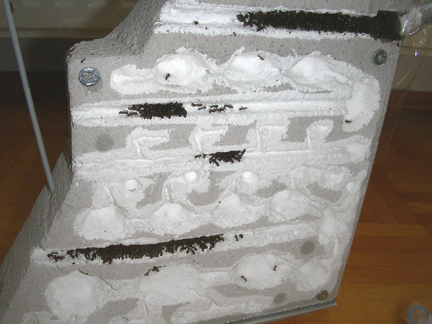 Leider musste ich feststellen, dass seitdem ich sie in die Box umgesiedelt habe um die 40 Arbeiter noch an den Folgen der Umsiedlung gestorben sind (innere Verletzungen?). Um 11:41 Uhr waren bereits 10 Arbeiter im Schlauch auf den Weg zu Slave III. Die erste Arbeiterin hat einen der Haupteingänge (den oberen) zum YTONG hinein entdeckt! Um 11:57 Uhr sind immerhin schon 30 Arbeiter am herum laufen - doch nur bis zum Anfang des YTONGs. Mittlerweile ist es 13:20 Uhr und nichts ging weiter... hab den Weg den Haupteingängen des YTONGs abgedunkelt, vielleicht hilft das. Um 13:40 musste ich meine Beobachtungen leider einstellen.