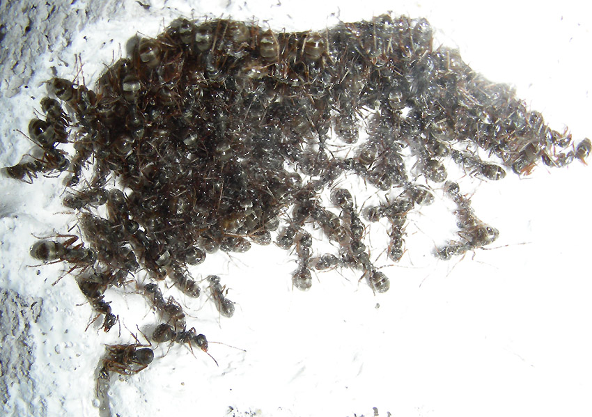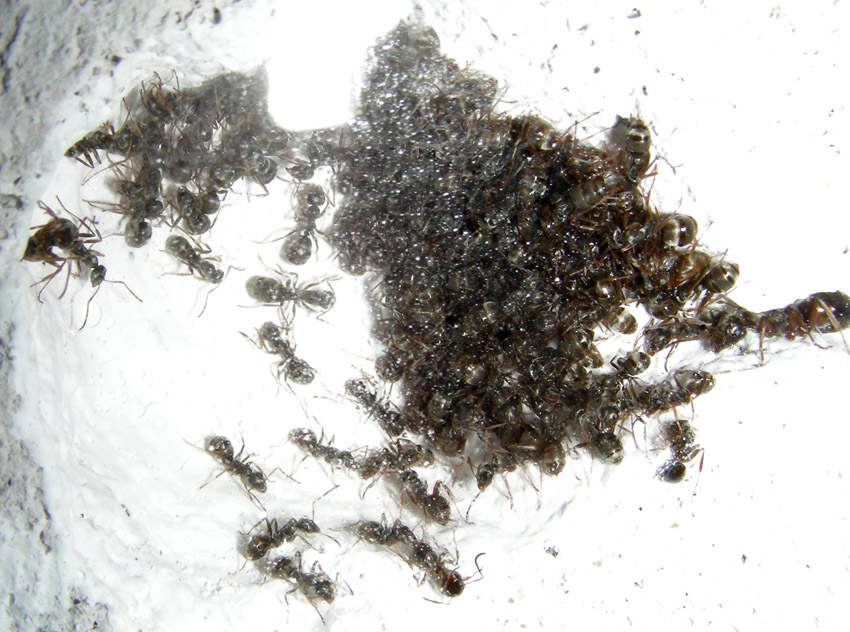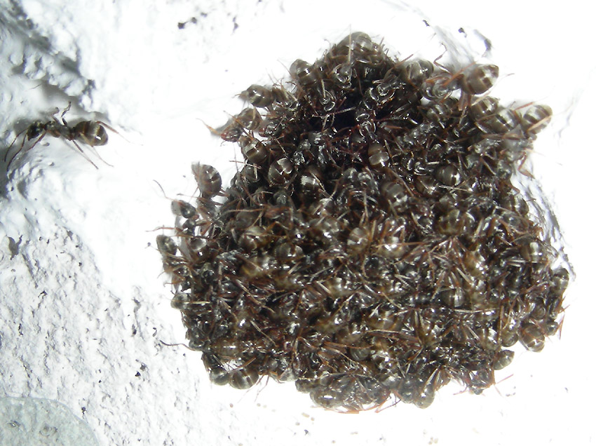 Doch bis auf eine Arbeiterin die hin und wieder eine Arbeiterin in den Schlauch zog - blieben alle Arbeiter ruhig. Ich hab dann den Schlauch abgedockt und es kam zu ersten Verlusten als einige den Boxrand stürmen wollten. Die im Schlauch klopfte ich dann in den Formikarium Zwischengang, wo sie nun auch blieben. Doch ich hatte da noch das Problem mit den restlichen 400-500 Arbeiterinnen! Einige waren mit Mehl beträufelt und ein paar Wassertropfen sollten sie reinigen. Doch da sich sich trotz Wasser nicht rührten und alle so eng zusammen geschlossen waren wurde das Mehl zu einer Art Teigfalle für viele Arbeiter!!! Ok Mehl und Wasser ist nicht gut zusammen auf einer Ameise. Versuchte dann noch mehrere Varianten wie ich sie zum Umzug bewegen konnte - immer wieder kam es zu ein paar Verlusten weil sie die Mehlsperre nun nach 3 Tagen in der Box doch schon überwinden konnten. Auch wollte ich sie irgendwie reinigen, damit das Mehl nicht gleich in mein neues Formikarium kommt und Schimmel bildet.