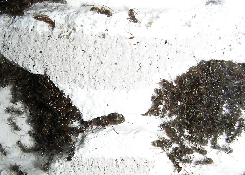 Aber letztendlich half alles nichts. Als erstes sortierte ich dieKönigin aus die in einer Traube aus Arbeiterinnen war. Sie kam dann als erstes über die obere Abdeckung in das neue Formikarium. Zuerst saß sie noch ganz eingeschüchtert am YTONG und wartete auf eine Arbeiterin - dich auch dann zum Glück kam und diese lotste sie dann (zog sie an den Mandibeln ) nach ein paar Minuten endlich in den oberen Haupteingang zum YTONG! Danach wurde es härte per Hand konnte ich nun die restlichen 400-500 Arbeiter rüber bringen über die obere Abdeckung und die Arbeiter waren gar nicht mehr schüchtern wie beim aussiedeln aus dem Formikarium Slave I - nein sie waren extrem aggressiv - auch wenn ihre Königin gar nicht mehr in ihrer Nähe war und so nahmen die Verluste zu um so länder diese extrem zeitaufwendige Umsiedlung auch dauerte. Um 16 Uhr etwa waren dann alle drüben und ich konnte mich ran machen die Verluste zu zählen die im Mehl lagen und die schon bei der Umsiedlung in der Box entstanden sind und die zwischen irgendwas kamen und zerdrückt wurden.