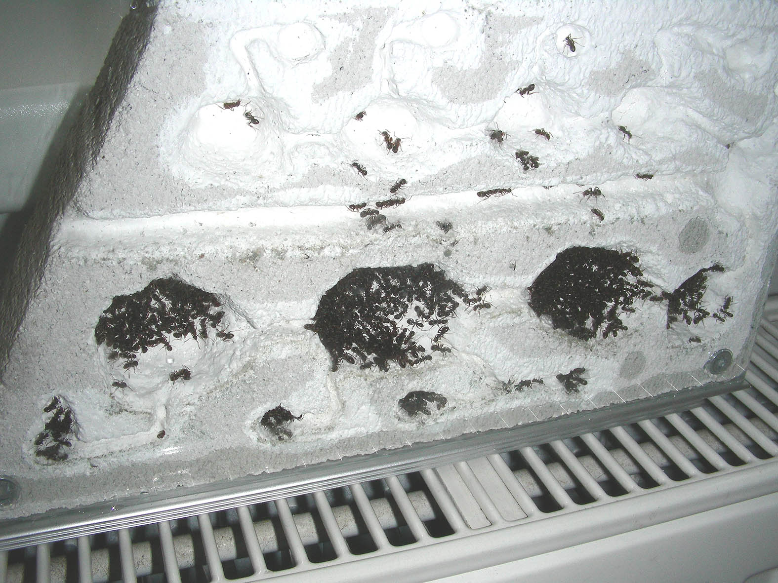14.12.2010 War um 19.30 Uhr heute wieder bei ihnen um nachzufeuchten. Sie haben genau 5 Grad Unterschied zur Aussentemperatur (draussen derzeit -2°C / im Formikarium +3°C) Sie sind alle in einer Art Starre aber am Leben, das erkannte ich an noch bewegenden Fühlern als Licht zu ihnen drang. Mussten in der Nacht auf heute -14°C Aussentemperatur aushalten. Hatte also im Formikarium sicher um die minus 9°C! Draußen in meinem Abfallschacht ganz an der Ecke stapelte sich aber ein Haufen an Leichen die wohl bisher verstorben sind. Der Haufen besteht aus den Leichen von der Umsiedelung die mitgenommen wurde, sowie aus Leichen die kurz danach verstorben sind und wohl auch aus neu verstorbenen. Kann sie aber erst im Frühjahr zählen. Aber nachdem Berg sind es ein paar Hundert Tote.