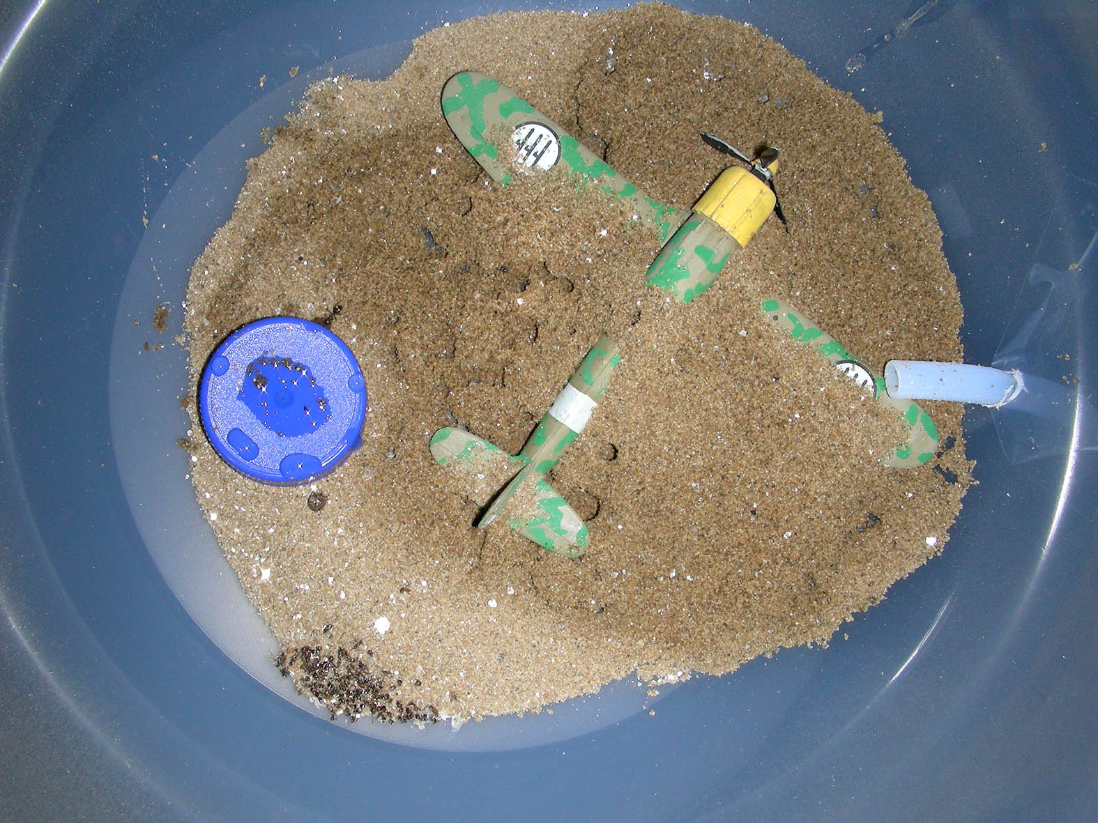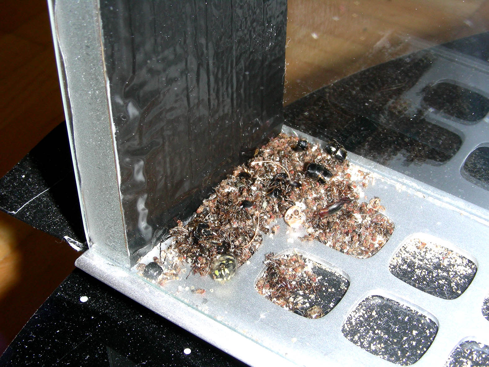 14.05.2011 Heute brauchte ich ein paarPuppen für ein Experiment - doch leider bekam ich nur 2 zu fassen - eine Arbeiterin ist mit der 3. weiter höher gelagerten Puppe abgerissen. Für das sie mit 0 Brut 2011 begonnen haben sie jetzt schon wieder ordentlich zugelegt (Formica cunicularia überwintert ohne jegliche Brut !). Blöderweise hab ich heute beim Staubsaugen den Netzstecker zu schnell rausgezogen und nicht das Formikarium in Sicherheit gebracht. So knallte der auf die Scheibe und hatte 2 Risse drin. Was muss ich als Mann auch Staub saugen?
