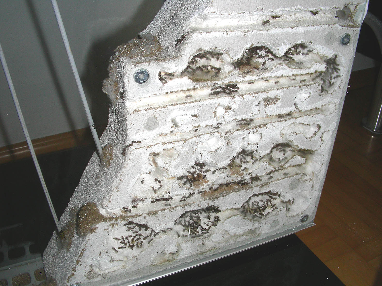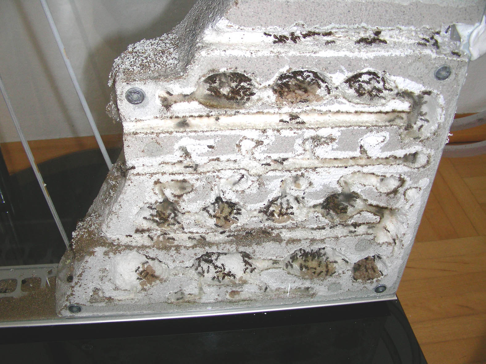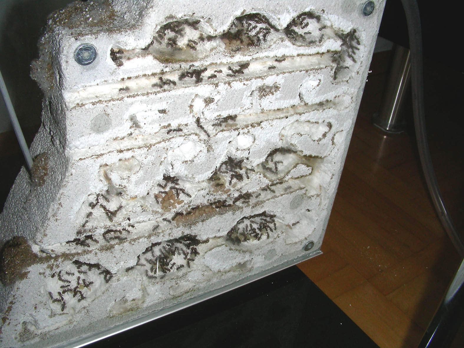 Juni 2011 Die neue Arena hat sich bis jetzt bestens bewehrt - auch wenn ich noch immer keine perfekte Abdeckung dafür habe und notgedrungen 2 transparente Sichthüllen drauf lege. Ihr Zahl hat sich stark vermehrt und ich werde einmal Aufgrund einiger Fotos eine Zählung durchführen müssen. DerKönigin geht es bestens und ist auch dank dem neuen YTONG Zuhause immer leicht auszumachen. Also ich würde nicht wieder eine uneinsichtige Ameienfarm bauen - damit ich dann die vorgänge im Nest nicht so genau beobachten kann. Was bei Formica aber immer der Fall ist, ist das sie gleich in Panik verfallen wenn man die Abdeckung ab nimmt. Beweisst auch wieder wie gut sie hell - dunkel unterscheiden können. Sie haben sich bis jetzt aber immer wieder Löcher durch die Uhuklebepads (Schlauchverbindung) getrieben und kamen hinaus.