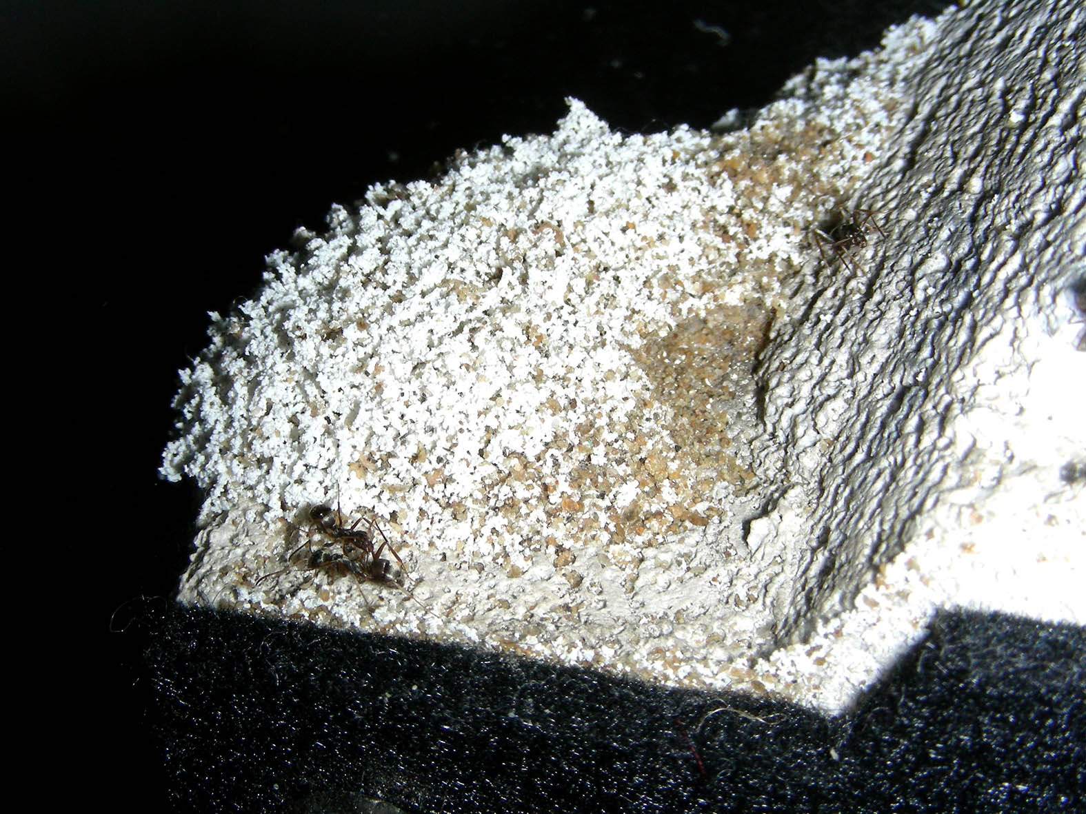 19.03.2011 Die Arbeiter bauen immer noch weiter im Arenasand nachdem ich diesen vor ein paar Tagen befeuchtet habe. Auch haben sie Sand runter in Formikarium getragen aber diesen nur unten auf die Aluschiene gelegt - die ist ihnen wohl zu kalt. Honigwasser wird auch weiter brav aufgenommen und ins Formikarium transportiert oder fleißige Arbeiterinnen damit gefüttert.