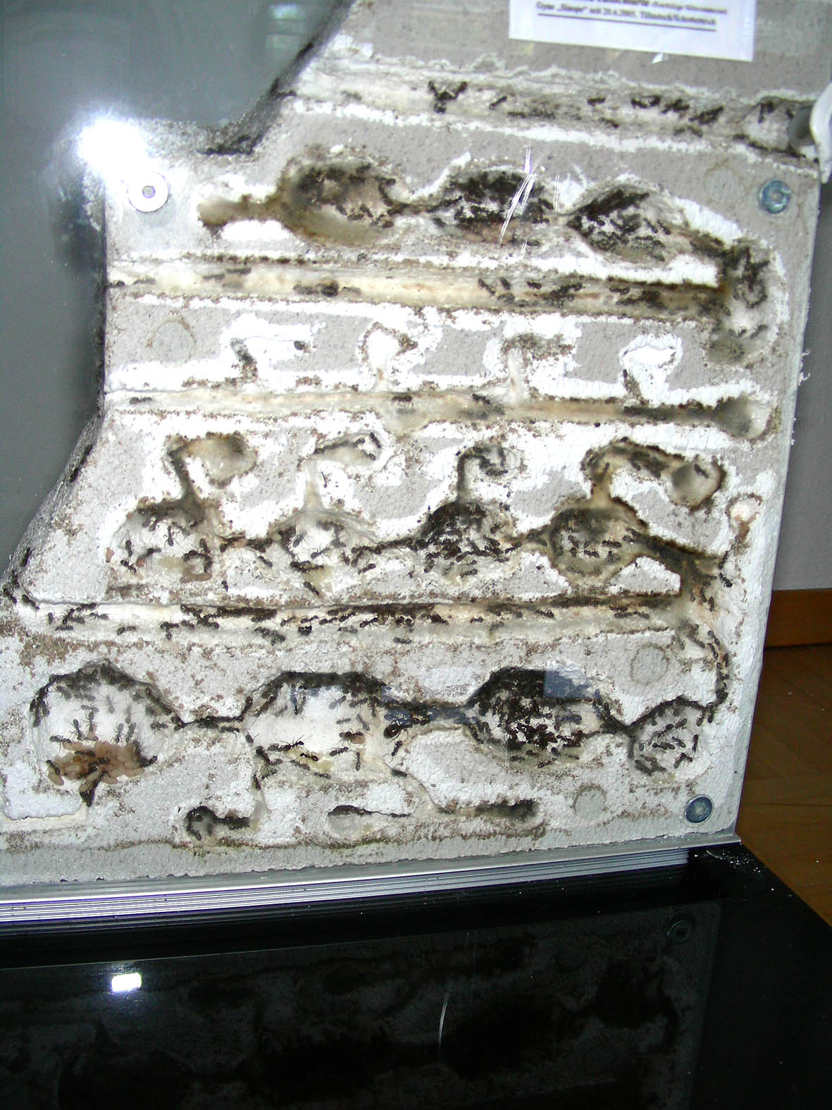 15.03.2011 Nachdem gestern noch alles ruhig war und ich immer wieder den Wassertank im YTONG aufgefüllt habe kam heute schon Bewegung in die Schläuche nachdem ich zuerst den Sand etwas in der Arena angefeuchtet habe. Sie begannen gleich mit Grabearbeiten und nahmen auch immer wieder Flüssignahrung auf. Auch angesaugte Arbeiterinnen wurden von der Arena zurück ins Formikarium getragen. Seitdem ich den ersten großen Leichenhaufen entfernt habe - sammeln sich wieder weitere Leichen die aus dem Nest getragen werden. Müssen schon wieder um die 40 Leichen sein die dort draußen über der Abfallentsorungsschiene liegen. Wenigstens diese Technik mit dem sauber halten des Formikariums klappt bis jetzt bestens - vor allem weil sie die Leichen wirklich dort plazieren wo ich nur die Schiene rausziehen muss und der Müll ist weg. Eier undLarven sind natürlich wie für Formica spec. typisch noch keine nach der Winterruhe vorhanden. Rein rechnerisch liegt ihre Zahl derzeit bei um die 900 Arbeiter. Waren schon mal 1300 Arbeiter vor dem Umzug doch mit den Verlusten durch Umzug und Winter gerechnet (die erst nach und nach nach draußen getragen wurden) die wohl gesamt ziemlich genau auf 400 Tote derzeit zu beziffern sind.