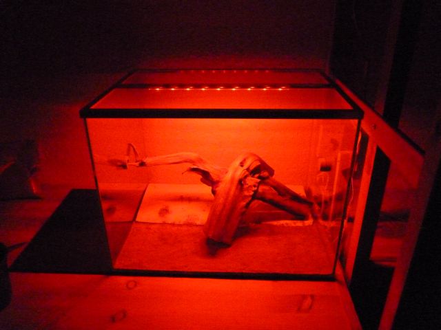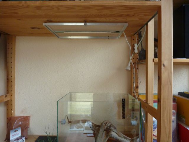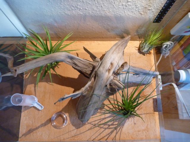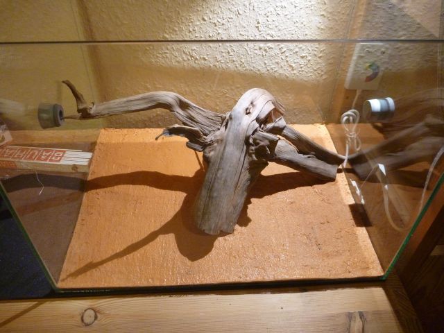 Wie man sehen kann habe ich auch Totholz im Becken, dieses dient dafür die Lauffläche zu vergrößern. Häufig biete ich darauf Futter an, außerdem habe ich noch getrocknete Pflanzen aus der Natur verwendet: