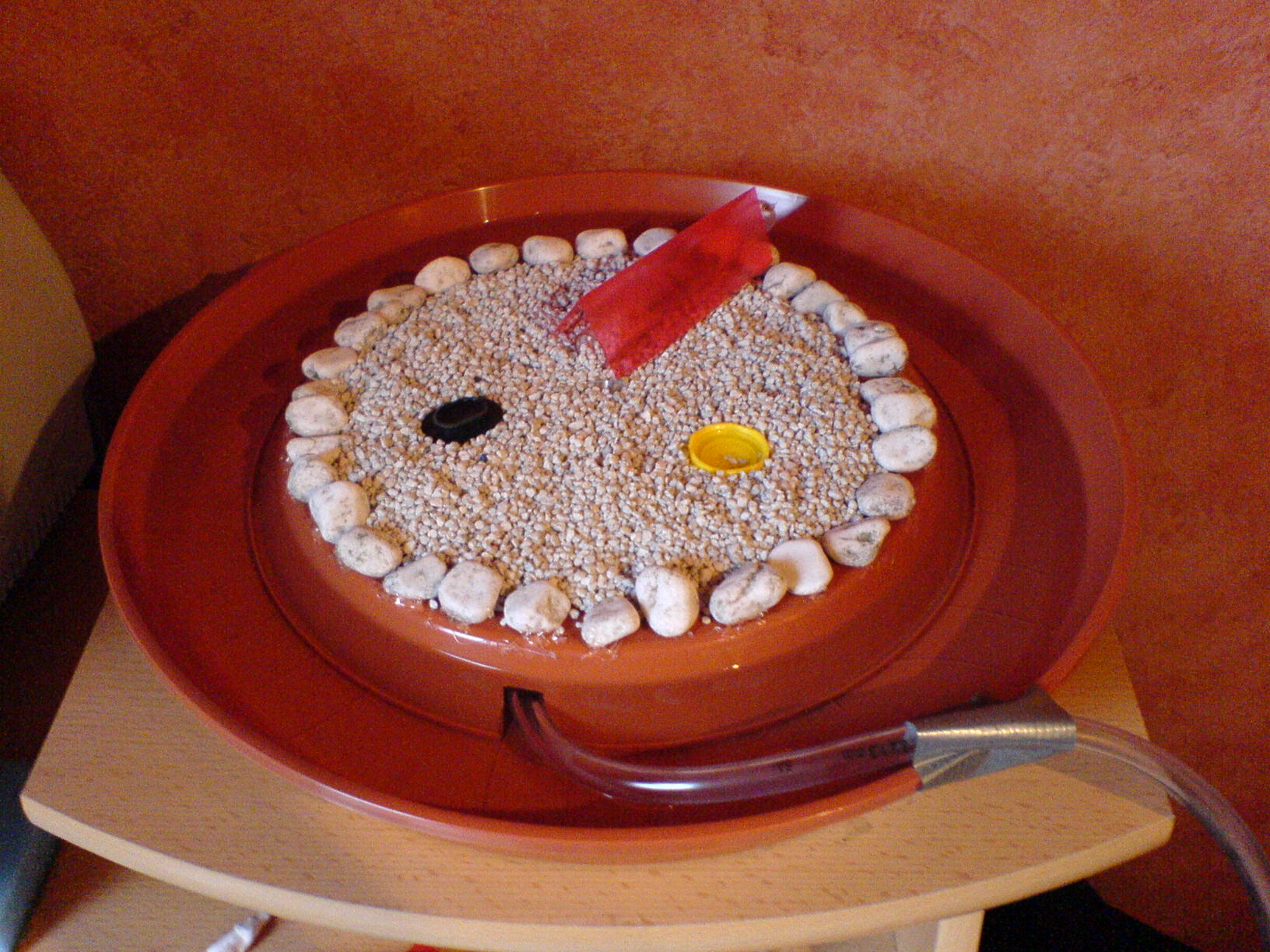 Das Inselbecken habe ich aus zwei Blumentopfuntersetzern gemacht. In der Mitte der Insel, ist ein Eingang, der bald beim Ytongnest enden soll.