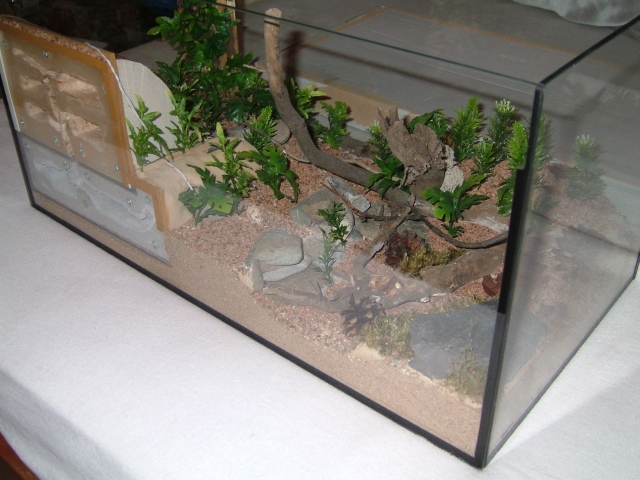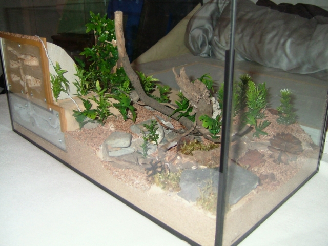 Erstmal die Bodenplatte einlegen und den beabsichtigten Spalt zw. Bodenplatte und Scheibe mit Aquariumsand aufgefüllt.