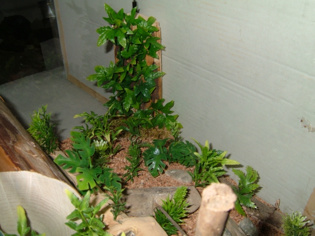 Nun klebte ich alle Plastikpflanzen ein und trug nochmals eine dünnere Schicht eingefärbtem Innenraumspachtel auf - ebenso arbeitete ich durch entsprechendes Auftragen eine möglichst spaltfreien Sitz des teilversenkten Nestes aus.