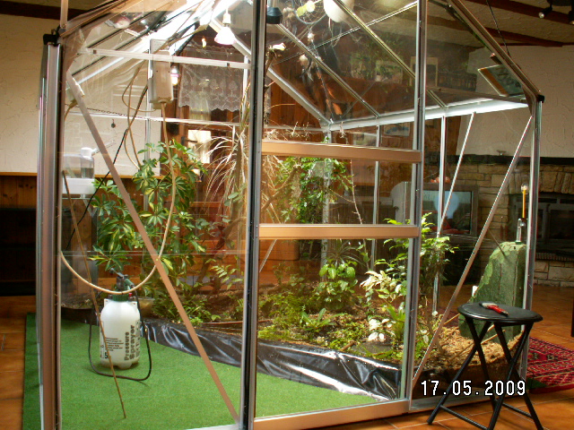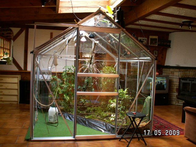 Verwendet wurde ein kleines Treibhaus, Grundfläche 2x2 Quadratmeter, ebenso hoch. Natürlich ist ein solches nicht für die Ameisenhaltung konstruiert, so musste an zahllosen Stellen für "Dichtheit" gesorgt werden. Schwierig war das insbesondere bei der Schiebetür, dann hatte ich eine Idee mit selbstklebenden Türbesen. Funktioniert hervorragend.