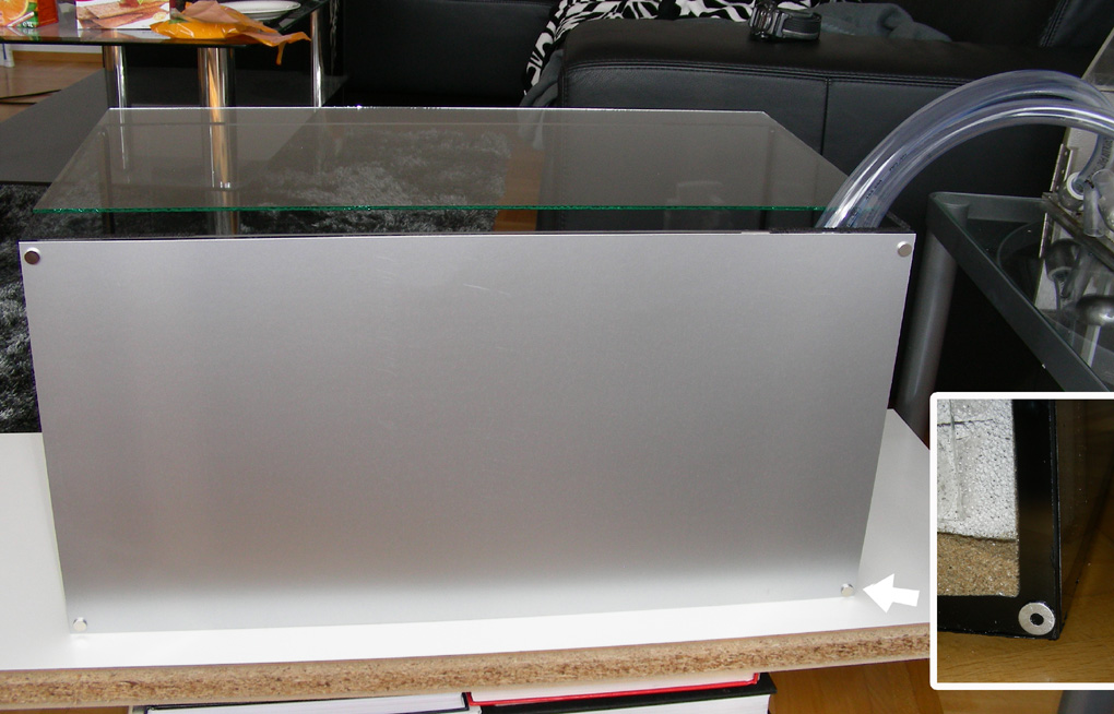 Die Eckkanten des Glasbeckens wurden mit je 2 100x5mm Antirutschgummis durch Uhu Alleskleber erhöht und das Abdeckglas aufgesetzt. Durch Eckkanten entsteht so ein langer 1,5mm breiter Luftschlitz an allen vier Seiten.